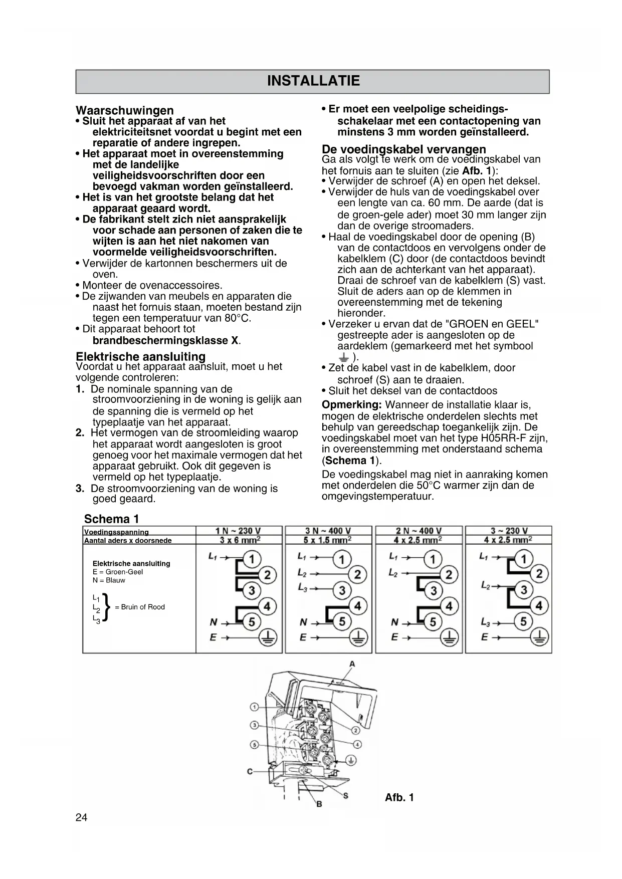 - Er moet een veelpolige scheidings- schakelaar met een contactopening van minstens 3 mm worden geïnstalleerd. De voedingskabel vervangen Ga als volgt te werk om de voedingskabel van het fornuis aan te sluiten (zie Afb. 1):