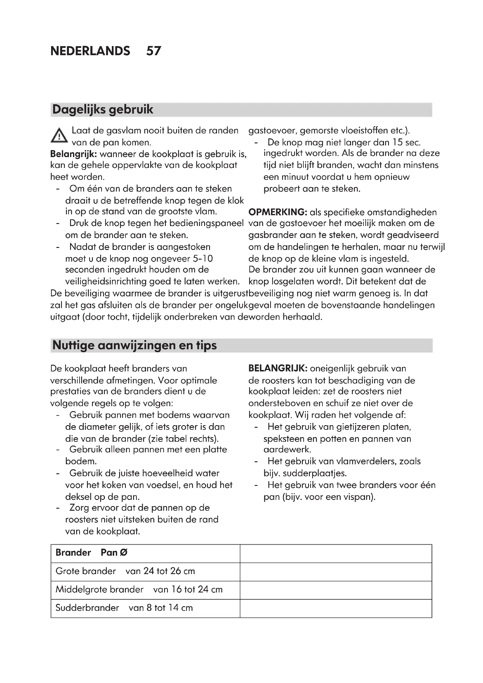 Symbolen Geslotenrondje Gaskraan gesloten Gro tevlam Maximale opening/ gastoevoer Kleinevlam Minimale opening,ofwel beperkte gastoevoerNEDERLANDS 57 Laatdegasvlamnooitbuitenderanden vandepankomen. Belangrijk:wanneerdekookplaatisgebruikis, kandegeheleoppervlaktevandekookplaat heetworden. - Oméénvandebrandersaantesteken draaitudebetreffendeknoptegendeklok inopdestandvandegrootstevlam. - Drukdeknoptegenhetbedieningspaneel omdebranderaantesteken. - Nadatdebranderisaangestoken moetudeknopnogongeveer5-10 secondeningedrukthoudenomde veiligheidsinrichtinggoedtelatenwerken. Debeveiligingwaarmeedebranderisuitgerust zalhetgasafsluitenalsdebranderperongeluk uitgaat(doortocht,tijdelijkonderbrekenvande gastoevoer,gemorstevloeistoffenetc.). - Deknopmagnietlangerdan15sec. ingedruktworden.Alsdebrandernadeze tijdnietblijftbranden,wachtdanminstens eenminuutvoordatuhemopnieuw probeertaantesteken. OPMERKING:alsspeciekeomstandigheden vandegastoevoerhetmoeilijkmakenomde gasbranderaantesteken,wordtgeadviseerd omdehandelingenteherhalen,maarnuterwijl deknopopdekleinevlamisingesteld. Debranderzouuitkunnengaanwanneerde knoplosgelatenwordt.Ditbetekentdatde beveiligingnognietwarmgenoegis.Indat gevalmoetendebovenstaandehandelingen wordenherhaald. Dagelijksgebruik Dekookplaatheeftbrandersvan verschillendeafmetingen.Vooroptimale prestatiesvandebrandersdientude volgenderegelsoptevolgen: - Gebruikpannenmetbodemswaarvan dediametergelijk,ofietsgroterisdan dievandebrander(zietabelrechts). - Gebruikalleenpannenmeteenplatte bodem. - Gebruikdejuistehoeveelheidwater voorhetkokenvanvoedsel,enhoudhet dekselopdepan. - Zorgervoordatdepannenopde roostersnietuitstekenbuitenderand vandekookplaat. BELANGRIJK:oneigenlijkgebruikvan deroosterskantotbeschadigingvande kookplaatleiden:zetderoostersniet onderstebovenenschuifzenietoverde kookplaat.Wijradenhetvolgendeaf: - Hetgebruikvangietijzerenplaten, speksteenenpottenenpannenvan aardewerk. - Hetgebruikvanvlamverdelers,zoals bijv.sudderplaatjes. - Hetgebruikvantweebrandersvooréén pan(bijv.vooreenvispan). Nuttigeaanwijzingenentips Brander PanØ Grotebrander van24tot26cm Middelgrotebrander van16tot24cm Sudderbrander van8tot14cmNEDERLANDS 58 Trekdestekkeruithetstopcontact voordatuonderhoudverricht. - Allegeëmailleerdeenglazen onderdelenmoetenwordengereinigd metwarmwatereneenneutraal reinigingsmiddel. - Alskalkhoudendwaterofagressieve reinigingsmiddelentelangincontact blijvenmetderoestvrijstalen oppervlakken,kunnenervlekken ontstaan.Gemorstvoedsel(water,saus, kofe)moetverwijderdwordenvoordat hetkanopdrogen. - Reinigdekookplaatmetwarmwateren eenneutraalreinigingsmiddelendroog hemafmeteenzachtedoekofzeem. Verwijderaangekoektvuilmetspeciale reinigingsmiddelenvoorroestvrijstalen oppervlakken. OPMERKING:maakroestvrijstaalalleen schoonmeteenzachtedoekofspons. - Gebruikgeenschurendeofbijtende producten,productenopbasisvan chloorofschuursponsjes. - Gebruikgeenstoomreinigers. - Gebruikgeenbrandbareproducten. - Zorgervoordatergeenzureof basischesubstantieszoalsazijn, mosterd,zout,suikerofcitroensapopde kookplaatachterblijven. REINIGINGVANDEONDERDELENVANDE KOOKPLAAT - Roosters,branderdekselsenbranders kunnenwordenverwijderdomze schoontemaken. - Waszemetdehandafinwarmwater meteenniet-schurendreinigingsmiddel. Verwijdereventuelevoedselresten zorgvuldigencontroleerofde branderopeningennietverstoptzijn. - Afspoelenengoedafdrogen - Plaatsdebrandersende branderdekselsweergoedteruginde daarvoorbestemdeopeningen. - Controleerbijhetterugplaatsenvande roostersofhetgebiedomdepannen neertezetteninlijnismetdebrander. Bijmodellenmetelektrische ontstekingsbougieseneenbeveiliging moethetuiteindevandebougiegoed schoongemaaktworden,omervoor tezorgendatdekookplaatgoedkan functioneren. Controleerdezeonderdelenregelmatig, enmaakzeindiennodigschoonmeteen vochtigedoek.Alseraangekoektvoedsel opzit,moetditwordenverwijderdmeteen tandenstokerofeennaald. OPMERKING:omschadeaanhet elektrischeontstekingsmechanismete voorkomenmagditnietwordengebruikt wanneerdebrandersnietinhunbehuizing zitten. OnderhoudenreinigingNEDERLANDS 59 Probleem Mogelijkeoorzaken Oplossing Deelektrischeontstekingwerkt niet Erisgeenelektrische voeding Controleerofdestekkerin hetstopcontactzitenofhier stroomopstaat. Debranderontsteektniet Misschienstaatde gaskraandicht Controleerofdegaskraan openstaat Degasvlambrandt onregelmatig Misschienisde branderkroonverstopt metetensresten Maakdebranderkroon schoonvolgensde reinigingsaanwijzingenomer zekervantezijndathijniet verstoptismetetensresten. Watmoetudoenals... VoordatudeKlantenservicebelt: