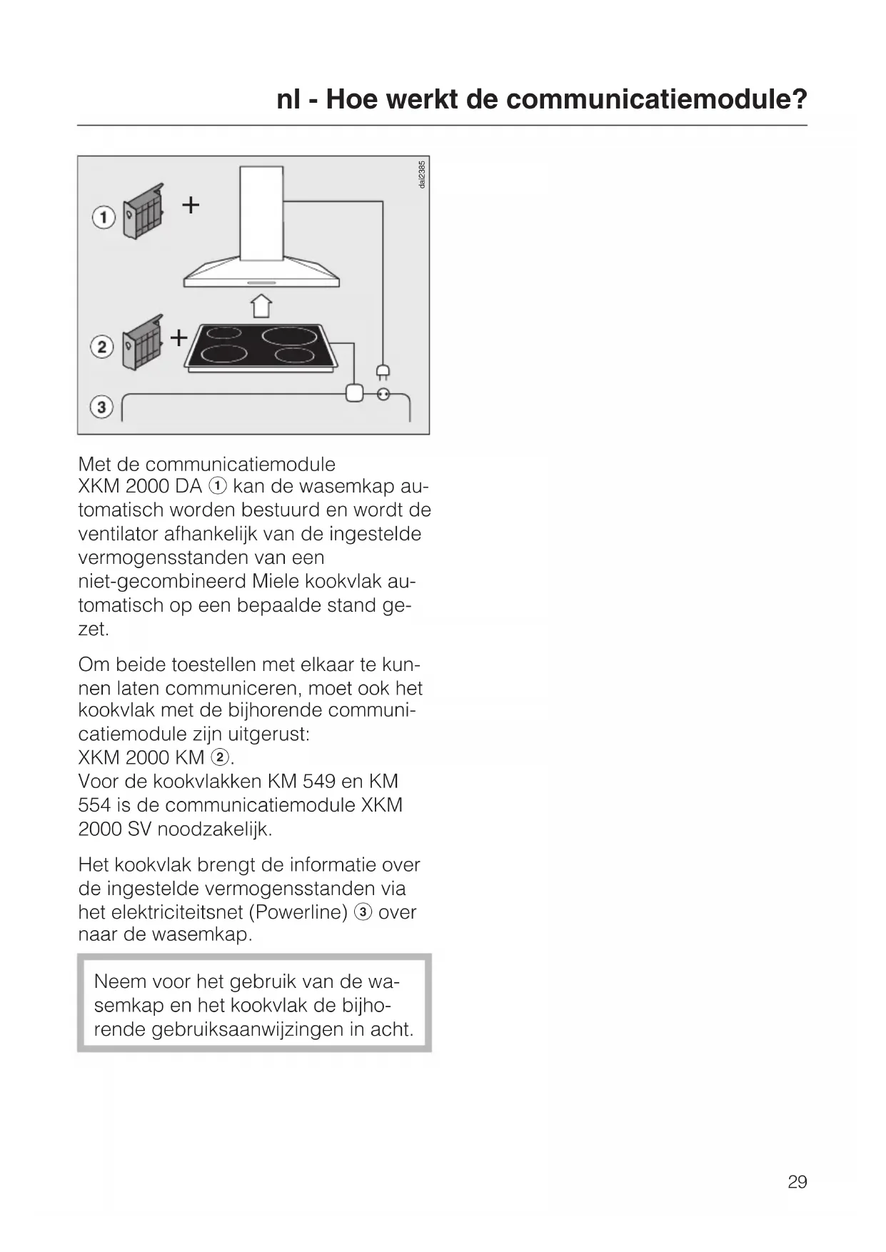 dai2385De communicatiemodule XKM 2000 DA wordt geleverd met een montagekoker waarin de module wordt geschoven en een aansluitsnoer met stekker om de communicatiemodule aan te sluiten op de besturingseenheid van de wasem- kap. Het geheel wordt in de wasemkap vlak bij de ventilator gemonteerd en aange- sloten op de besturing van de wasem- kap. In de bijgevoegde montagehandleiding vindt u meer informatie over de monta- ge en de elektrische aansluiting. De communicatiemodule mag uit- sluitend door een elektricien worden aangesloten. Hij is precies op de hoogte van de voorschriften die van toepassing zijn en houdt zich daar strikt aan. nl - Hoe werkt de communicatiemodule?