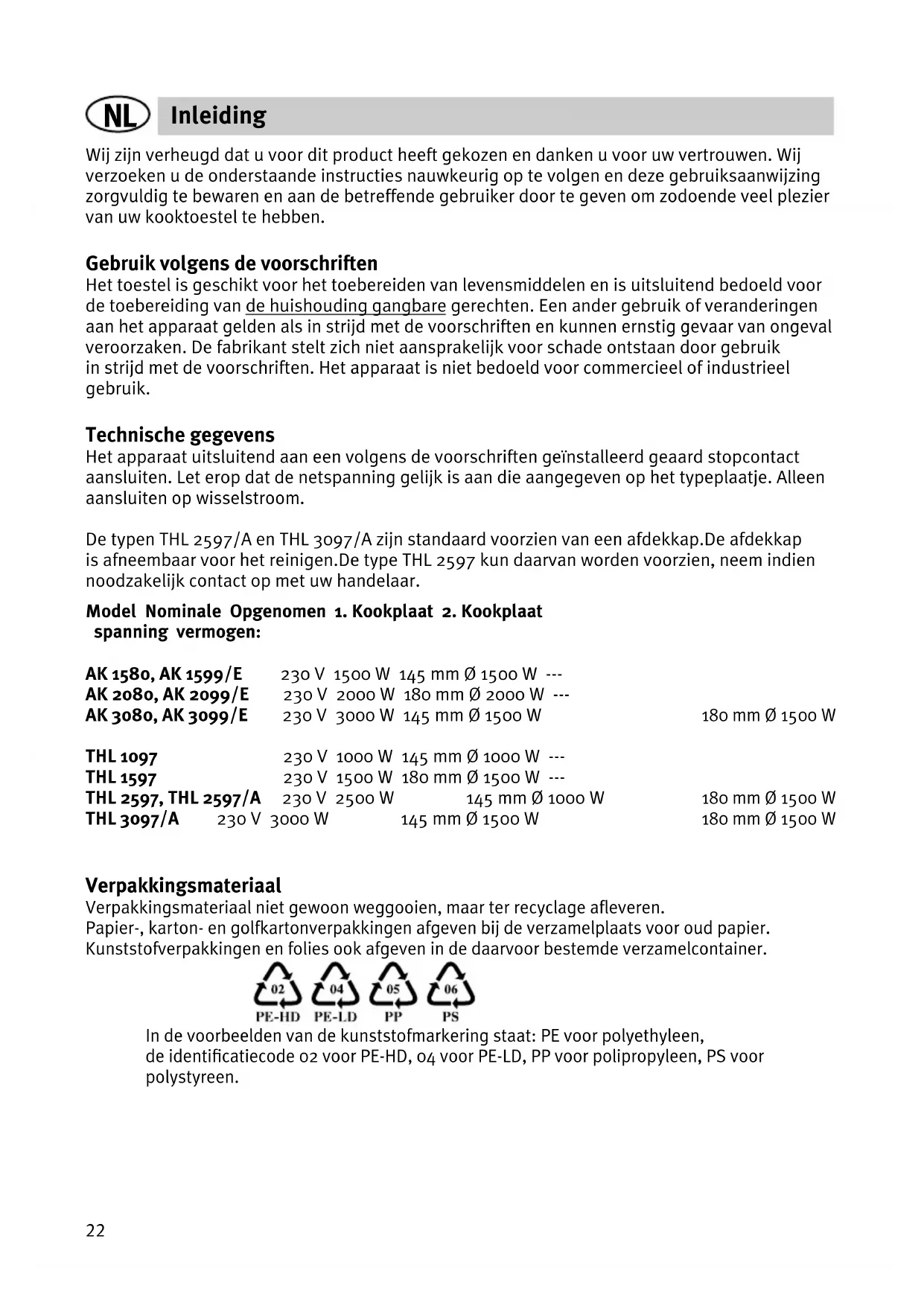 - L‘apparecchio non si deve mai pulire con getto di vapore.22 Wij zijn verheugd dat u voor dit product heeft gekozen en danken u voor uw vertrouwen. Wij verzoeken u de onderstaande instructies nauwkeurig op te volgen en deze gebruiksaanwijzing zorgvuldig te bewaren en aan de betreffende gebruiker door te geven om zodoende veel plezier van uw kooktoestel te hebben. Gebruik volgens de voorschriften Het toestel is geschikt voor het toebereiden van levensmiddelen en is uitsluitend bedoeld voor de toebereiding van de huishouding gangbare gerechten. Een ander gebruik of veranderingen aan het apparaat gelden als in strijd met de voorschriften en kunnen ernstig gevaar van ongeval veroorzaken. De fabrikant stelt zich niet aansprakelijk voor schade ontstaan door gebruik in strijd met de voorschriften. Het apparaat is niet bedoeld voor commercieel of industrieel gebruik. Technische gegevens Het apparaat uitsluitend aan een volgens de voorschriften geïnstalleerd geaard stopcontact aansluiten. Let erop dat de netspanning gelijk is aan die aangegeven op het typeplaatje. Alleen aansluiten op wisselstroom. De typen THL 2597/A en THL 3097/A zijn standaard voorzien van een afdekkap.De afdekkap is afneembaar voor het reinigen.De type THL 2597 kun daarvan worden voorzien, neem indien noodzakelijk contact op met uw handelaar. Model Nominale Opgenomen 1. Kookplaat 2. Kookplaat spanning vermogen: AK 1580, AK 1599/E 230 V 1500 W 145 mm Ø 1500 W --- AK 2080, AK 2099/E 230 V 2000 W 180 mm Ø 2000 W --- AK 3080, AK 3099/E 230 V 3000 W 145 mm Ø 1500 W 180 mm Ø 1500 W THL 1097 230 V 1000 W 145 mm Ø 1000 W --- THL 1597 230 V 1500 W 180 mm Ø 1500 W ---