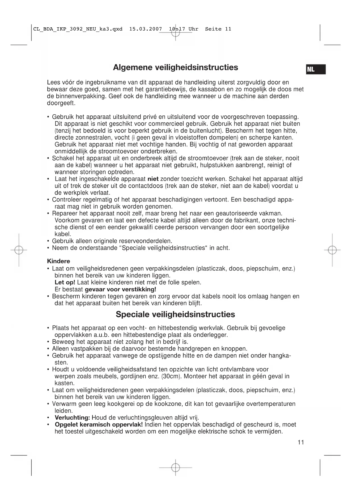 - Opgelet keramisch oppervlak! Indien het oppervlak beschadigd of gescheurd is, moet het toestel uitgeschakeld worden om een mogelijke elektrische schok te vermijden. CL_BDA_IKP_3092_NEU_ka3.qxd 15.03.2007 10:17 Uhr Seite 11NL
