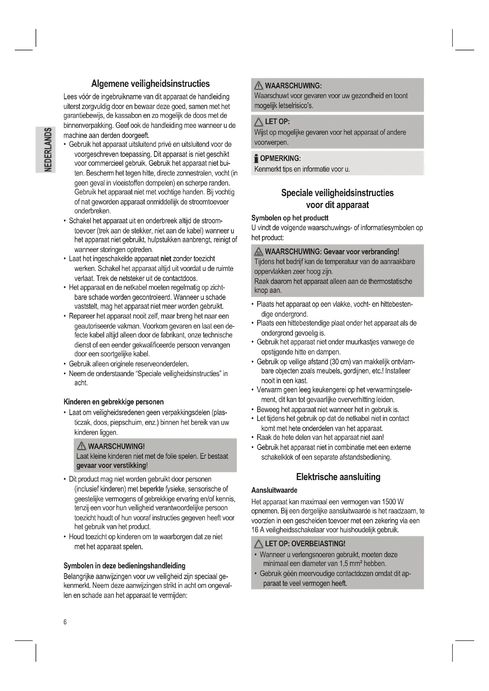 - Neem de onderstaande “Speciale veiligheidsinstructies” in acht. Kinderen en gebrekkige personen