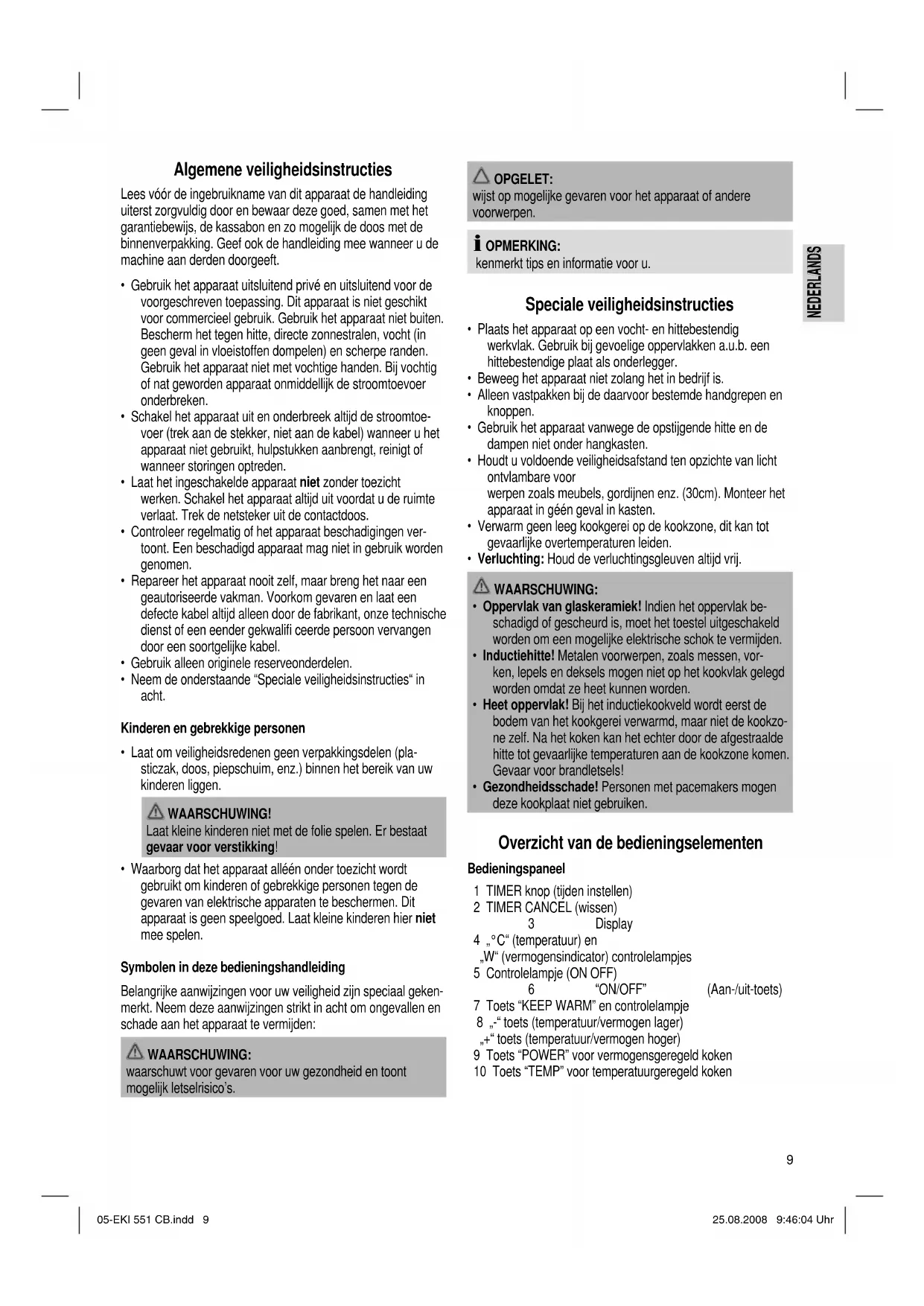- Gezondheidsschade! Personen met pacemakers mogen deze kookplaat niet gebruiken. Overzicht van de bedieningselementen Bedieningspaneel 1 TIMER knop (tijden instellen) 2 TIMER CANCEL (wissen) 3 Display 4 „°C“ (temperatuur) en „W“ (vermogensindicator) controlelampjes 5 Controlelampje (ON OFF) 6 “ON/OFF” (Aan-/uit-toets) 7 Toets “KEEP WARM” en controlelampje 8 „-“ toets (temperatuur/vermogen lager) „+“ toets (temperatuur/vermogen hoger) 9 Toets “POWER” voor vermogensgeregeld koken 10 Toets “TEMP” voor temperatuurgeregeld koken 05-EKI 551 CB.indd 905-EKI 551 CB.indd 9 25.08.2008 9:46:04 Uhr25.08.2008 9:46:04 Uhr10 NEDERLANDS NEDERLANDS Algemeen Koken met inductie Tijdens het koken met inductie ontstaat de hitte door middel van magnetische krachten pas wanneer een ketel of een pan met magnetiseerbare bodem op een ingeschakelde kookzone ge- plaatst wordt. Daarbij wordt enkel de bodem van het kookgerei verwarmd, maar niet de kookzone zelf. Onder het glaskeramiek bevindt zich de inductiespoel. Indien zij met stroom verzorgd wordt ontstaat een magneetveld dat in de bodem van de ketel wervelingen genereert. Hierdoor wordt de bodem verwarmd. Dat bespaart energie omdat de warmte uitsluitend daar ontstaat waar zij nodig is. Welke kookgerei kan ik gebruiken? Voor inductiekookplaten zijn ketels resp. ketelbodems uit ma- gnetiseerbaar materiaal nodig. Kookgerei wordt vandaag met de indicatie „geschikt voor inductiefornuis“ uitgerust. In principe kunt u alle ijzer bevattende pannen en potten gebru- iken. Of deze wel degelijk magnetiseerbaar zijn wordt tijdens een korte test duidelijk gemaakt. Plaats de ketel in kwestie op de kookzone. Wanneer na de selectie van de kookfunctie en de inschakeling van het toestel een signaal weerklinkt dan is de ketel niet geschikt. OPMERKING: Omwille van veiligheidsredenen schakelt het toestel na enkele seconden naar de stand-by modus. Deze materialen mogen evenmin als kookgerei gebruikt worden: Klei, glas of aluminium. Deze ketels mag u niet gebruiken: Ketels met ronde bodem Ketels wiens dia- meter op de bodem kleiner is dan 12cm. Ketels die op voeten staan. Elektrische aansluiting Aansluitingswaarde De kookplaat kan in totaal een vermogen van 2000 W opnemen. Bij deze aansluitingswaarde is een gescheiden toevoerleiding met een beveiliging via een 16A veiligheidsschakelaar voor huishoudelijk gebruik aanbevolen. WAARSCHUWING VOOR OVERBELASTING! Gebruik geen verlengleidingen of meervoudige contactdozen omdat het apparaat hierdoor teveel vermogen krijgt. Aansluiting
