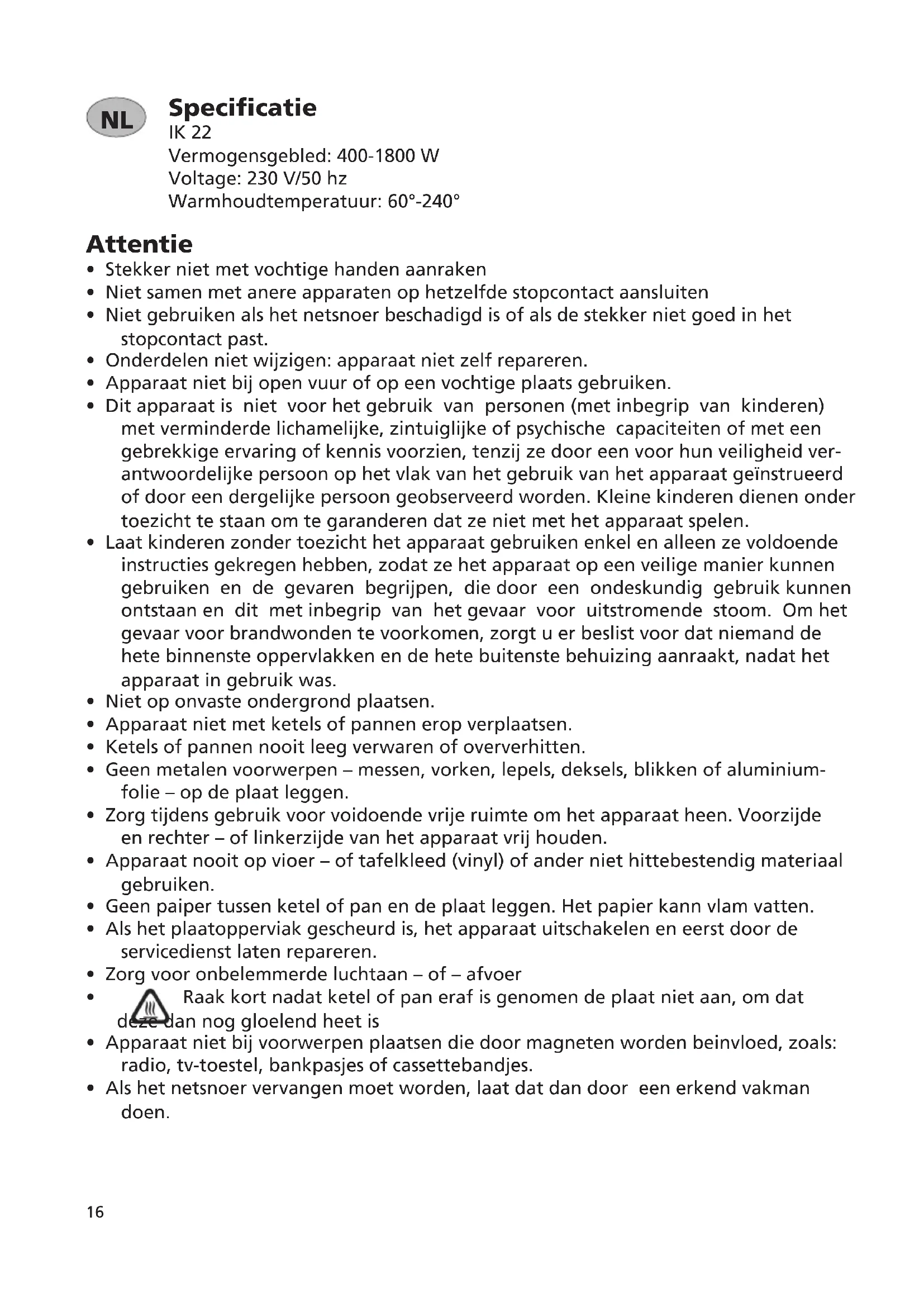 Specificatie IK 22 Vermogensgebled: 400-1800 W Voltage: 230 V/50 hz Warmhoudtemperatuur: 60°-240° Attentie