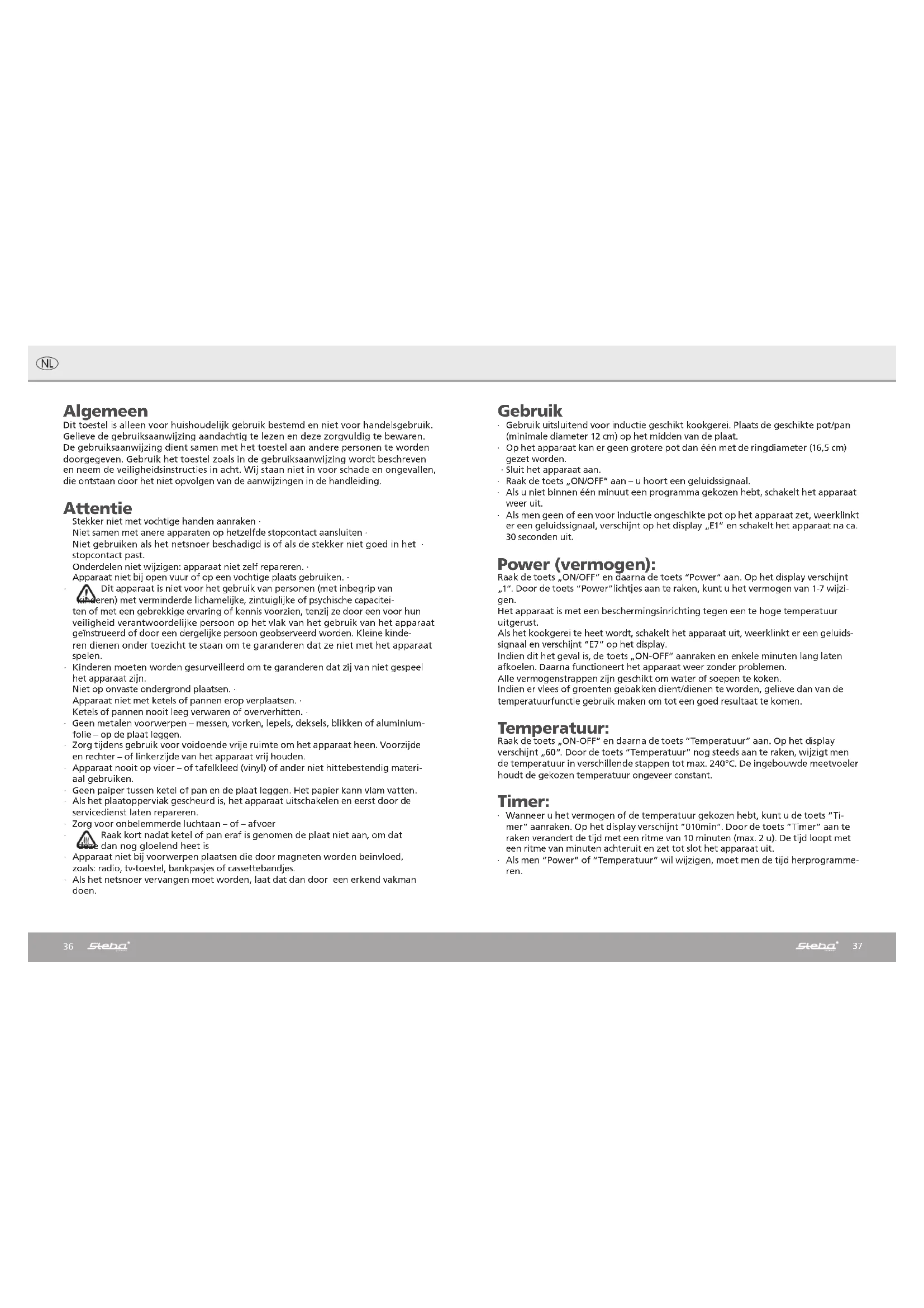 - Geen metalen voorwerpen – messen, vorken, lepels, deksels, blikken of aluminium- ∙ folie – op de plaat leggen. Zorg tijdens gebruik voor voidoende vrije ruimte om het apparaat heen. Voorzijde ∙ en rechter – of linkerzijde van het apparaat vrij houden. Apparaat nooit op vioer – of tafelkleed (vinyl) of ander niet hittebestendig materi- ∙ aal gebruiken. Geen paiper tussen ketel of pan en de plaat leggen. Het papier kann vlam vatten. ∙ Als het plaatopperviak gescheurd is, het apparaat uitschakelen en eerst door de ∙ servicedienst laten repareren. Zorg voor onbelemmerde luchtaan – of – afvoer ∙ ∙ Raak kort nadat ketel of pan eraf is genomen de plaat niet aan, om dat deze dan nog gloelend heet is Apparaat niet bij voorwerpen plaatsen die door magneten worden beinvloed, ∙ zoals: radio, tv-toestel, bankpasjes of cassettebandjes. Als het netsnoer vervangen moet worden, laat dat dan door een erkend vakman ∙ doen. Gebruik Gebruik uitsluitend voor inductie geschikt kookgerei. Plaats de geschikte pot/pan ∙ (minimale diameter 12 cm) op het midden van de plaat. Op het apparaat kan er geen grotere pot dan één met de ringdiameter (16,5 cm) ∙ gezet worden. Sluit het apparaat aan. ∙ Raak de toets „ON/OFF“ aan – u hoort een geluidssignaal. ∙ Als u niet binnen één minuut een programma gekozen hebt, schakelt het apparaat ∙ weer uit. Als men geen of een voor inductie ongeschikte pot op het apparaat zet, weerklinkt ∙ er een geluidssignaal, verschijnt op het display „E1“ en schakelt het apparaat na ca. 30 seconden uit. Power (vermogen): Raak de toets „ON/OFF“ en daarna de toets “Power” aan. Op het display verschijnt „1“. Door de toets “Power”lichtjes aan te raken, kunt u het vermogen van 1-7 wijzi- gen. Het apparaat is met een beschermingsinrichting tegen een te hoge temperatuur uitgerust. Als het kookgerei te heet wordt, schakelt het apparaat uit, weerklinkt er een geluids- signaal en verschijnt “E7” op het display. Indien dit het geval is, de toets „ON-OFF“ aanraken en enkele minuten lang laten afkoelen. Daarna functioneert het apparaat weer zonder problemen. Alle vermogenstrappen zijn geschikt om water of soepen te koken. Indien er vlees of groenten gebakken dient/dienen te worden, gelieve dan van de temperatuurfunctie gebruik maken om tot een goed resultaat te komen. Temperatuur: Raak de toets „ON-OFF“ en daarna de toets “Temperatuur” aan. Op het display verschijnt „60“. Door de toets “Temperatuur” nog steeds aan te raken, wijzigt men de temperatuur in verschillende stappen tot max. 240°C. De ingebouwde meetvoeler houdt de gekozen temperatuur ongeveer constant. Timer: Wanneer u het vermogen of de temperatuur gekozen hebt, kunt u de toets “Ti- ∙ mer” aanraken. Op het display verschijnt “010min”. Door de toets “Timer” aan te raken verandert de tijd met een ritme van 10 minuten (max. 2 u). De tijd loopt met een ritme van minuten achteruit en zet tot slot het apparaat uit. Als men “Power” of “Temperatuur” wil wijzigen, moet men de tijd herprogramme- ∙ ren.38