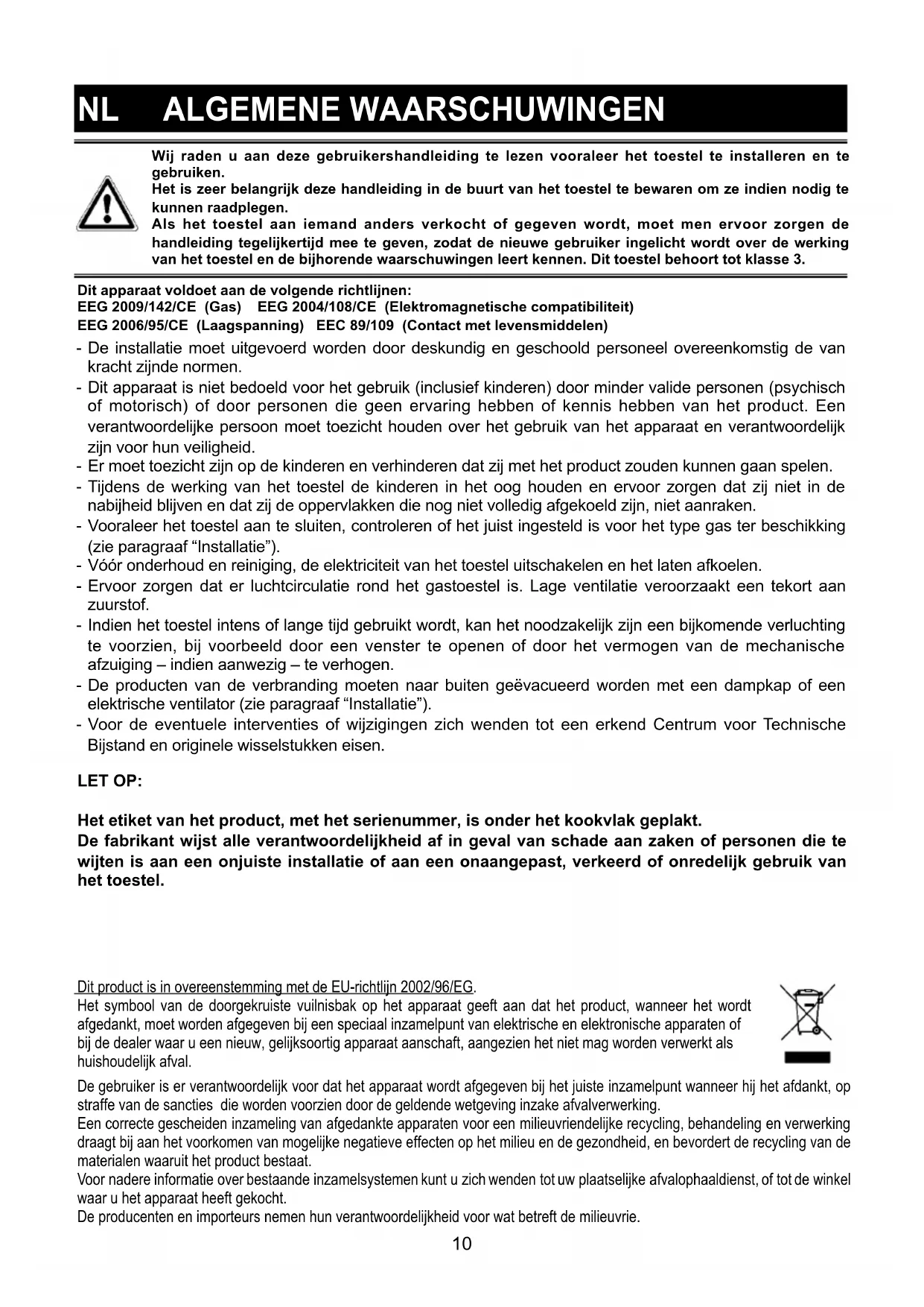 - De installatie moet uitgevoerd worden door deskundig en geschoold personeel overeenkomstig de van kracht zijnde normen. - Dit apparaat is niet bedoeld voor het gebruik (inclusief kinderen) door minder valide personen (psychisch of motorisch) of door personen die geen ervaring hebben of kennis hebben van het product. Een verantwoordelijke persoon moet toezicht houden over het gebruik van het apparaat en verantwoordelijk zijn voor hun veiligheid. - Er moet toezicht zijn op de kinderen en verhinderen dat zij met het product zouden kunnen gaan spelen. - Tijdens de werking van het toestel de kinderen in het oog houden en ervoor zorgen dat zij niet in de nabijheid blijven en dat zij de oppervlakken die nog niet volledig afgekoeld zijn, niet aanraken. - Vooraleer het toestel aan te sluiten, controleren of het juist ingesteld is voor het type gas ter beschikking (zie paragraaf “Installatie”). - Vóór onderhoud en reiniging, de elektriciteit van het toestel uitschakelen en het laten afkoelen. - Ervoor zorgen dat er luchtcirculatie rond het gastoestel is. Lage ventilatie veroorzaakt een tekort aan zuurstof. - Indien het toestel intens of lange tijd gebruikt wordt, kan het noodzakelijk zijn een bijkomende verluchting te voorzien, bij voorbeeld door een venster te openen of door het vermogen van de mechanische afzuiging – indien aanwezig – te verhogen. - De producten van de verbranding moeten naar buiten geëvacueerd worden met een dampkap of een elektrische ventilator (zie paragraaf “Installatie”). - Voor de eventuele interventies of wijzigingen zich wenden tot een erkend Centrum voor Technische Bijstand en originele wisselstukken eisen. LET OP: Het etiket van het product, met het serienummer, is onder het kookvlak geplakt. De fabrikant wijst alle verantwoordelijkheid af in geval van schade aan zaken of personen die te wijten is aan een onjuiste installatie of aan een onaangepast, verkeerd of onredelijk gebruik van het toestel. Dit apparaat voldoet aan de volgende richtlijnen: EEG 2009/142/CE (Gas) EEG 2004/108/CE (Elektromagnetische compatibiliteit) EEG 2006/95/CE (Laagspanning) EEC 89/109 (Contact met levensmiddelen) Dit product is in overeenstemming met de EU-richtlijn 2002/96/EG. Het symbool van de doorgekruiste vuilnisbak op het apparaat geeft aan dat het product, wanneer het wordt afgedankt, moet worden afgegeven bij een speciaal inzamelpunt van elektrische en elektronische apparaten of bij de dealer waar u een nieuw, gelijksoortig apparaat aanschaft, aangezien het niet mag worden verwerkt als huishoudelijk afval. De gebruiker is er verantwoordelijk voor dat het apparaat wordt afgegeven bij het juiste inzamelpunt wanneer hij het afdankt, op straffe van de sancties die worden voorzien door de geldende wetgeving inzake afvalverwerking. Een correcte gescheiden inzameling van afgedankte apparaten voor een milieuvriendelijke recycling, behandeling en verwerking draagt bij aan het voorkomen van mogelijke negatieve effecten op het milieu en de gezondheid, en bevordert de recycling van de materialen waaruit het product bestaat. Voor nadere informatie over bestaande inzamelsystemen kunt u zich wenden tot uw plaatselijke afvalophaaldienst, of tot de winkel waar u het apparaat heeft gekocht. De producenten en importeurs nemen hun verantwoordelijkheid voor wat betreft de milieuvrie.11