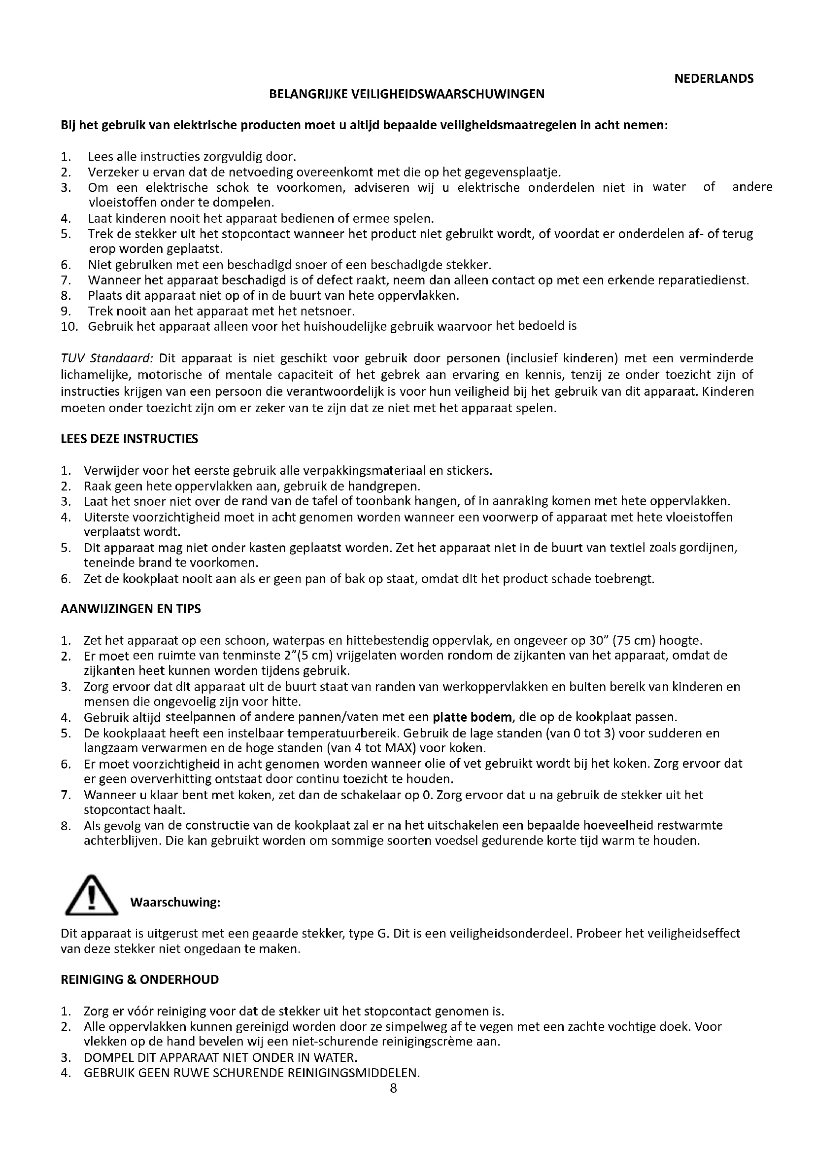 TUV Standaard: Dit apparaat is niet geschikt voor gebruik door personen (inclusief kinderen) met een verminderde lichamelijke, motorische of mentale capaciteit of het gebrek aan ervaring en kennis, tenzij ze onder toezicht zijn of instructieskrijgenvaneenpersoondieverantwoordelijkisvoorhunveiligheidbijhet gebruikvanditapparaat.Kinderen moetenondertoezichtzijnomerzekervantezijndatzenietmethetapparaatspelen.