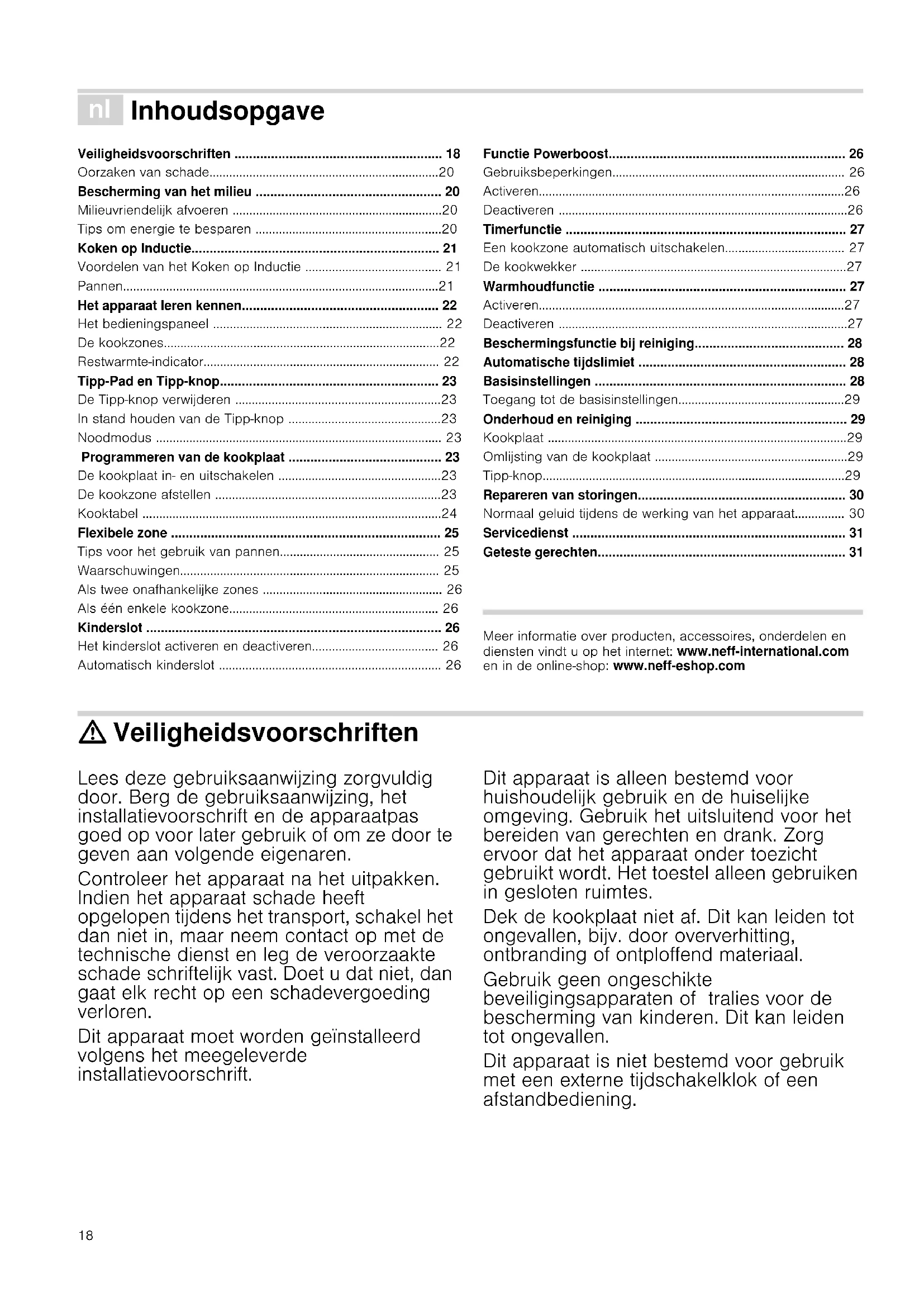- Geteste gerechten Produktinfo Meer informatie over producten, accessoires, onderdelen en diensten vindt u op het internet: www.neff-international.com en in de online-shop: www.neff-eshop.com : Veiligheidsvoorschriften Lees deze gebruiksaanwijzing zorgvuldig door. Berg de gebruiksaanwijzing, het installatievoorschrift en de apparaatpas goed op voor later gebruik of om ze door te geven aan volgende eigenaren. Controleer het apparaat na het uitpakken. Indien het apparaat schade heeft opgelopen tijdens het transport, schakel het dan niet in, maar neem contact op met de technische dienst en leg de veroorzaakte schade schriftelijk vast. Doet u dat niet, dan gaat elk recht op een schadevergoeding verloren. Dit apparaat moet worden geïnstalleerd volgens het meegeleverde installatievoorschrift. Dit apparaat is alleen bestemd voor huishoudelijk gebruik en de huiselijke omgeving. Gebruik het uitsluitend voor het bereiden van gerechten en drank. Zorg ervoor dat het apparaat onder toezicht gebruikt wordt. Het toestel alleen gebruiken in gesloten ruimtes. Dek de kookplaat niet af. Dit kan leiden tot ongevallen, bijv. door oververhitting, ontbranding of ontploffend materiaal. Gebruik geen ongeschikte beveiligingsapparaten of tralies voor de bescherming van kinderen. Dit kan leiden tot ongevallen. Dit apparaat is niet bestemd voor gebruik met een externe tijdschakelklok of een afstandbediening.19 Dit toestel kan worden gebruikt door kinderen vanaf 8 jaar en door personen met beperkte fysieke, sensorische of geestelijke vermogens of personen die gebrek aan kennis of ervaring hebben, wanneer zij onder toezicht staan van een persoon die verantwoordelijk is voor hun veiligheid of geleerd hebben het op een veilige manier te gebruiken en zich bewust zijn van de risico's die het gebruik van het toestel met zich meebrengt. Kinderen mogen niet met het apparaat spelen. Reiniging en onderhoud van het toestel mogen niet worden uitgevoerd door kinderen, tenzij zij 8 jaar of ouder zijn en onder toezicht staan. Zorg ervoor dat kinderen die jonger zijn dan 8 jaar uit de buurt blijven van het toestel of de aansluitkabel. Heeft u een pacemaker of soortgelijk medisch hulpmiddel geïmplanteerd, dan dient u speciale voorzorgsmaatregelen in acht nemen bij het gebruiken of in de buurt komen van inductiekookplaten als die in werking zijn. Raadpleeg uw arts of de fabrikant van het hulpmiddel, om er zeker van te zijn dat het voldoet aan de geldige regelgeving en informeer omtrent mogelijke incompatibiliteit. Risico van brand! p. 31