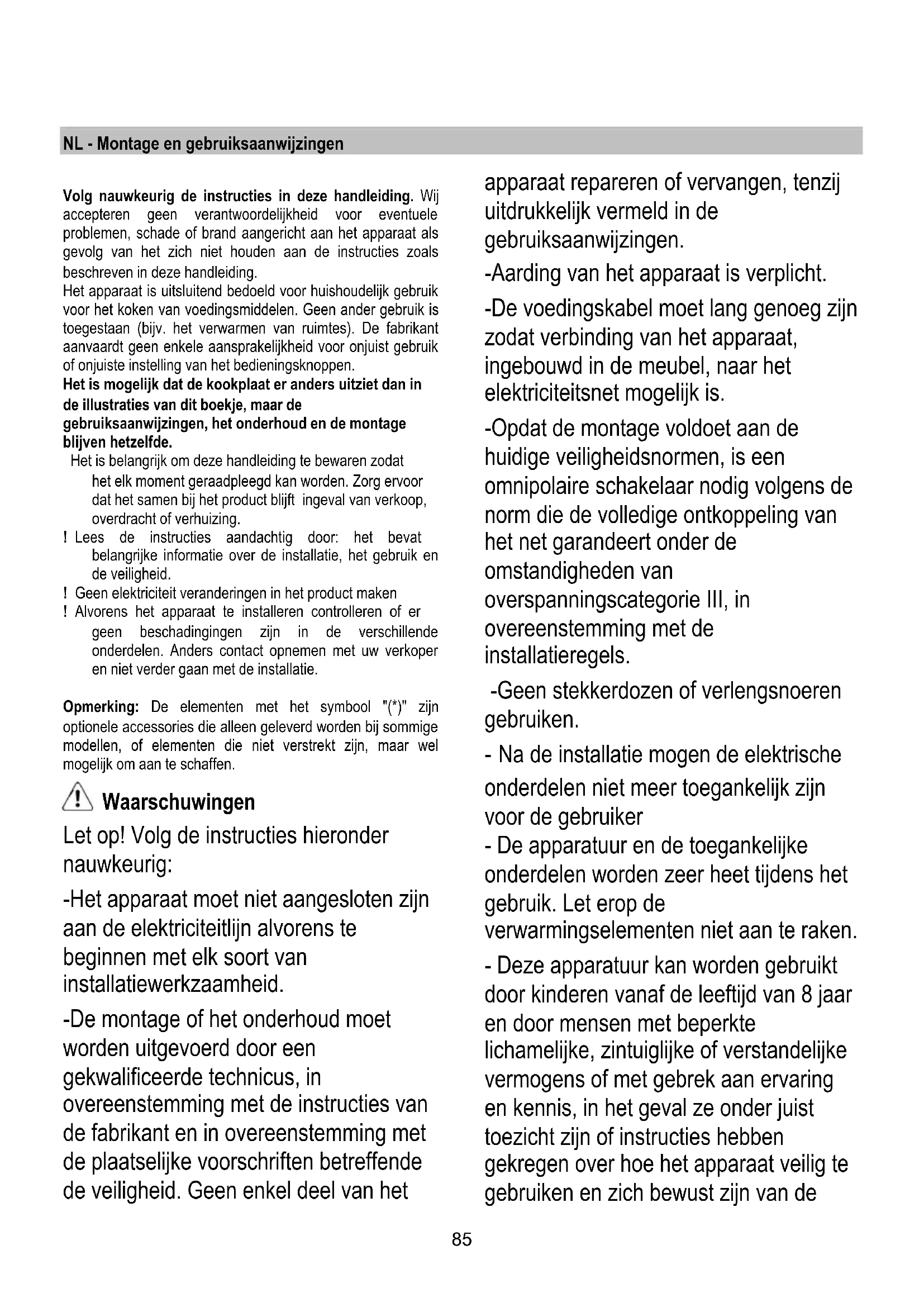 NL - Montage en gebruiksaanwijzingen Volg nauwkeurig de instructies in deze handleiding. Wij accepteren geen verantwoordelijkheid voor eventuele problemen, schade of brand aangericht aan het apparaat als gevolg van het zich niet houden aan de instructies zoals beschreven in deze handleiding. Het apparaat is uitsluitend bedoeld voor huishoudelijk gebruik voor het koken van voedingsmiddelen. Geen ander gebruik is toegestaan (bijv. het verwarmen van ruimtes). De fabrikant aanvaardt geen enkele aansprakelijkheid voor onjuist gebruik of onjuiste instelling van het bedieningsknoppen. Het is mogelijk dat de kookplaat er anders uitziet dan in de illustraties van dit boekje, maar de gebruiksaanwijzingen, het onderhoud en de montage blijven hetzelfde. Het is belangrijk om deze handleiding te bewaren zodat het elk moment geraadpleegd kan worden. Zorg ervoor dat het samen bij het product blijft ingeval van verkoop, overdracht of verhuizing. ! Lees de instructies aandachtig door: het bevat belangrijke informatie over de installatie, het gebruik en de veiligheid. ! Geen elektriciteit veranderingen in het product maken ! Alvorens het apparaat te installeren controlleren of er geen beschadingingen zijn in de verschillende onderdelen. Anders contact opnemen met uw verkoper en niet verder gaan met de installatie. Opmerking: De elementen met het symbool "(*)" zijn optionele accessories die alleen geleverd worden bij sommige modellen, of elementen die niet verstrekt zijn, maar wel mogelijk om aan te schaffen. Waarschuwingen Let op! Volg de instructies hieronder nauwkeurig: -Het apparaat moet niet aangesloten zijn aan de elektriciteitlijn alvorens te beginnen met elk soort van installatiewerkzaamheid. -De montage of het onderhoud moet worden uitgevoerd door een gekwalificeerde technicus, in overeenstemming met de instructies van de fabrikant en in overeenstemming met de plaatselijke voorschriften betreffende de veiligheid. Geen enkel deel van het apparaat repareren of vervangen, tenzij uitdrukkelijk vermeld in de gebruiksaanwijzingen. -Aarding van het apparaat is verplicht. -De voedingskabel moet lang genoeg zijn zodat verbinding van het apparaat, ingebouwd in de meubel, naar het elektriciteitsnet mogelijk is. -Opdat de montage voldoet aan de huidige veiligheidsnormen, is een omnipolaire schakelaar nodig volgens de norm die de volledige ontkoppeling van het net garandeert onder de omstandigheden van overspanningscategorie III, in overeenstemming met de installatieregels. -Geen stekkerdozen of verlengsnoeren gebruiken. - Na de installatie mogen de elektrische onderdelen niet meer toegankelijk zijn voor de gebruiker - De apparatuur en de toegankelijke onderdelen worden zeer heet tijdens het gebruik. Let erop de verwarmingselementen niet aan te raken. - Deze apparatuur kan worden gebruikt door kinderen vanaf de leeftijd van 8 jaar en door mensen met beperkte lichamelijke, zintuiglijke of verstandelijke vermogens of met gebrek aan ervaring en kennis, in het geval ze onder juist toezicht zijn of instructies hebben gekregen over hoe het apparaat veilig te gebruiken en zich bewust zijn van de86 verwante gevaren. Kinderen mogen niet met het apparaat spelen. Schoonmaak en onderhoud mag niet worden uitgevoerd door kinderen zonder toezicht. - Zorg ervoor dat kinderen niet spelen met het apparaat; kinderen uit de buurt houden en ze in de gaten houden, omdat de toegankelijke delen heel heet kunnen worden tijdens het gebruik. - Voor mensen met pacemakers en actieve implantaten is het belangrijk om te controleren, voorafgaand aan het gebruik van de kookplaat, dat uw stimulator compatibel is met het apparaat. -Tijdens en na gebruik niet de verwarmingselementen van het apparaat aanraken. -Contact met doeken of andere brandbare materialen vermijden totdat alle onderdelen van het apparaat voldoende zijn afgekoeld. -Geen brandbare materialen op het apparaat zetten of in de nabijheid. -Oververhitte vetten en oliën kunnen gemakkelijk vlam vatten. Toezicht houden tijdens de bereiding van voedsel dat rijk is aan vet en olie. - De schoonmaak en de onderhoudswerkzaamheden die uitgevoerd worden door de gebruiker mogen niet door kinderen worden gedaan zonder toezicht van een persoon die verantwoordelijk is voor hen. -Het is verplicht een scheidingspaneel te installeren, dat niet is meegeleverd, in de ruimte onder het apparaat. -Als het oppervlak aangetast of gebarsten is, het apparaat uitschakelen om de kans van een elektrische schok te voorkomen. -Het apparaat mag niet door een externe timer of een afzonderlijk afstandsbedieningssysteem in bedrijf worden gesteld. -Het onbewaakt koken op een kookplaat met olie of vet kan gevaarlijk zijn en brand veroorzaken. - Het kookproces moet in de gaten gehouden worden. Een kort kookproces moet constant in de gaten gehouden worden. - NOOIT proberen vlammen met water te blussen. In plaats daarvan, zet het apparaat uit en doof de vlammen, bijvoorbeeld met een deksel of een branddeken. Brandgevaar: Plaats geen voorwerpen op de kookplaten. - Geen stoomreiniger gebruiken. - Geen metalen voorwerpen zoals messen, vorken, lepels en deksels op het oppervlak van de kookplaat plaatsen aangezien dezen oververhit zouden kunnen raken. - Alvorens het model op het elektriciteitsnet aan te sluiten: controlleer het kenplaatje (aan de onderkant van het apparaat) om er zeker van te zijn dat de spanning en het vermogen overeenkomen met die van het netwerk en het stopcontact van de aansluiting geschikt is. Als u twijfelt, bel dan een gekwalificeerde elektricien.87 Belangrijk: - Na gebruik de kookplaat uitschakelen middels het bedieningspaneel en niet vertrouwen op de pan detector. - Vermijd het morsen van vloeistoffen, dus voor het koken of opwarmen van vloeistoffen de warmtetoevoer verminderen. - Laat de verwarmingselementen niet aanstaan met lege pannen of koekepannen, of zonder recipiёnt. - Wanneer u klaar bent koken, de betreffende zone uitschakelen. - Gebruik nooit stukken aluminiumfolie om te koken, of nooit pr
