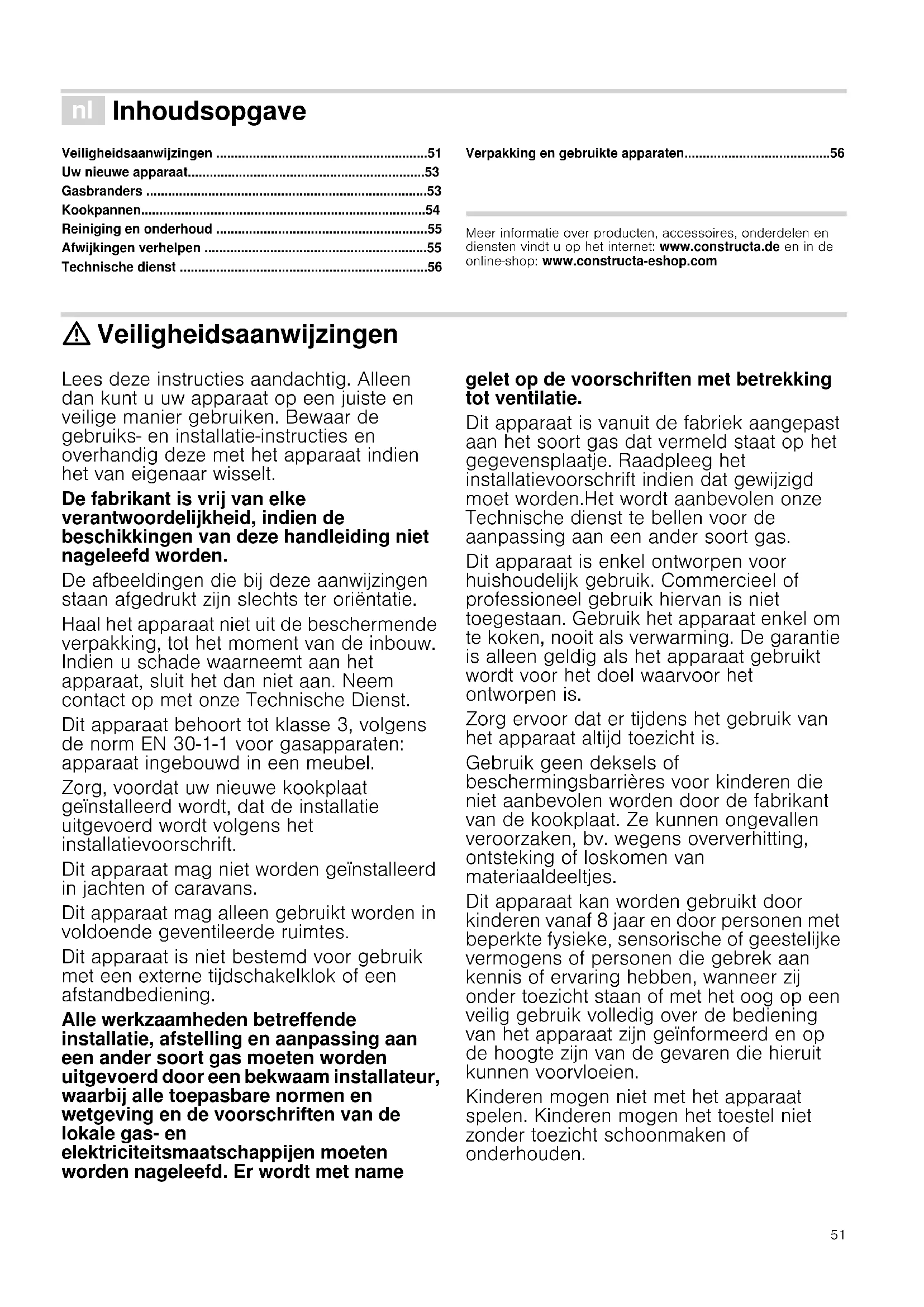 - Emballasje og brukte apparater Produktinfo Nærmere informasjon om produkter, tilbehør, reservedeler og tjenester finner du på Internett: www.constructa.de og nettbutikk: www.constructa-eshop.com : Sikkerhetsanvisninger Les disse instruksjonene nøye. Det er nødvendig for å kunne bruke apparatet på en sikker og effektiv måte. Ta vare på monterings- og bruksanvisningen slik at disse kan gis videre til en eventuell ny eier. Produsenten står ikke ansvarlig dersom forholdsreglene som angis i denne brukerveiledningen ikke overholdes. Bildene i bruksanvisningen er bare til orientering. Ikke ta apparatet ut av beskyttelsesemballasjen før du skal foreta innbyggingen. Dersom produktet er skadet på noen måte må det ikke tilkobles. Ta kontakt med vår tekniske service. Dette apparatet er av klasse 3, i henhold til standard EN 30-1-1 for gassprodukter: innebygget apparat. Før du installerer din nye koketopp må du forsikre deg om at installeringen gjøres i henhold til monteringsanvisningene. Dette apparatet må ikke installeres i yachter eller campingvogner. Dette apparatet skal bare brukes på steder med tilstrekkelig ventilasjon. Dette apparatet er ikke ment for bruk med et eksternt tidsur eller fjernstyring. All installering, tilkobling, regulering og omstilling til andre gasstyper skal kun utføres av autorisert fagpersonell. Gjeldende lover og regler skal etterfølges samt retningslinjer fra lokale elektrisitets- og gasselskaper. Legg spesielt merke til bestemmelsene som gjelder for ventilasjon. Koketoppen er fabrikkinnstilt for den gasstypen som er angitt på typeskiltet. Hvis den må skiftes ut, må du følge monteringsanvisningene. Vi anbefaler deg å kontakte vår tekniske service for omstilling til andre gasstyper. Dette apparatet er konstruert for kun privat bruk. Kommersiell og profesjonell bruk er ikke tillatt. Bruk koketoppen kun til tilbereding av mat, aldri som varmekilde. Garantien er kun gyldig hvis man respekterer den tiltenkte bruken til apparatet. Ikke la apparatet være uten tilsyn mens det er i drift. Bruk ikke lokk eller barnesikringer som ikke anbefales av koketoppens produsent. De kan forårsake ulykker, f.eks. på grunn av overoppheting, antennelse eller løsning av materialfragmenter. Dette apparatet kan bare benyttes av barn over 8 år og personer med begrensede fysiske, sensoriske eller mentale evner eller manglende erfaring eller kunnskap, dersom de er under oppsyn eller har fått opplæring i bruk av apparatet og dermed har forstått farene som kan oppstå. Barn må ikke leke med apparatet. Rengjøring og vedlikehold må ikke utføres av barn uten oppsyn. Fare for store flammer! Ubrent gass som samler seg opp i et lukket område, fører til fare for store flammer. Ikke utsett apparatet for trekk. Det kan føre til at brennerne vil slukke. Les bruksanvisningen og veiledningen nøye vedrørende bruken av gassbluss. Fare for forgiftning! Bruk av gassapparat produserer varme, fuktighet og forbrenningsprodukter i det rommet hvor det er installert. Sørg for ar kjøkkenet er godt ventilert, særlig mens koketoppen brukes: hold alle naturlige lufteåpninger åpne, eller installer mekanisk ventilasjon (avtrekksvifte) Hvis apparatet brukes mye og over lang tid, kan det være nødvendig med en tilleggsventilasjon eller58 en mer effektiv ventilasjon: åpne vinduer eller øk effekten til avtrekksviften. Fare for brannsår! Kokesonene og tilgrensede områder blir svært varme. Du må aldri ta på varme overflater. Hold barn yngre enn 8 år unna. Brannfare! p. 62