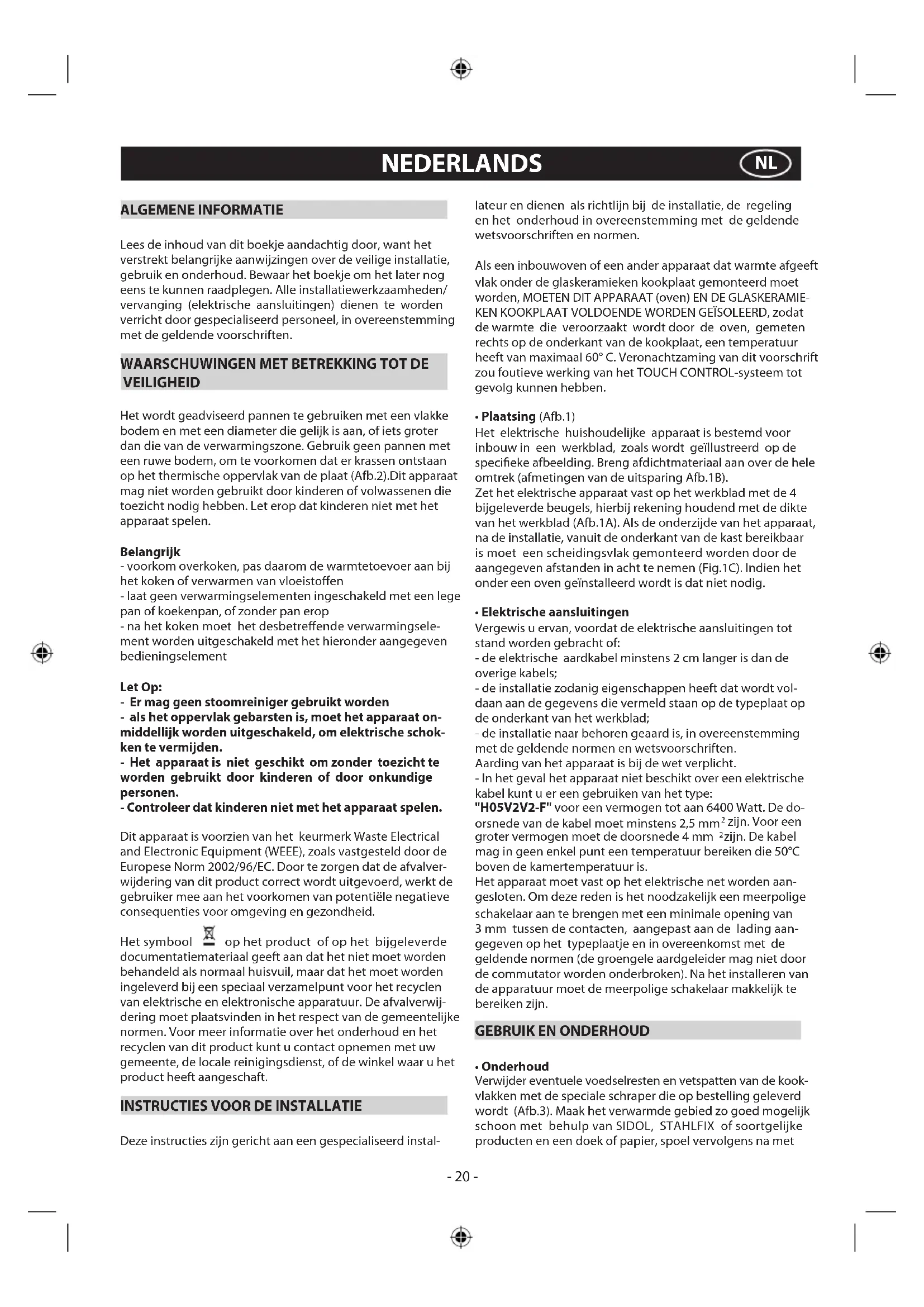 VEILIGHEID Het wordt geadviseerd pannen te gebruiken met een vlakke bodem en met een diameter die gelijk is aan, of iets groter dan die van de verwarmingszone. Gebruik geen pannen met een ruwe bodem, om te voorkomen dat er krassen ontstaan op het thermische oppervlak van de plaat (Afb.2).Dit apparaat mag niet worden gebruikt door kinderen of volwassenen die toezicht nodig hebben. Let erop dat kinderen niet met het apparaat spelen. Belangrijk - voorkom overkoken, pas daarom de warmtetoevoer aan bij het koken of verwarmen van vloeistoffen - laat geen verwarmingselementen ingeschakeld met een lege pan of koekenpan, of zonder pan erop - na het koken moet het desbetreffende verwarmingsele- ment worden uitgeschakeld met het hieronder aangegeven bedieningselement Let Op: - Er mag geen stoomreiniger gebruikt worden - als het oppervlak gebarsten is, moet het apparaat on- middellijk worden uitgeschakeld, om elektrische schok- ken te vermijden. - Het apparaat is niet geschikt om zonder toezicht te worden gebruikt door kinderen of door onkundige personen. - Controleer dat kinderen niet met het apparaat spelen. Dit apparaat is voorzien van het keurmerk Waste Electrical and Electronic Equipment (WEEE), zoals vastgesteld door de Europese Norm 2002/96/EC. Door te zorgen dat de afvalver- wijdering van dit product correct wordt uitgevoerd, werkt de gebruiker mee aan het voorkomen van potentiële negatieve consequenties voor omgeving en gezondheid. Het symbool op het product of op het bijgeleverde documentatiemateriaal geeft aan dat het niet moet worden behandeld als normaal huisvuil, maar dat het moet worden ingeleverd bij een speciaal verzamelpunt voor het recyclen van elektrische en elektronische apparatuur. De afvalverwij- dering moet plaatsvinden in het respect van de gemeentelijke normen. Voor meer informatie over het onderhoud en het recyclen van dit product kunt u contact opnemen met uw gemeente, de locale reinigingsdienst, of de winkel waar u het product heeft aangeschaft.