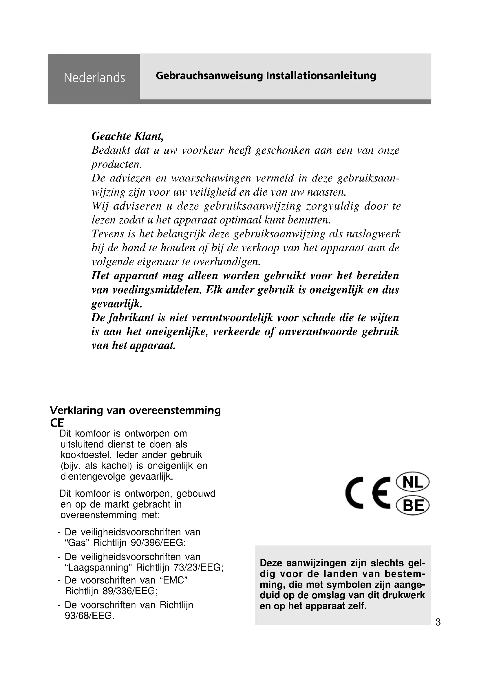 FR2 Instruction for the use - Installation advice English Page 91 Gebrauchsanweisung Installationsanleitung Deutsch Seite 25 Instrucciones de uso - Consejos para la instalación Español Página 69 Gebruiksaanwijzing en installatievoorschriften Nederlands Bladzijde 3 Mode d’emploi - Conseils pour l’installation Français Page 473 Deze aanwijzingen zijn slechts gel- dig voor de landen van bestem- ming, die met symbolen zijn aange- duid op de omslag van dit drukwerk en op het apparaat zelf. Geachte Klant, Bedankt dat u uw voorkeur heeft geschonken aan een van onze producten. De adviezen en waarschuwingen vermeld in deze gebruiksaan- wijzing zijn voor uw veiligheid en die van uw naasten. Wij adviseren u deze gebruiksaanwijzing zorgvuldig door te lezen zodat u het apparaat optimaal kunt benutten. Tevens is het belangrijk deze gebruiksaanwijzing als naslagwerk bij de hand te houden of bij de verkoop van het apparaat aan de volgende eigenaar te overhandigen. Het apparaat mag alleen worden gebruikt voor het bereiden van voedingsmiddelen. Elk ander gebruik is oneigenlijk en dus gevaarlijk. De fabrikant is niet verantwoordelijk voor schade die te wijten is aan het oneigenlijke, verkeerde of onverantwoorde gebruik van het apparaat. Gebrauchsanweisung Installationsanleitung Nederlands