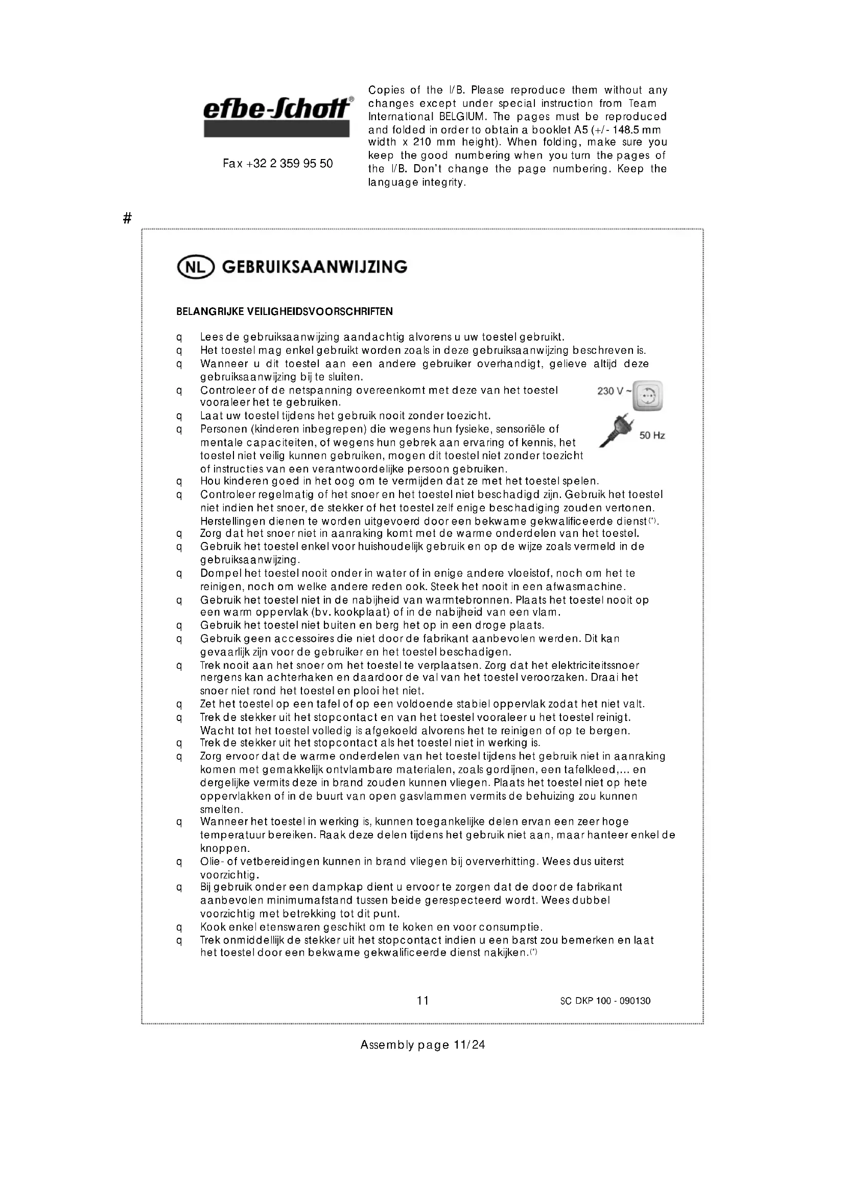 Om ons milieu en onze gezondheid te beschermen, moet afgedankte elektrische en elektronische apparatuur in overeenstemming met welbepaalde regels weggegooid worden. Dit vergt zowel de inzet van de leveranciers als van de gebruikers. Om deze reden mag uw apparaat, zoals op het typeplaatje of op de verpakking aangegeven door het symbool , niet met het gewone huisvuil weggegooid worden. De gebruiker heeft het recht het toestel gratis naar een gemeentelijk centrum van gescheiden inzameling te brengen waar het overeenkomstig de richtlijn hergebruikt, gerecycleerd of voor andere doeleinden gebruikt zal worden.# Copies of the I/B. Please reproduce them without any changes except under special instruction from Team International BELGIUM. The pages must be reproduced and folded in order to obtain a booklet A5 (+/- 148.5 mm width x 210 mm height). When folding, make sure you keep the good numbering when you turn the pages of the I/B. Don’t change the page numbering. Keep the language integrity.