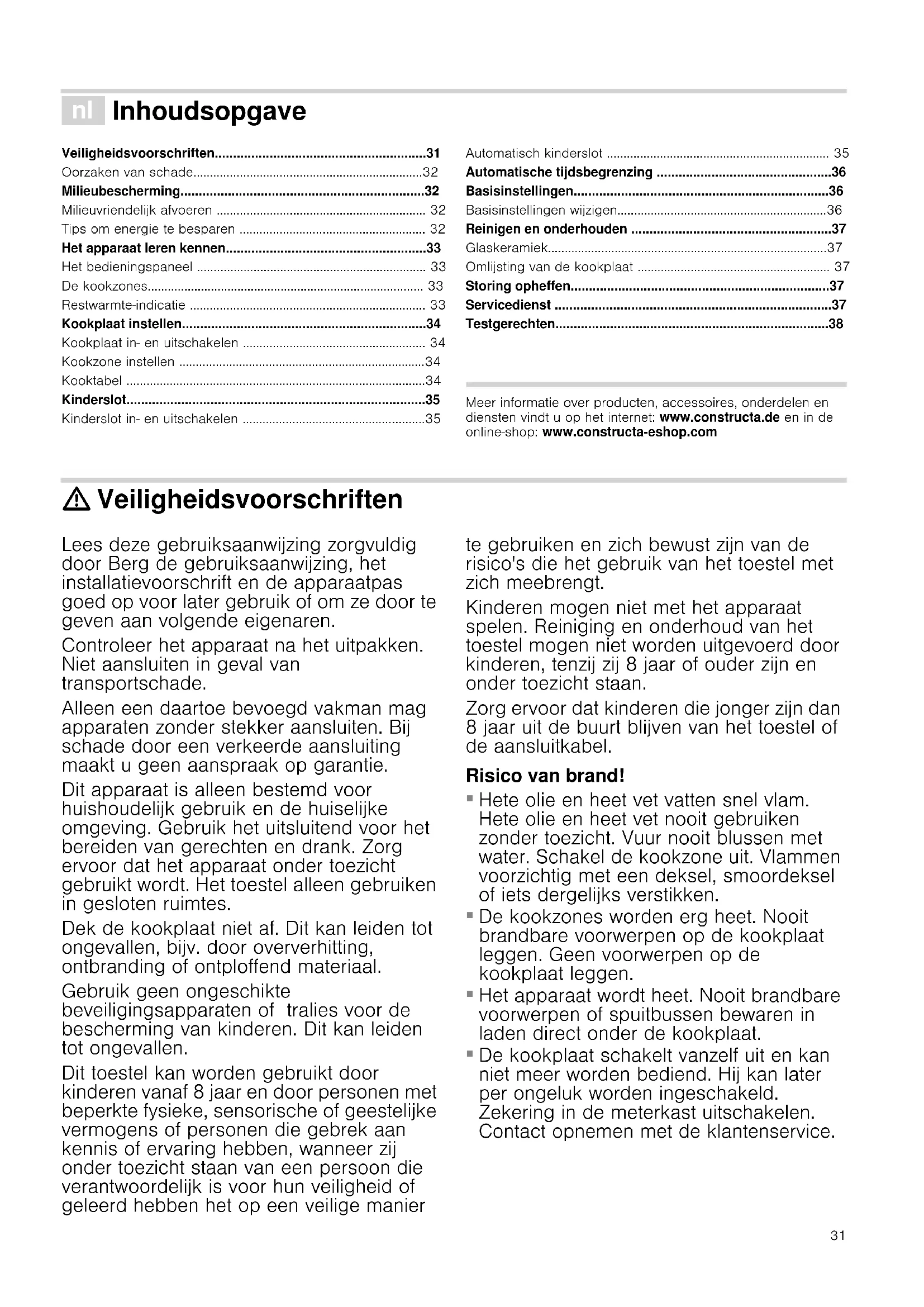 - Testgerechten Produktinfo Meer informatie over producten, accessoires, onderdelen en diensten vindt u op het internet: www.constructa.de en in de online-shop: www.constructa-eshop.com : Veiligheidsvoorschriften Lees deze gebruiksaanwijzing zorgvuldig door Berg de gebruiksaanwijzing, het installatievoorschrift en de apparaatpas goed op voor later gebruik of om ze door te geven aan volgende eigenaren. Controleer het apparaat na het uitpakken. Niet aansluiten in geval van transportschade. Alleen een daartoe bevoegd vakman mag apparaten zonder stekker aansluiten. Bij schade door een verkeerde aansluiting maakt u geen aanspraak op garantie. Dit apparaat is alleen bestemd voor huishoudelijk gebruik en de huiselijke omgeving. Gebruik het uitsluitend voor het bereiden van gerechten en drank. Zorg ervoor dat het apparaat onder toezicht gebruikt wordt. Het toestel alleen gebruiken in gesloten ruimtes. Dek de kookplaat niet af. Dit kan leiden tot ongevallen, bijv. door oververhitting, ontbranding of ontploffend materiaal. Gebruik geen ongeschikte beveiligingsapparaten of tralies voor de bescherming van kinderen. Dit kan leiden tot ongevallen. Dit toestel kan worden gebruikt door kinderen vanaf 8 jaar en door personen met beperkte fysieke, sensorische of geestelijke vermogens of personen die gebrek aan kennis of ervaring hebben, wanneer zij onder toezicht staan van een persoon die verantwoordelijk is voor hun veiligheid of geleerd hebben het op een veilige manier te gebruiken en zich bewust zijn van de risico's die het gebruik van het toestel met zich meebrengt. Kinderen mogen niet met het apparaat spelen. Reiniging en onderhoud van het toestel mogen niet worden uitgevoerd door kinderen, tenzij zij 8 jaar of ouder zijn en onder toezicht staan. Zorg ervoor dat kinderen die jonger zijn dan 8 jaar uit de buurt blijven van het toestel of de aansluitkabel. Risico van brand! p. 38