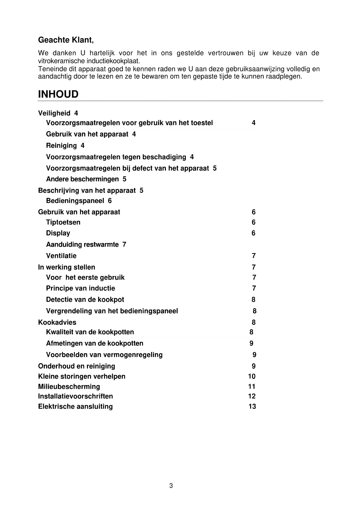 MIB603 Geachte Klant, We danken U hartelijk voor het in ons gestelde vertrouwen bij uw keuze van de vitrokeramische inductiekookplaat. Teneinde dit apparaat goed te kennen raden we U aan deze gebruiksaanwijzing volledig en aandachtig door te lezen en ze te bewaren om ten gepaste tijde te kunnen raadplegen. INHOUD Veiligheid 4 Voorzorgsmaatregelen voor gebruik van het toestel 4 Gebruik van het apparaat 4 Reiniging 4 Voorzorgsmaatregelen tegen beschadiging 4 Voorzorgsmaatregelen bij defect van het apparaat 5 Andere beschermingen 5 Beschrijving van het apparaat 5 Bedieningspaneel 6 Gebruik van het apparaat 6 Tiptoetsen 6 Display 6 Aanduiding restwarmte 7 Ventilatie 7 In werking stellen 7 Voor het eerste gebruik 7 Principe van inductie 7 Detectie van de kookpot 8 Vergrendeling van het bedieningspaneel 8 Kookadvies 8 Kwaliteit van de kookpotten 8 Afmetingen van de kookpotten 9 Voorbeelden van vermogenregeling 9 Onderhoud en reiniging 9 Kleine storingen verhelpen 10 Milieubescherming 11 Installatievoorschriften 12 Elektrische aansluiting 134 VEILIGHEID Voorzorgsmaatregelen voor gebruik van het toestel Verwijder alle verpakkingen. De installatie en de elektrische aansluiting van het apparaat dienen aan een erkende vakman toevertrouwd te worden. De fabrikant kan niet verantwoordelijk gesteld worden voor eventuele schade voortkomend uit een foutieve inbouw of aansluiting. Het apparaat mag enkel gebruikt worden wanneer het gemonteerd en geïnstalleerd is in een meubel met een gehomologeerd en aangepast werkvlak. Het is enkel bestemd voor gewoon huishoudelijk gebruik (bereiding van voedingsmiddelen) met uitsluiting van alle ander huishoudelijk, commercieel of industrieel gebruik. Verwijder alle etiketten en zelfklevers van het vitrokeramisch glas. Het apparaat niet ombouwen of wijzigen. De kookplaat dient niet als ondergrond of werkvlak. De veiligheid wordt enkel verzekerd wanneer het apparaat volgens de vereiste voorschriften op een aardleiding is aangesloten. Gebruik geen verlengkabel voor de aansluiting op het elektrisch net. . Het apparaat mag niet gebruikt worden boven een vaatwasmachine of een droogkast, de vrijgekomen damp kan het elektronische apparatuur beschadigen. Gebruik van het apparaat Schakel de warmtebron na gebruik steeds uit. Waak steeds over bereidingen die oliën en vetten bevatten want deze kunnen vlug vlam vatten. Pas op voor brandwonden tijdens en na het gebruik van het apparaat. Kinderen het apparaat niet laten manipuleren. Verzeker u ervan dat geen enkele elektrische kabel van een vast of los apparaat met het warme kookvlak of met een warme kookpot in contact komt. Magnetisch gevoelige voorwerpen (creditcards, informatica diskettes, rekenmachines) mogen zich niet in de onmiddellijke nabijheid van het functionerende apparaat bevinden. Gebruik enkel de hiertoe voorziene kookpotten. Bij onverhoeds aanschakelen of restwarmte zouden andere materialen kunnen smelten of ontbranden. Bedek het apparaat nooit met een doek of een beschermblad. Het zou kunnen verhitten en ontvlammen. Reiniging Schakel het apparaat uit alvorens te reinigen. Laat warme delen eerst afkoelen. Gebruik geen « stoom- » of « druk »-toestellen. Gebruik geen middelen die de vitrokeramiek zouden kunnen bekrassen (zoals schuursponsen, mespunten, …). Voorzorgsmaatregelen tegen beschadiging Beschadigde kookpotten of kookpotten met ruwe bodem (niet geëmailleerd gietijzer) kunnen de vitrokeramiek beschadigen. De aanwezigheid van zand of andere schuurmaterialen kunnen de vitrokeramiek beschadigen.5 Laat geen voorwerpen (zelfs kleine) op de vitrokeramiek vallen. Vermijd het stoten van kookpotten tegen de rand van het glas. Verzeker u ervan dat de ventilatie van het apparaat verloopt volgens de instructies van de fabrikant. Plaats of laat geen lege kookpotten op de kookplaat. Vermijd het contact van suiker, synthetische stoffen of aluminiumfolie met de hete zones. Deze stoffen kunnen tijdens het afkoelen het vitrokeramische oppervlak doen barsten of aantasten: schakel het apparaat uit en verwijder ze onmiddellijk van de nog hete zones (opgepast: risico voor brandwonden) Plaats nooit een warme kookpot op de bedieningszone. Indien er onder het inbouwapparaat een lade is, zorg dan voor een voldoende afstand (2 cm) tussen de inhoud van de lade en de onderkant van het apparaat teneinde een goede ventilatie te verzekeren. Leg geen ontvlambare voorwerpen (bv sprays) in de lade onder de kookplaat. Eventuele bestekbakken dienen in warmtebestendig materiaal te zijn uitgevoerd. Voorzorgsmaatregelen bij defect van het apparaat Bij het vaststellen van een defect, het apparaat uitzetten en de elektrische toevoer uitschakelen. Schakel onmiddellijk de elektrische stroom van het apparaat uit indien er een barst of spleet in de vitrokeramiek is en verwittig de dienst na verkoop. De herstellingen dienen enkel door gespecialiseerd personeel te worden uitgevoerd. In geen geval het apparaat zelf openen. Andere beschermingen Zorg ervoor dat de kookpot steeds in het midden van de kookzone staat. De bodem van de kookpot moet de kookzone zoveel mogelijk bedekken. Een magnetisch veld kan elektronische apparatuur beïnvloeden. Personen die een pacemaker dragen doen er goed aan eerst een arts te raadplegen. Gebruik geen synthetische of aluminium kookpannen: deze kunnen op de nog hete zones smelten. Oude apparaten bevatten waardevolle metalen. Neem bij uw administratie inlichtingen betreffende de reclyclingmogelijkheden.