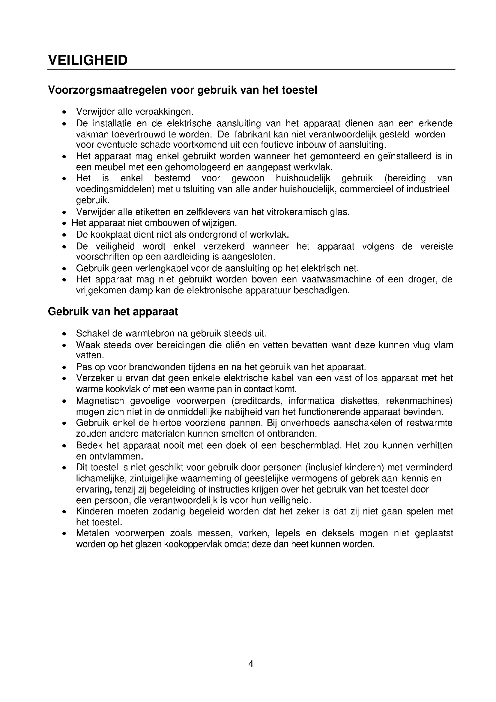- ELEKTRISCHE AANSLUITING VEILIGHEID Voorzorgsmaatregelen voor gebruik van het toestel Verwijder alle verpakkingen. De installatie en de elektrische aansluiting van het apparaat dienen aan een erkende vakman toevertrouwd te worden. De fabrikant kan niet verantwoordelijk gesteld worden voor eventuele schade voortkomend uit een foutieve inbouw of aansluiting. Het apparaat mag enkel gebruikt worden wanneer het gemonteerd en geïnstalleerd is in een meubel met een gehomologeerd en aangepast werkvlak. Het is enkel bestemd voor gewoon huishoudelijk gebruik (bereiding van voedingsmiddelen) met uitsluiting van alle ander huishoudelijk, commercieel of industrieel gebruik. Verwijder alle etiketten en zelfklevers van het vitrokeramisch glas. Het apparaat niet ombouwen of wijzigen. De kookplaat dient niet als ondergrond of werkvlak. De veiligheid wordt enkel verzekerd wanneer het apparaat volgens de vereiste voorschriften op een aardleiding is aangesloten. Gebruik geen verlengkabel voor de aansluiting op het elektrisch net. Het apparaat mag niet gebruikt worden boven een vaatwasmachine of een droger, de vrijgekomen damp kan de elektronische apparatuur beschadigen. Gebruik van het apparaat Schakel de warmtebron na gebruik steeds uit. Waak steeds over bereidingen die oliën en vetten bevatten want deze kunnen vlug vlam vatten. Pas op voor brandwonden tijdens en na het gebruik van het apparaat. Verzeker u ervan dat geen enkele elektrische kabel van een vast of los apparaat met het warme kookvlak of met een warme pan in contact komt. Magnetisch gevoelige voorwerpen (creditcards, informatica diskettes, rekenmachines) mogen zich niet in de onmiddellijke nabijheid van het functionerende apparaat bevinden. Gebruik enkel de hiertoe voorziene pannen. Bij onverhoeds aanschakelen of restwarmte zouden andere materialen kunnen smelten of ontbranden. Bedek het apparaat nooit met een doek of een beschermblad. Het zou kunnen verhitten en ontvlammen. Dit toestel is niet geschikt voor gebruik door personen (inclusief kinderen) met verminderd lichamelijke, zintuigelijke waarneming of geestelijke vermogens of gebrek aan kennis en ervaring, tenzij zij begeleiding of instructies krijgen over het gebruik van het toestel door een persoon, die verantwoordelijk is voor hun veiligheid. Kinderen moeten zodanig begeleid worden dat het zeker is dat zij niet gaan spelen met het toestel. Metalen voorwerpen zoals messen, vorken, lepels en deksels mogen niet geplaatst worden op het glazen kookoppervlak omdat deze dan heet kunnen worden.5 Voorzorgsmaatregelen tegen beschadiging Beschadigde pannen of pannen met ruwe bodem (niet geëmailleerd gietijzer) kunnen de vitrokeramiek beschadigen. De aanwezigheid van zand of andere schuurmaterialen kunnen de vitrokeramiek beschadigen. Laat geen voorwerpen (zelfs kleine) op de vitrokeramiek vallen. Vermijd het stoten van pannen tegen de rand van het glas. Verzeker u ervan dat de ventilatie van het apparaat verloopt volgens de instructies van de fabrikant. Plaats of laat geen lege pannen op de kookplaat. Vermijd het contact van suiker, synthetische stoffen of aluminiumfolie met de hete zones. Deze stoffen kunnen tijdens het afkoelen het vitrokeramische oppervlak doen barsten of aantasten: schakel het apparaat uit en verwijder ze onmiddellijk van de nog hete zones (opgepast: risico voor brandwonden) Plaats nooit een warme pan op de bedieningszone. Indien er onder het inbouwapparaat een lade is, zorg dan voor een voldoende afstand (2 cm) tussen de inhoud van de lade en de onderkant van het apparaat teneinde een goede ventilatie te verzekeren. Leg geen ontvlambare voorwerpen (bv sprays) in de lade onder de kookplaat. Eventuele bestekbakken dienen in warmtebestendig materiaal te zijn uitgevoerd. Voorzorgsmaatregelen bij defect van het apparaat Bij het vaststellen van een defect, het apparaat uitzetten en de elektrische toevoer uitschakelen. Schakel onmiddellijk de elektrische stroom van het apparaat uit indien er een barst of spleet in de vitrokeramiek is en verwittig de dienst na verkoop. De herstellingen dienen enkel door gespecialiseerd personeel te worden uitgevoerd. In geen geval het apparaat zelf openen. WAARSCHUWING: Als het glazen kookoppervlak gebroken is schakel het toestel uit om een mogelijke electrische schok te voorkomen Andere beschermingen Zorg ervoor dat de pan steeds in het midden van de kookzone staat. De bodem van de pan moet de kookzone zoveel mogelijk bedekken. Een magnetisch veld kan elektronische apparatuur beïnvloeden. Personen die een pacemaker dragen doen er goed aan eerst een arts te raadplegen. Gebruik geen synthetische of aluminium kookpannen: deze kunnen op de nog hete zones smelten. p. 154