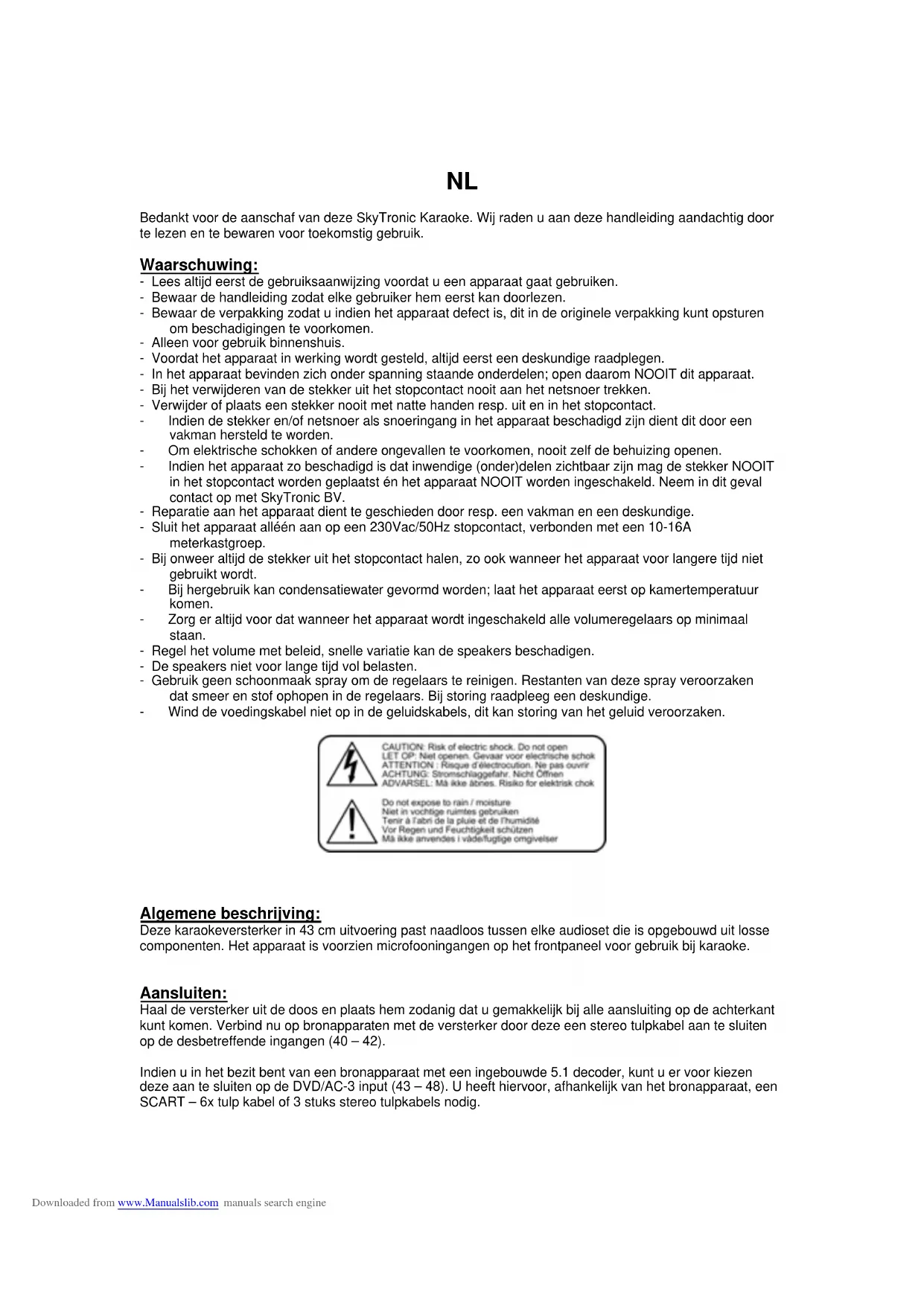 Bedankt voor de aanschaf van deze SkyTronic Karaoke. Wij raden u aan deze handleiding aandachtig door te lezen en te bewaren voor toekomstig gebruik.