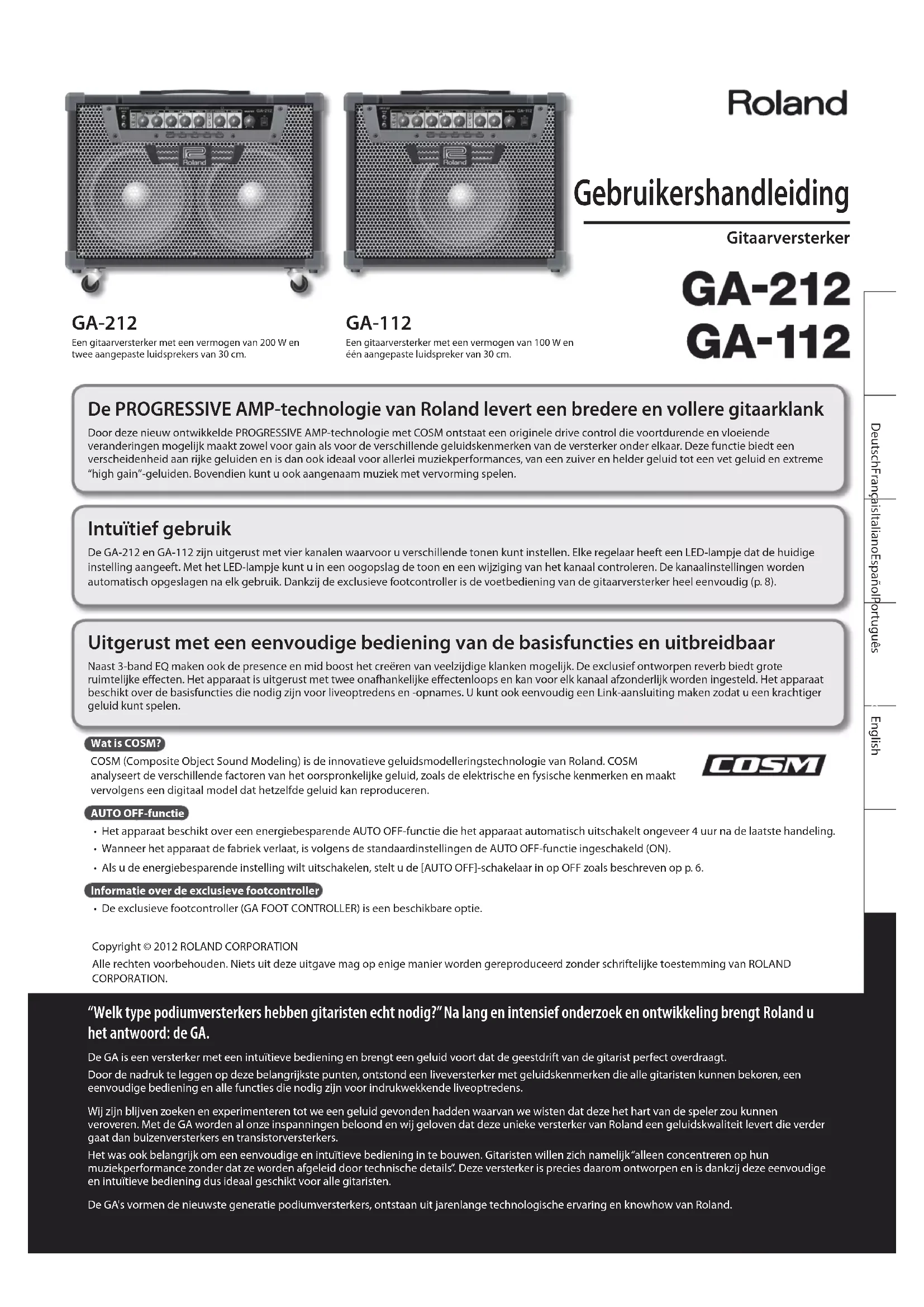 962a Com a nalidade de aprimorar o produto, as especicações e/ou aparência deste equipamento estão sujeitas a mudanças sem aviso prévio.Copyright © 2012 ROLAND CORPORATION Alle rechten voorbehouden. Niets uit deze uitgave mag op enige manier worden gereproduceerd zonder schriftelijke toestemming van ROLAND CORPORATION. Gebruikershandleiding Gitaarversterker GA-212 Een gitaarversterker met een vermogen van 200 W en twee aangepaste luidsprekers van 30 cm. GA-112 Een gitaarversterker met een vermogen van 100 W en één aangepaste luidspreker van 30 cm. De PROGRESSIVE AMP-technologie van Roland levert een bredere en vollere gitaarklank Door deze nieuw ontwikkelde PROGRESSIVE AMP-technologie met COSM ontstaat een originele drive control die voortdurende en vloeiende veranderingen mogelijk maakt zowel voor gain als voor de verschillende geluidskenmerken van de versterker onder elkaar. Deze functie biedt een verscheidenheid aan rijke geluiden en is dan ook ideaal voor allerlei muziekperformances, van een zuiver en helder geluid tot een vet geluid en extreme “high gain”-geluiden. Bovendien kunt u ook aangenaam muziek met vervorming spelen. Intuïtief gebruik De GA-212 en GA-112 zijn uitgerust met vier kanalen waarvoor u verschillende tonen kunt instellen. Elke regelaar heeft een LED-lampje dat de huidige instelling aangeeft. Met het LED-lampje kunt u in een oogopslag de toon en een wijziging van het kanaal controleren. De kanaalinstellingen worden automatisch opgeslagen na elk gebruik. Dankzij de exclusieve footcontroller is de voetbediening van de gitaarversterker heel eenvoudig (p. 8). Uitgerust met een eenvoudige bediening van de basisfuncties en uitbreidbaar Naast 3-band EQ maken ook de presence en mid boost het creëren van veelzijdige klanken mogelijk. De exclusief ontworpen reverb biedt grote ruimtelijke eecten. Het apparaat is uitgerust met twee onafhankelijke eectenloops en kan voor elk kanaal afzonderlijk worden ingesteld. Het apparaat beschikt over de basisfuncties die nodig zijn voor liveoptredens en -opnames. U kunt ook eenvoudig een Link-aansluiting maken zodat u een krachtiger geluid kunt spelen. Wat is COSM? COSM (Composite Object Sound Modeling) is de innovatieve geluidsmodelleringstechnologie van Roland. COSM analyseert de verschillende factoren van het oorspronkelijke geluid, zoals de elektrische en fysische kenmerken en maakt vervolgens een digitaal model dat hetzelfde geluid kan reproduceren. AUTO OFF-functie