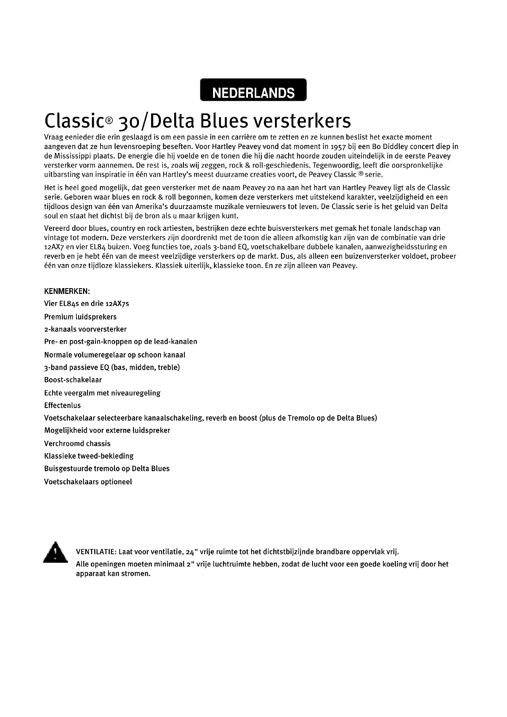 serie. Het is heel goed mogelijk, dat geen versterker met de naam Peavey zo na aan het hart van Hartley Peavey ligt als de Classic serie. Geboren waar blues en rock & roll begonnen, komen deze versterkers met uitstekend karakter, veelzijdigheid en een tijdloos design van één van Amerika’s duurzaamste muzikale vernieuwers tot leven. De Classic serie is het geluid van Delta soul en staat het dichtst bij de bron als u maar krijgen kunt. Vereerd door blues, country en rock artiesten, bestrijken deze echte buisversterkers met gemak het tonale landschap van vintage tot modern. Deze versterkers zijn doordrenkt met de toon die alleen afkomstig kan zijn van de combinatie van drie 12AX7 en vier EL84 buizen. Voeg functies toe, zoals 3-band EQ, voetschakelbare dubbele kanalen, aanwezigheidssturing en reverb en je hebt één van de meest veelzijdige versterkers op de markt. Dus, als alleen een buizenversterker voldoet, probeer één van onze tijdloze klassiekers. Klassiek uiterlijk, klassieke toon. En ze zijn alleen van Peavey. KENMERKEN: Vier EL84s en drie 12AX7s Premium luidsprekers 2-kanaals voorversterker Pre- en post-gain-knoppen op de lead-kanalen Normale volumeregelaar op schoon kanaal 3-band passieve EQ (bas, midden, treble) Boost-schakelaar Echte veergalm met niveauregeling Effectenlus Voetschakelaar selecteerbare kanaalschakeling, reverb en boost (plus de Tremolo op de Delta Blues) Mogelijkheid voor externe luidspreker Verchroomd chassis Klassieke tweed-bekleding Buisgestuurde tremolo op Delta Blues Voetschakelaars optioneel NEDERLANDS VENTILATIE: Laat voor ventilatie, 24" vrije ruimte tot het dichtstbijzijnde brandbare oppervlak vrij. Alle openingen moeten minimaal 2" vrije luchtruimte hebben, zodat de lucht voor een goede koeling vrij door het apparaat kan stromen.Classic