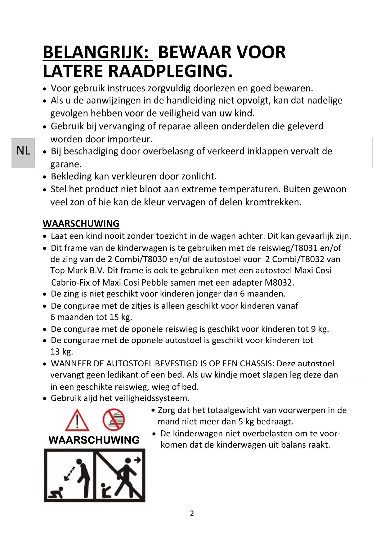 - De stabiliteit van de kinderwagen kan worden beïnvloed als er gewicht aan de handvaen en/of aan de achterzijde van de rugleuning en/of aan de zijdes van de kinderwagen wordt gehangen. De kinderwagen kan overhellen en uw kind bezeren.