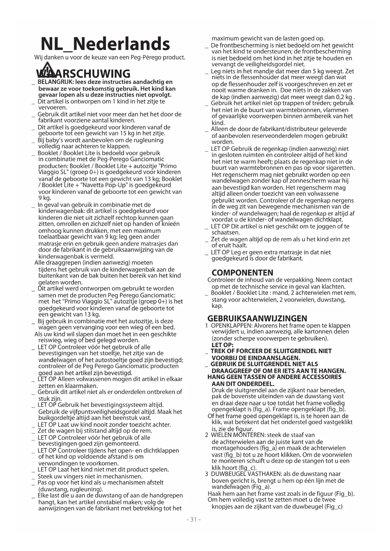 AAN DIT ONDERDEEL. Druk de sluitgrendel aan de zijkant naar beneden, pak de bovenste uiteinden van de duwstang vast en draai deze naar u toe totdat het frame volledig opengeklapt is (fig_a). Frame opengeklapt (fig_b). Of het frame goed opengeklapt is, is te horen aan de klik, wat betekent dat het onderstel goed vastgeklikt is, zie de figuur. 2 WIELEN MONTEREN: steek de staaf van de achterwielen aan de juiste kant van de montagehouders (fig_a) en maak de achterwielen vast (fig_b) tot u ze hoort klikken. Om de voorwielen te monteren schuift u deze op de stangen tot u een klik hoort (fig_c). 3 DUWBEUGEL VASTHAKEN: als de duwstang naar boven gericht is, brengt u hem op één lijn met de wandelwagen (Fig_a). Haak hem aan het frame vast zoals in de figuur (Fig_b). Om hem volledig vast te zetten moet u de twee knopjes aan de zijkant van de duwbeugel (Fig_c) NL_Nederlands Wij danken u voor de keuze van een Peg-Pérego product. WAARSCHUWING _ BELANGRIJK: lees deze instructies aandachtig en bewaar ze voor toekomstig gebruik. Het kind kan gevaar lopen als u deze instructies niet opvolgt. _ Dit artikel is ontworpen om 1 kind in het zitje te vervoeren. _ Gebruik dit artikel niet voor meer dan het het door de fabrikant voorziene aantal kinderen. _ Dit artikel is goedgekeurd voor kinderen vanaf de geboorte tot een gewicht van 15 kg in het zitje. _ Bij baby’s wordt aanbevolen om de rugleuning volledig naar achteren te klappen. _ Booklet / Booklet Lite is bedoeld voor gebruik in combinatie met de Peg-Perego Ganciomatic producten: Booklet / Booklet Lite + autozitje "Primo Viaggio SL" (groep 0+) is goedgekeurd voor kinderen vanaf de geboorte tot een gewicht van 13 kg; Booklet / Booklet Lite + "Navetta Pop-Up" is goedgekeurd voor kinderen vanaf de geboorte tot een gewicht van 9 kg. _ In geval van gebruik in combinatie met de kinderwagenbak: dit artikel is goedgekeurd voor kinderen die niet uit zichzelf rechtop kunnen gaan zitten, omrollen en zichzelf niet op handen of knieën omhoog kunnen drukken, met een maximum toelaatbaar gewicht van 9 kg; leg geen ander matrasje erin en gebruik geen andere matrasjes dan door de fabrikant in de gebruiksaanwijzing van de kinderwagenbak is vermeld. Alle draaggrepen (indien aanwezig) moeten tijdens het gebruik van de kinderwagenbak aan de buitenkant van de bak buiten het bereik van het kind gelaten worden. _ Dit artikel werd ontworpen om gebruikt te worden samen met de producten Peg Perego Ganciomatic: met het “Primo Viaggio SL” autozitje (groep 0+) is het goedgekeurd voor kinderen vanaf de geboorte tot een gewicht van 13 kg. _ Bij gebruik in combinatie met het autozitje, is deze wagen geen vervanging voor een wieg of een bed. Als uw kind wil slapen dan moet het in een geschikte reiswieg, wieg of bed gelegd worden. _ LET OP Controleer vóór het gebruik of alle bevestigingen van het stoeltje, het zitje van de wandelwagen of het autostoeltje goed zijn bevestigd; controleer of de Peg Perego Ganciomatic producten goed aan het artikel zijn bevestigd. _ LET OP Alleen volwassenen mogen dit artikel in elkaar zetten en klaarmaken. _ Gebruik dit artikel niet als er onderdelen ontbreken of stuk zijn. _ LET OP Gebruik het bevestigingssysteem altijd. Gebruik de vijfpuntsveiligheidsgordel altijd. Maak het buikgordeltje altijd aan het beenstuk vast. _ LET OP Laat uw kind nooit zonder toezicht achter. _ Zet de wagen bij stilstand altijd op de rem. _ LET OP Controleer vóór het gebruik of alle bevestigingen goed zijn gemonteerd. _ LET OP Controleer tijdens het open- en dichtklappen of het kind op voldoende afstand is om verwondingen te voorkomen. _ LET OP Laat het kind niet met dit product spelen. _ Steek uw vingers niet in mechanismen. _ Pas op voor het kind als u mechanismen afstelt (duwstang, rugleuning). _ Elke last die u aan de duwstang of aan de handgrepen hangt, kan het artikel onstabiel maken; volg de aanwijzingen van de fabrikant met betrekking tot het- 32 - indrukken om de duwbeugel er volledig in te doen tot u een klik hoort (Fig_d). 4 MANDJE MONTEREN: als deze omlaag staat brengt u de stang van de mand omhoog in horizontale positie. Druk op de zilveren knoppen onder de metalen buis van de mand aan de achterkant van de wandelwagen (fig_a) en verwijder de metalen buis (fig_b). Steek de buis met de twee zilveren knoppen naar beneden gedraaid in de zoom van de stof aan de achterkant van de mand (fig_c).. Steek de buis er weer op de betreffende plaatsen in (fig_d). 5 Maak de twee bovenste ogen van de mand vast aan de twee grijze knoppen die aan de zijkanten van de steunen van de buis van de mand aangebracht zijn. Kijk of de ogen open gaan (fig_e). Verwijder het karton van de achterste stang (fig_f). BELANGRIJK! Maak de twee onderste ogen van de mand vast aan de twee grijze knoppen op de achterste stang. Kijk of de ogen open gaan. LET OP! Als dit niet op de juiste manier wordt gedaan, kan de mand het gewicht van de inhoud niet goed dragen. Maak de voorste flapjes van de mand vast aan de grijze knoppen van het frame (fig_g). BEKIJK ONZE INSTRUCTIEVIDEO VOOR DE MONTAGE OP HET