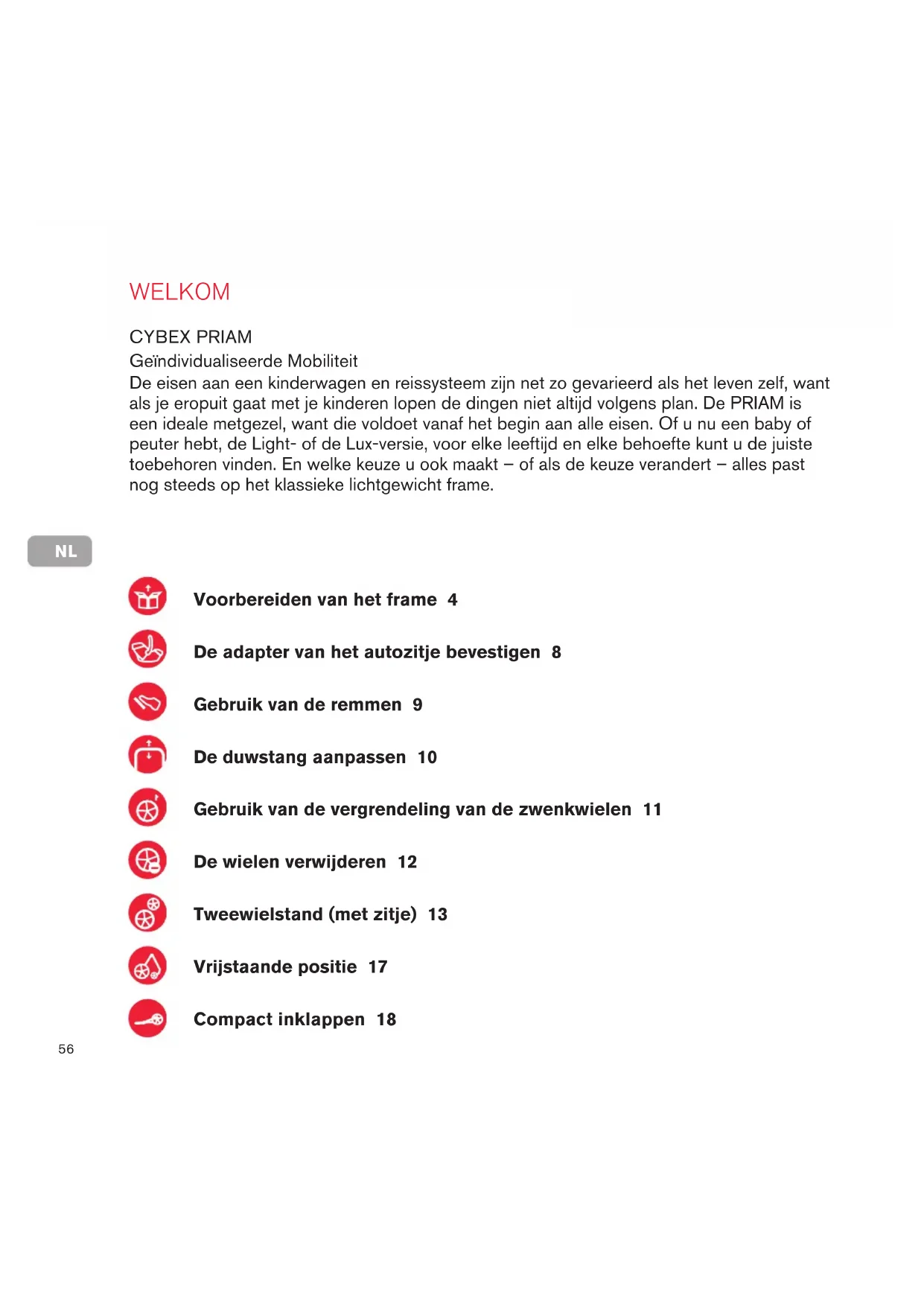 WELKOM De eisen aan een kinderwagen en reissysteem zijn net zo gevarieerd als het leven zelf, want als je eropuit gaat met je kinderen lopen de dingen niet altijd volgens plan. De PRIAM is een ideale metgezel, want die voldoet vanaf het begin aan alle eisen. Of u nu een baby of peuter hebt, de Light- of de Lux-versie, voor elke leeftijd en elke behoefte kunt u de juiste toebehoren vinden. En welke keuze u ook maakt – of als de keuze verandert – alles past nog steeds op het klassieke lichtgewicht frame. Geïndividualiseerde Mobiliteit CYBEX PRIAM Voorbereiden van het frame 4 De adapter van het autozitje bevestigen 8 Gebruik van de remmen 9 De duwstang aanpassen 10 Gebruik van de vergrendeling van de zwenkwielen 11 De wielen verwijderen 12 Tweewielstand (met zitje) 13 Vrijstaande positie 17 Compact inklappen 18NL