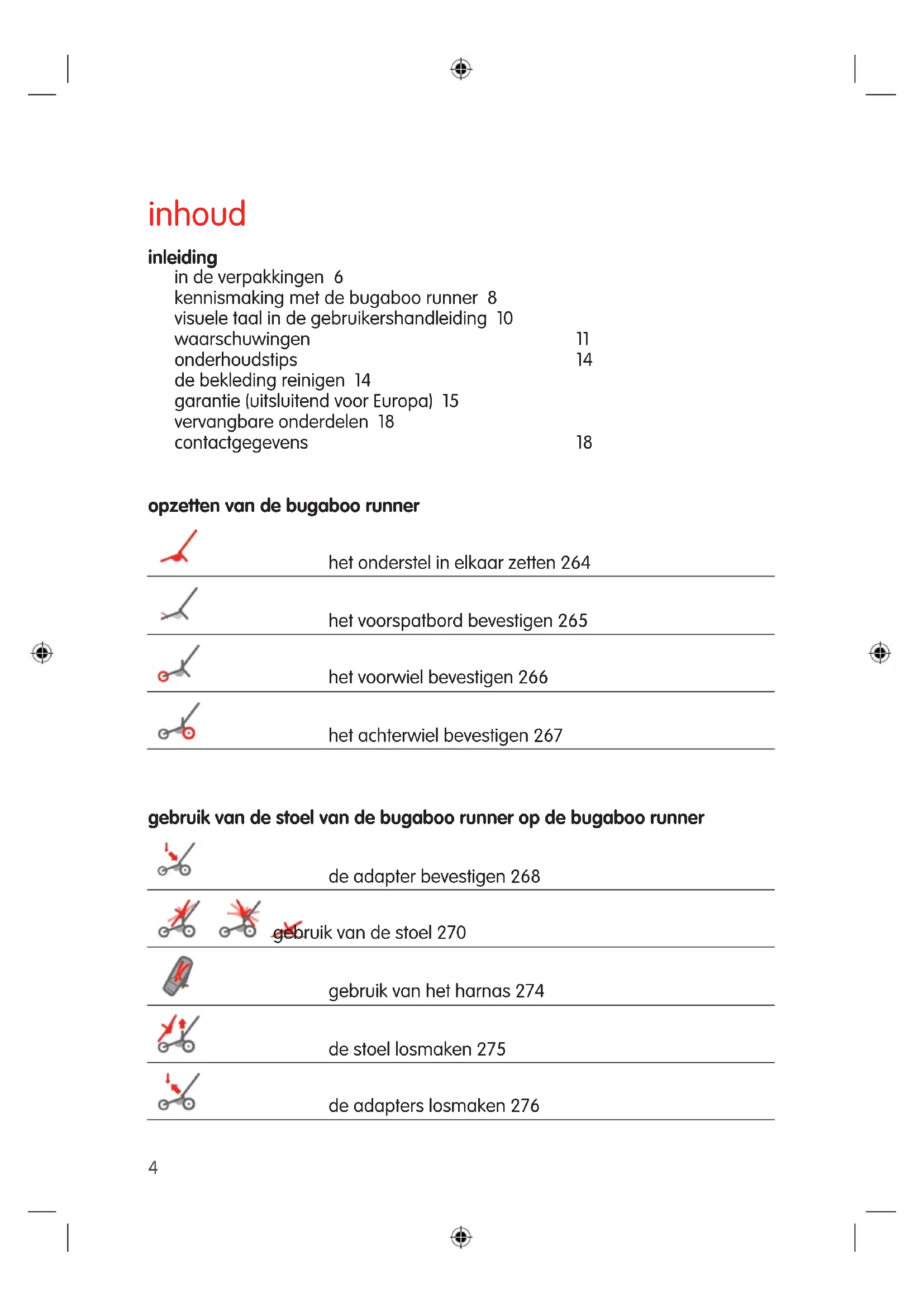 bugaboo runner gebruiksaanwijzing user guide bedienungsanleitung mode d’emploi manual de instrucciones istruzioni per l’uso guia do utilizador oδηγός χρήσης användarhandbok brukerhåndbok brugerguide käyttöopas uživatelská příručka instrukcja obsługi navodila za uporabo kullanıcı kılavuzuNO152 DA168 FR52 NL4 FI184 ES70 EL120 EN20 CS200 IT88 SV136 DE36 PL216 TR248 SL232 PT104inhoud inleiding in de verpakkingen 6 kennismaking met de bugaboo runner 8 visuele taal in de gebruikershandleiding 10 waarschuwingen 11 onderhoudstips 14 de bekleding reinigen 14 garantie (uitsluitend voor Europa) 15 vervangbare onderdelen 18 contactgegevens 18 opzetten van de bugaboo runner het onderstel in elkaar zetten 264 het voorspatbord bevestigen 265 het voorwiel bevestigen 266 het achterwiel bevestigen 267 gebruik van de stoel van de bugaboo runner op de bugaboo runner de adapter bevestigen 268 gebruik van de stoel 270 gebruik van het harnas 274 de stoel losmaken 275 de adapters losmaken 276 4gebruik van de bugaboo runner gebruik van de parkeerrem 277 gebruik van de rem voor het regelen van de snelheid 278 de duwbeugel afstellen 279 de loop van de wielen afstellen 280 het onderstel inklappen 281 het onderstel uitklappen 283 de achterwielen verwijderen 284 het voorwiel verwijderen 285 het bagagenet verwijderen 286 het bagagenet bevestigen 288 gebruik van de polsband 290 de wielen oppompen 291