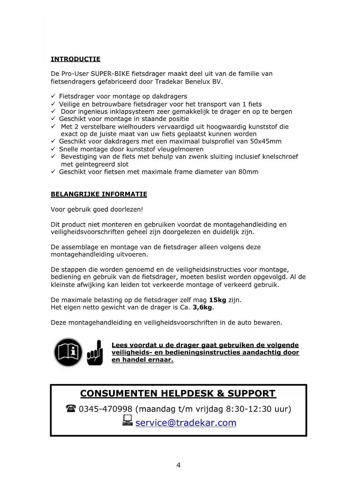 De stappen die worden genoemd en de veiligheidsinstructies voor montage, bediening en gebruik van de fietsdrager,要去en beslist worden opgevolgd. Al dekleinste afwijking kan leiden tot verkeerde montage of verkeerd gebruik.
