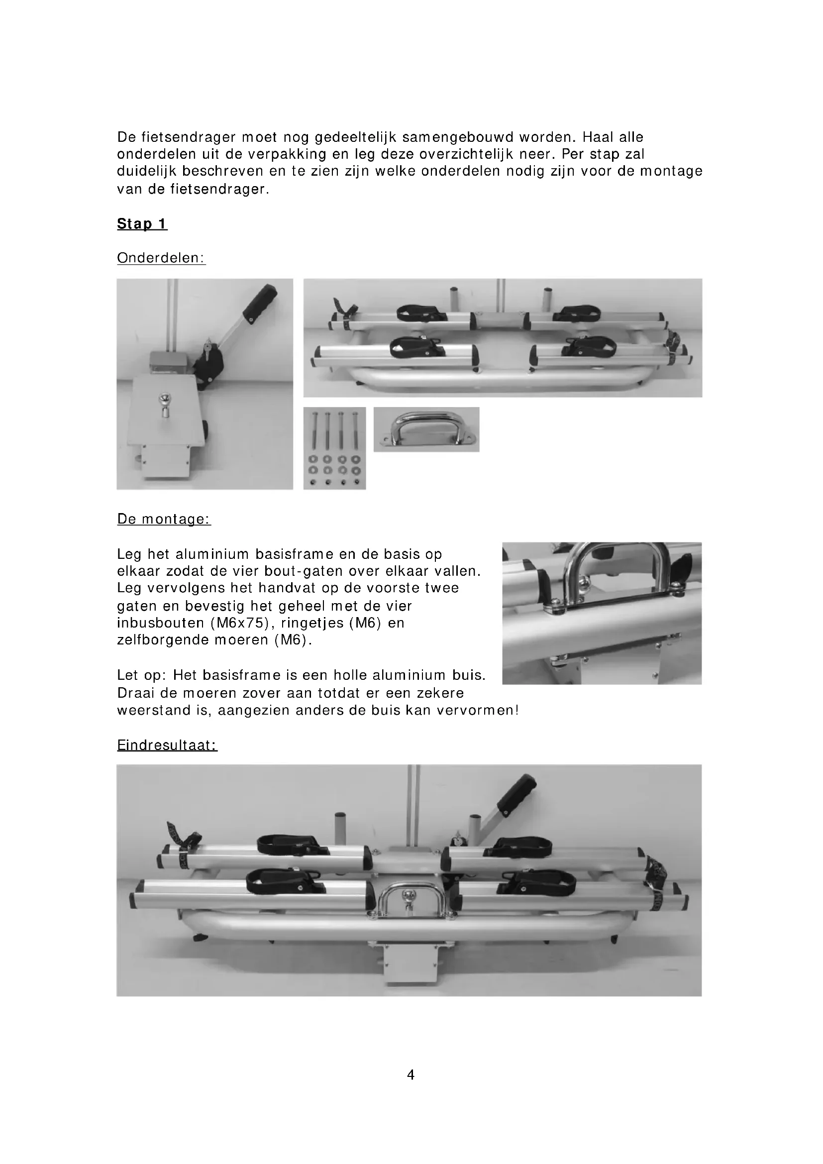 De fietsendrager moet nog gedeeltelijk samengebouwd worden. Haal alle onderdelen uit de verpakking en leg deze overzichtelijk neer. Per stap zal duidelijk beschreven en te zien zijn welke onderdelen nodig zijn voor de montage van de fietsendrager.