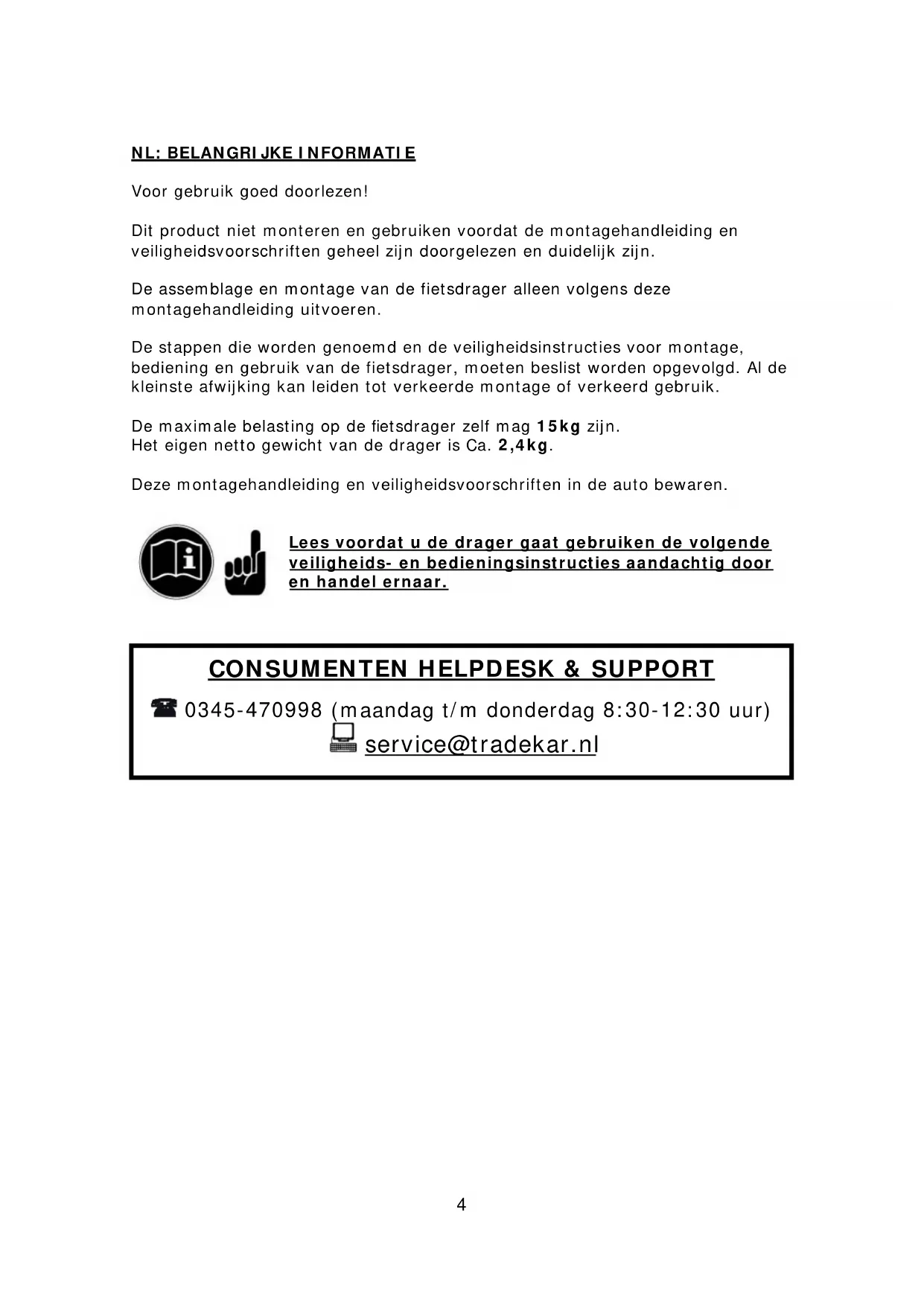 De stappen die worden genoemd en de veiligheidsinstructies voor montage, bediening en gebruik van de fietsdrager,要去en beslist worden opgevolgd. Al dekleinste afwijking kan leiden tot verkeerde montage of verkeerd gebruik.
