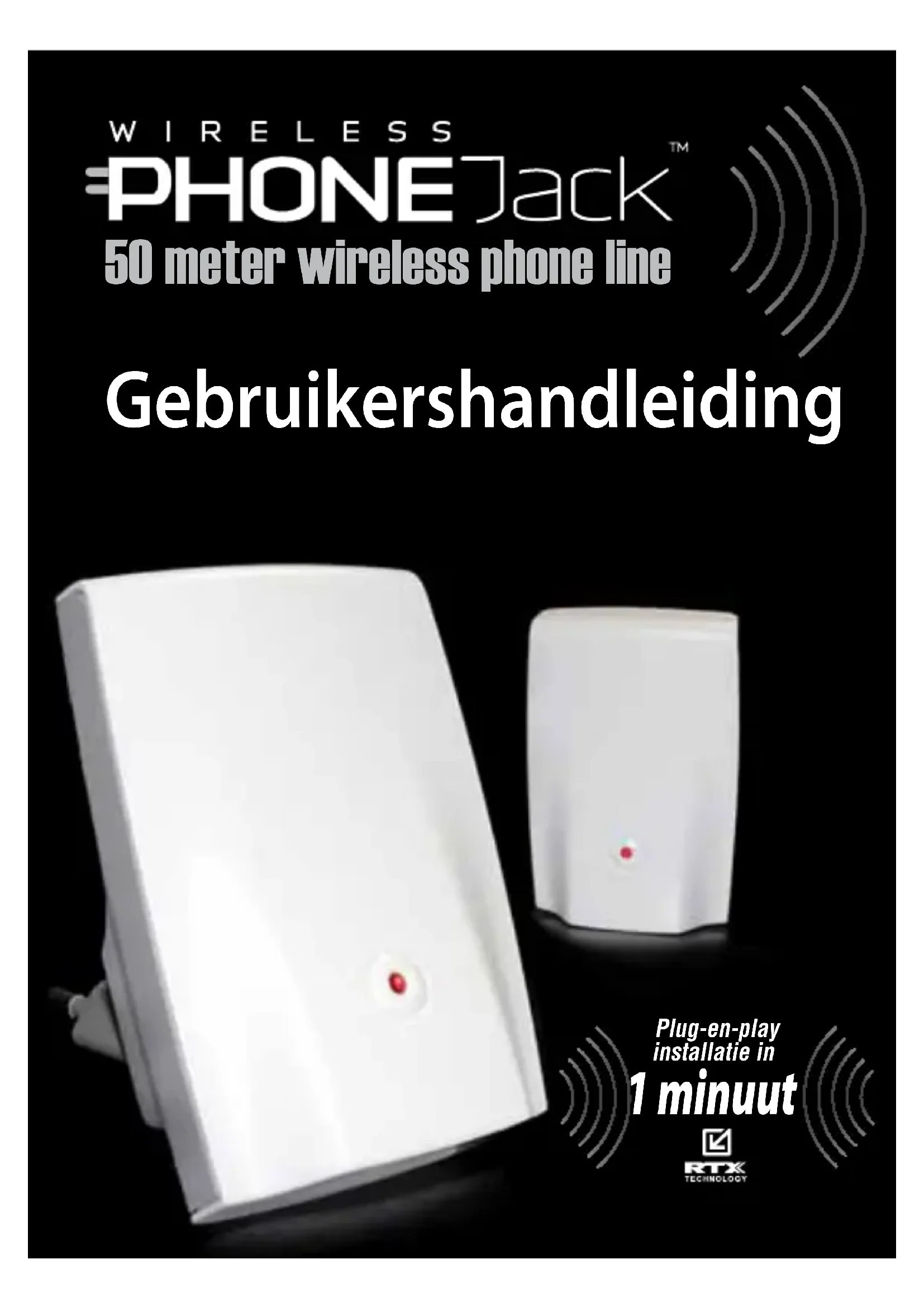 est ustawiony w pozycji “S” Kontrolka na urządzeniu rozszerzającym pulsuje przed rozpoczęciem procedury podłączania Urządzenie rozszerzające zostało już podłączone do innej jednostki podstawowej Włączyćiwyłączyćzasilanie urządzenia rozszerzającego 5 razy, aż kontrolka zapali się na czerwono. Następnie kontynuować instalację dodatkowego urządzenia rozszerzającego %â\VNDZLFD]V\PEROHPVWU]DâNLZWUyMNłFLHUyZQRERF]Q\PPD]D]DGDQLH RVWU]HFXŤ\WNRZQLNDRLVWQLHQLXQLHL]RORZDQHJRÄQLHEH]SLHF]QLHZ\VRNLHJRQDSLŇFLD´ ZHZQłWU]REXGRZ\SURGXNWXNWyUHPRŤHE\ýQDW\OHZ\VRNLHDE\VSRZRGRZDýSRUDŤHQLH „Uwaga” :W\F]NDHOHNWU\F]QDXŤ\ZDQDMHVWGRRGâłF]DQLDXU]łG]HQLDLSRZLQLHQE\ý GRQLHMâDWZ\GRVWŇSSRGF]DVXŤ\WNRZDQLD%\RGâłF]\ýXU]łG]HQLHFDâNRZLFLHRGŢUyGâD ]DVLODQLDZW\F]NDSRZLQQDE\ýZ\MŇWD]JQLD]GNDHOHNWU\F]QHJR *QLD]GNRHOHNWU\F]QHSRZLQQRE\ý]DLQVWDORZDQHZSREOLŤXXU]łG]HQLDLSRZLQLHQE\ýGR QLHJRâDWZ\GRVWŇS1 minuut Plug-en-play installatie in Gebruikershandleiding 50 meter wireless phone line44 BESTE KLANT Hartelijk dank voor de aankoop van onze draadloze telefoonaansluiting Wireless Phone Jack en/of bijkomende uitbreidingseenheid. We hopen dat ons product aan uw verwachtingen zal voldoen. De Wireless Phone Jack is een draadloze en kabelvrije uitbreiding voor de telefoon- aansluiting of VoIP-adapter, geschikt voor een gewone telefoon, modem, fax of satelliet/kabel set-topbox met geïntegreerde modem. Lees dit document aandachtig en volg de bedieningsinstructies en overige informatie. Meer informatie vindt u op onze website: www.wireless-phonejack.com Het CE-symbool duidt aan dat de Wireless Phone Jack voldoet aan de Europese richtlijnen. Hierbij verklaren we dat de Wireless Phone Jack en/of bijkomende uitbreidingseenheden voldoen aan de essentiële vereisten en andere relevante bepalingen van Richtlijn 1999/5/EG. Copyright ©. Alle rechten voorbehouden. Elke vorm van verveelvoudiging of reproductie van het product of de bijbehorende gebruikershandleiding is streng verboden. Dit product is vervaardigd voor RTX Products A/S.45 UITPAKKEN Haal de eenheden voorzichtig uit de verpakking. Merkt u uitwendige beschadig- ingen op, neem de Wireless Phone Jack dan NIET in gebruik. Neem onmiddellijk contact op met de verdeler of transportfirma. VERPAKKINGSINHOUD: