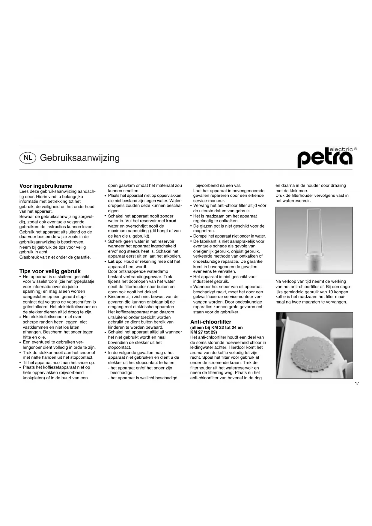 ● Uit normaal ● milde, aromatische koffie Wanneer u de knop op de gewenste stand heeft gezet, springt het controle- lampje aan en begint de filtering. Ingebruikname Het deel van het snoer dat u niet nodig heeft, kunt u in de opbergruimte stoppen. Indien u het apparaat voor de eerste keer gebruikt of lange tijd niet gebruikt heeft, laat dan een maximale hoeveel- heid water doorlopen zonder gemalen koffie en spoel hierna het filter en de pot om met heet water. Bereiding van koffie Vul het reservoir met koud water. Op de maatverdeling ziet u het aantal koppen koffie van 125 ml. dat u gaat zetten. De verdeling op de glazen pot geeft eveneens de hoeveelheid koud water voor normale koppen van 125 ml. en kleine koppen van 100 ml. aan. De ver- deling slaat niet op de bereide koffie aangezien een deel van het water tijdens het filteren verdampt. Draai de filterhouder naar buiten en plaats een filter van maat 1 x 4 in de houder. Vouw echter eerst de rand van het filter om, omdat het filterzakje niet boven de rand van de houder mag uit- komen. Schep de gewenste hoeveelheid gemalen koffie in het zakje. Afhankelijk van uw persoonlijke smaak kunt u uit- gaan van 5 - 7 gram fijngemalen koffie per kop. Indien de koffie te fijn gemalen is, kan het water niet goed door het filter heen, wat tot overlopen zal leiden. Steek de stekker in een geaard stop- contact en zet de schakelaar om. Het fil- teren begint wanneer het controlelampje aanspringt. Na het doorlopen van het water kunt de pot wegnemen. Een druppelstop voorkomt dat er nog water uit het filter kan lopen. Door het warmhoudplaatje wordt de koffie in de glazen pot automatisch op serveertemperatuur gehouden totdat het apparaat wordt uitgeschakeld. De thermoskan moet u na het filteren met het schroefdeksel afsluiten om af- koelen te voorkomen. Schakel het appa- 18raat daarna uit. Houd u er rekening mee dat het aroma minder wordt naarmate de koffie langer wordt warmgehouden. Oploskoffie doet u zonder filterzakje direct in de houder. Thee maakt u door het zakje in de pot te hangen. Daarbij dient de lege filter in de houder geplaatst te worden. Gebruikte theezakjes, filterzakjes en koffiedik kunnen tot compost worden verwerkt. Toebehoren Ga naar uw dealer voor de volgende toebehoren: Anti-chloorfilter ACF 3 Drie extra filters, alleen voor KM 22 - 24 en KM 27- 29 Edelstalen thermoskan EK 20 Thermoskan met doorloopdeksel voor KM 20 - 24 Glazen pot GK 20 Glazen pot met deksel voor KM 25 - 29 Permanent Goldaroma filter GF1 Voor alle apparaten Reiniging Neem de stekker uit het stopcontact en laat het apparaat afkoelen. Dompel het apparaat niet onder in water, maar neem het af met een vochtige doek met eventueel een klein beetje afwasmiddel. Wrijf het oppervlak hierna meteen droog. Maak geen gebruik van bijtende of schu- rende schoonmaakmiddelen. De filterhouder en de glazen pot kunt u afspoelen onder stromend water of in de vaatwasser zetten. Dompel de edelstalen thermoskan niet onder in water. Maak de kan van binnen desgewenst schoon met een afwas- borsteltje. Mocht zich na verloop van tijd aanslag tegen de binnenzijde van de kan hebben gevormd dan kunt u deze verwijderen met behulp van een tablet voor het reinigen van tandprothesen: vul hiervoor de kan met water, voeg het tablet toe en laat de oplossing enkele uren inwerken. Spoel de kan daarna enkele malen goed uit. Ontkalken Zoals alle andere heetwaterapparaten moet ook dit koffiezetapparaat regelma- tig ontkalt worden. Dit is vooral nodig wanneer u merkt dat het doorlopen van water langer duurt dan normaal en het apparaat meer geluid begint te maken. Onderstaand treft u enkele richtlijnen ann, uitgaande van een dagelijks gebruik van het apparaat. Voor informatie over de hardheid van het water in uw omgeving kunt u contact opnemen met het plaatselijke waterlei- dingbedrijf. Gebruik alleen ontkalingsmiddelen die normaal verkrijgbaar zijn en die geschikt zijn voor apparaten met een edelstalen kan. Neem altijd de aanwijzingen van de fabrikant in acht. Bij apparaten met een anti-chloorfilter moet u dit filter vóór het ontkalken verwijderen. Leg een papieren filterzakje in de hou- der en zet de pot op zijn plaats. Vul het reservoir met 1 liter water waarin het middel volgens de instructies van de fabrikant is verdund of opgelost. Wanneer u het apparaat tijdens het doorlopen van de vloeistof een paar keer gedurende enkele minuten uitscha- kelt, dan kan het middel goed inwerken op de kalkaanslag. Herhaal deze hande- lingen, wel steeds met nieuwe vloeistof, totdat het apparaat weer een normaal geluid maakt. Vul het reservoir nooit met hete ontkal- kingsvloeistof. Let op: laat na het ontkalken altijd 2 keer een maximale hoeveelheid leiding- water via het reservoir door het apparaat lopen. Schade aan het apparaat als gevolg van het niet juist opvolgen van de ont- kalkingsvoorschriften valt niet onder de garantie. Hardheid Wanneer water ontkalken 1 zacht om de 6 maanden 2 middelhard om de 3 maanden 3 en 4 hard elke maand Dit apparaat voldoet aan de EU-richtlijnen nr. 73/23 EEG en nr. 89/336 EWG. Technische wijzigingen voorbehouden. Verpakkingsmateriaal op verantwoorde wijze weggooien. 19petra-electric Kundendienst Greisbacherstraße 6 D-89331 Burgau Änderungen vorbehalten - 06/02 - 4798 0193