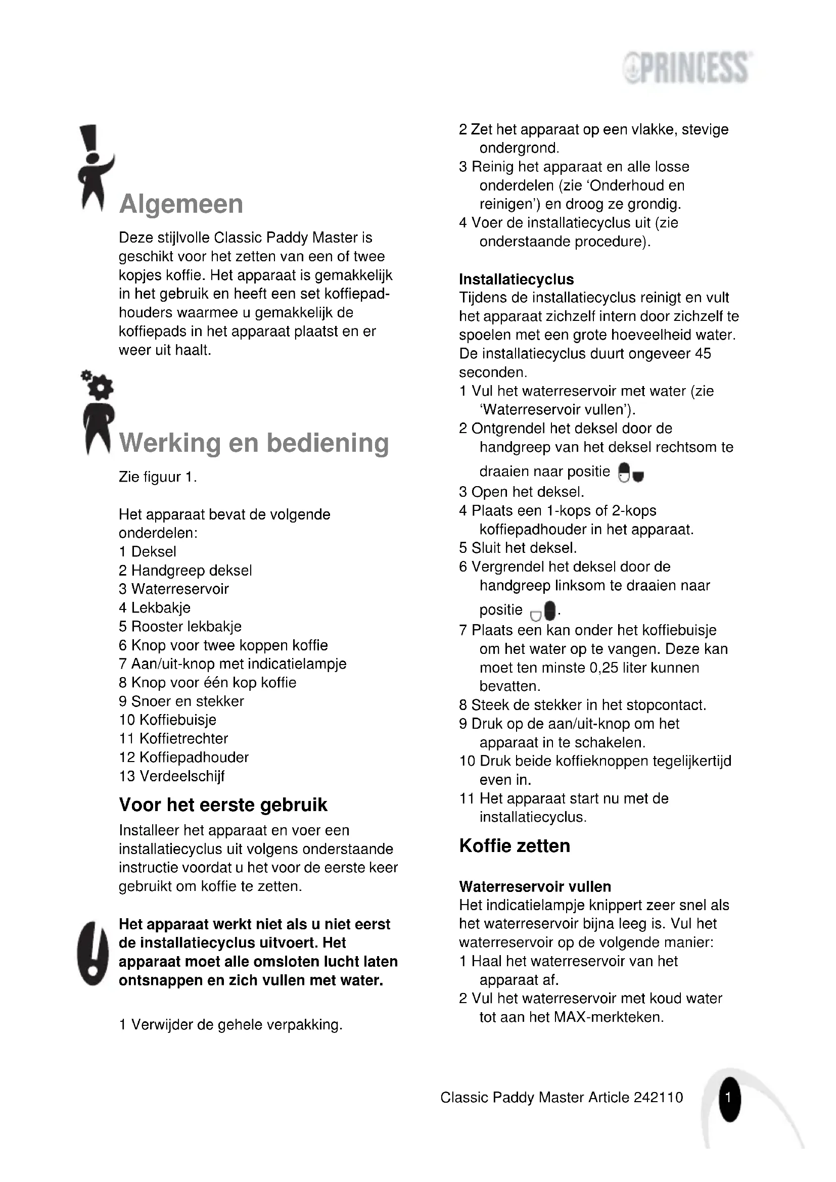 Princess_Classic_Paddy_Master_omslag.fm Page 2 Wednesday, August 8, 2007 10:36 AM1 Classic Paddy Master Article 242110 Algemeen Deze stijlvolle Classic Paddy Master is geschikt voor het zetten van een of twee kopjes koffie. Het apparaat is gemakkelijk in het gebruik en heeft een set koffiepad- houders waarmee u gemakkelijk de koffiepads in het apparaat plaatst en er weer uit haalt. Werking en bediening Zie figuur 1. Het apparaat bevat de volgende onderdelen: 1 Deksel 2 Handgreep deksel 3 Waterreservoir 4 Lekbakje 5 Rooster lekbakje 6 Knop voor twee koppen koffie 7 Aan/uit-knop met indicatielampje 8 Knop voor één kop koffie 9 Snoer en stekker 10 Koffiebuisje 11 Koffietrechter 12 Koffiepadhouder 13 Verdeelschijf Voor het eerste gebruik Installeer het apparaat en voer een installatiecyclus uit volgens onderstaande instructie voordat u het voor de eerste keer gebruikt om koffie te zetten. Het apparaat werkt niet als u niet eerst de installatiecyclus uitvoert. Het apparaat moet alle omsloten lucht laten ontsnappen en zich vullen met water. 1 Verwijder de gehele verpakking. 2 Zet het apparaat op een vlakke, stevige ondergrond. 3 Reinig het apparaat en alle losse onderdelen (zie ‘Onderhoud en reinigen’) en droog ze grondig. 4 Voer de installatiecyclus uit (zie onderstaande procedure). Installatiecyclus Tijdens de installatiecyclus reinigt en vult het apparaat zichzelf intern door zichzelf te spoelen met een grote hoeveelheid water. De installatiecyclus duurt ongeveer 45 seconden. 1 Vul het waterreservoir met water (zie ‘Waterreservoir vullen’). 2 Ontgrendel het deksel door de handgreep van het deksel rechtsom te draaien naar positie . 3 Open het deksel. 4 Plaats een 1-kops of 2-kops koffiepadhouder in het apparaat. 5 Sluit het deksel. 6 Vergrendel het deksel door de handgreep linksom te draaien naar positie . 7 Plaats een kan onder het koffiebuisje om het water op te vangen. Deze kan moet ten minste 0,25 liter kunnen bevatten. 8 Steek de stekker in het stopcontact. 9 Druk op de aan/uit-knop om het apparaat in te schakelen. 10 Druk beide koffieknoppen tegelijkertijd even in. 11 Het apparaat start nu met de installatiecyclus. Koffie zetten Waterreservoir vullen Het indicatielampje knippert zeer snel als het waterreservoir bijna leeg is. Vul het waterreservoir op de volgende manier: 1 Haal het waterreservoir van het apparaat af. 2 Vul het waterreservoir met koud water tot aan het MAX-merkteken. Princess_Classic_Paddy_Master_242110.book Page 1 Thursday, November 1, 2007 2:19 PM2 Classic Paddy Master Article 242110 3 Plaats het waterreservoir terug op het apparaat. Koffie zetten