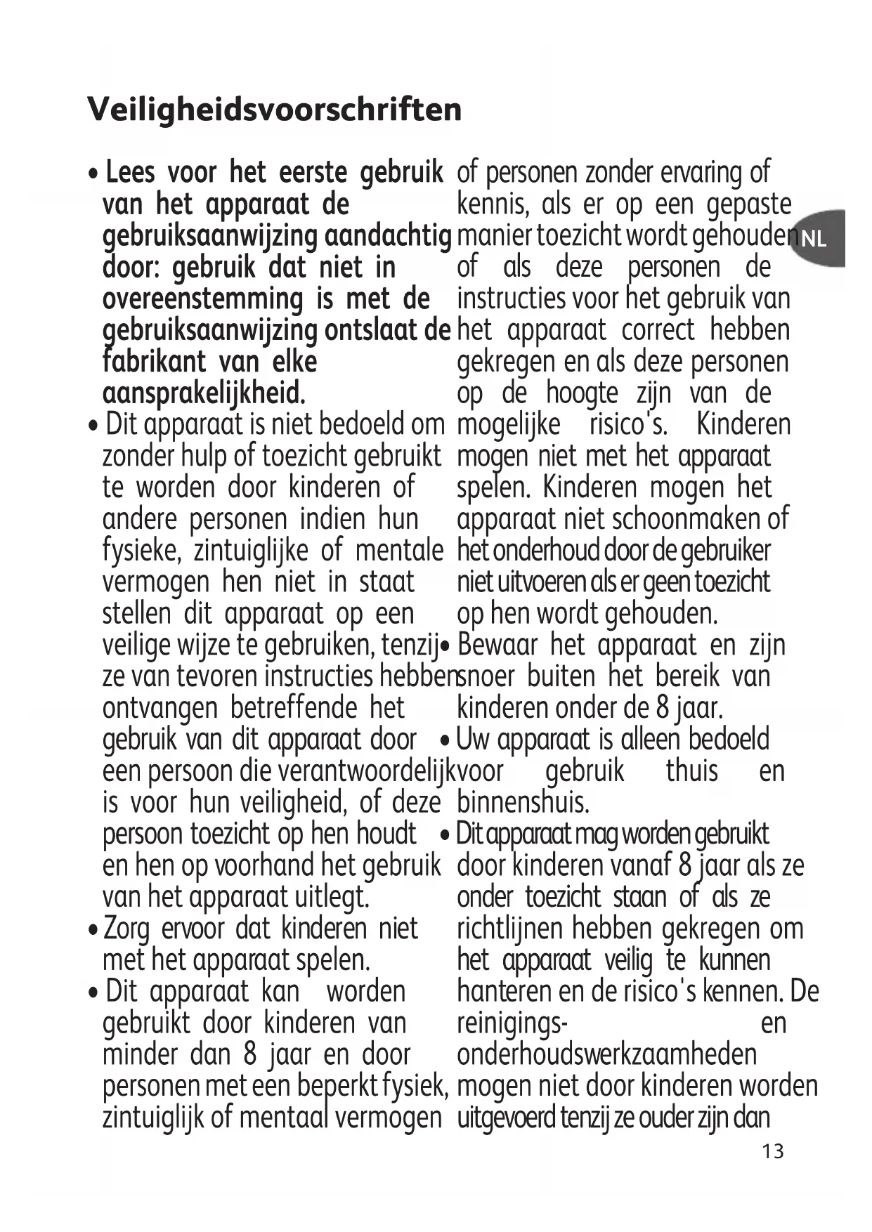- Dit apparaat mag worden gebruikt door kinderen vanaf 8 jaar als ze onder toezicht staan of als ze richtlijnen hebben gekregen om het apparaat veilig te kunnen hanteren en de risico's kennen. De reinigings- en onderhoudswerkzaamheden mogen niet door kinderen worden uitgevoerd tenzij ze ouder zijn dan Veiligheidsvoorschriften8 jaar en onder toezicht staan van een volwassene.