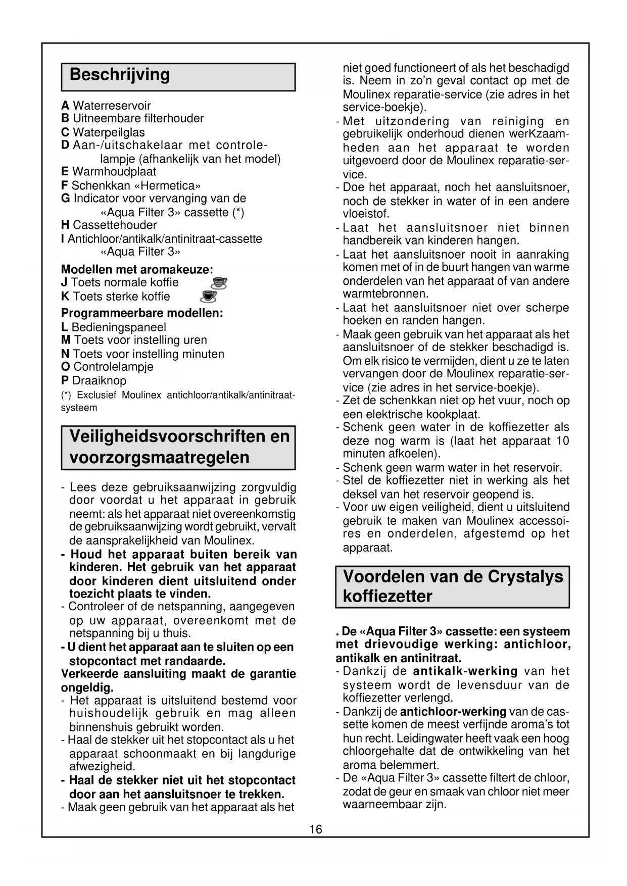Crystalys.EC1/3.Eu11 17/10/00, 11:171415 . Verwenden Sie die Kartusche „Aqua Filter 3“ nur mit Trinkwasser. - Ihre Kaffeemaschine ist auch ohne Kartusche „Aqua Filter 3“ funktionstüchtig. Allerdings zeigt die Wasserstandsanzeige ohne die eingesetzte Kartusche „Aqua Filter 3“ nicht korrekt an. Deshalb dürfen Sie dann nur max. 8 Tassen Wasser einfüllen, sonst riskieren Sie, daß die Kanne überläuft. . Entkalkung Um langfristig ein gutes Kaffee-Ergebnis zu garantieren, muß der Kaffeeautomat nach ca. 80 Durchläufen entkalkt werden. . Zum Entkalken verwenden Sie bitte: . entweder ein Päckchen Entkalker für Kaffeemaschinen, den Sie zuvor in 2 großen Tassen Wasser (ca. 30 cl) aufgelöst haben . oder zwei große Tassen Essigessenz - Ziehen Sie die Kartusche „Aqua Filter 3“ mit dem Kartuschenträger aus der Kaffee- maschine. - Gießen Sie die Mischung in den Wasserbehälter (A) und schalten Sie die Kaffeemaschine ein (ohne Kaffeemehl). - Lassen Sie die einer Tasse entsprechende Menge in die Kaffeekanne laufen, dann schalten Sie die Kaffeemaschine ab. - Lassen Sie die restliche Lösung eine Stunde im Gerät einwirken. - Schalten Sie die Kaffeemaschine wieder ein, damit die Lösung durchlaufen kann. - Spülen Sie die Kaffeemaschine 3 x mit klarem Wasser durch (8 Tassen). - Setzen Sie den Kartuschenträger wieder mit einer neuen Kartusche „Aqua Filter 3“ ein. Achtung: Halten Sie das Entkalkungsmittel von Kindern fern. Reinigung - Ziehen Sie den Netzstecker. - Das Gerät niemals in Wasser tauchen oder unter fließendes Wasser halten. - Um ausgelaugtes Kaffeemehl zu entsorgen, ziehen Sie den herausnehmbaren Filter (B) aus der Kaffeemaschine. - Die Kaffeekanne (F) und der heraus- nehmbare Filter (B) können in der Spülmaschine gereinigt werden (oberer Korb). - Der Kartuschenträger (H) darf nicht in der Spülmaschine gereinigt werden, sondern nur unter fließendem Wasser abgespült werden. Was tun, wenn Ihr Gerät nicht funktioniert? - Prüfen Sie, ob Ihr Gerät am Strom angeschlossen ist. - Überzeugen Sie sich, daß der Schalter oder der Funktionswahlschalter auf „I“ steht. Der Wasserdurchlauf dauert zu lange, und die Kaffeemaschine verursacht übermä- ßige Kochgeräusche: - Überzeugen Sie sich, daß der Aromaschalter (je nach Modell) auf steht. - Ihre Kaffeemaschine ist wahrscheinlich verkalkt. Ihre Kaffeekanne läuft über: - Sie haben vergessen, die Kartusche „Aqua Filter 3“ einzusetzen und haben zuviel Wasser eingefüllt. - Ihre Kaffeekanne war zu Beginn der Kaffeezubereitung nicht leer. Ihr Kaffeefilter läuft über: - Ihre Kaffeekanne steht nicht korrekt auf der Warmhalteplatte und konnte so das Tropf- Stopp-System des Filterträgers nicht aktivieren. - Sie haben zuviel Kaffeemehl, ein zu fein gemahlenes oder für eine Kaffeemaschine ungeeignetes Kaffeemehl verwendet. Sie haben alle Anweisungen befolgt, aber Ihr Gerät funktioniert immer noch nicht? Dann wenden Sie sich bitte an den Moulinex- Kundendienst (siehe Liste im Moulinex- Serviceheft). Zubehör - Aromakanne: Bestell-Nr. EC6 - 2 Kartuschen „Aqua Filter 3“: Bestell-Nr. EC8 Crystalys.EC1/3.Eu11 17/10/00, 11:171516 Beschrijving A Waterreservoir B Uitneembare filterhouder C Waterpeilglas D Aan-/uitschakelaar met controle- lampje (afhankelijk van het model) E Warmhoudplaat F Schenkkan «Hermetica» G Indicator voor vervanging van de «Aqua Filter 3» cassette (*) H Cassettehouder I Antichloor/antikalk/antinitraat-cassette «Aqua Filter 3» Modellen met aromakeuze: J Toets normale koffie K Toets sterke koffie Programmeerbare modellen: L Bedieningspaneel M Toets voor instelling uren N Toets voor instelling minuten O Controlelampje P Draaiknop (*) Exclusief Moulinex antichloor/antikalk/antinitraat- systeem Veiligheidsvoorschriften en voorzorgsmaatregelen - Lees deze gebruiksaanwijzing zorgvuldig door voordat u het apparaat in gebruik neemt: als het apparaat niet overeenkomstig de gebruiksaanwijzing wordt gebruikt, vervalt de aansprakelijkheid van Moulinex. - Houd het apparaat buiten bereik van kinderen. Het gebruik van het apparaat door kinderen dient uitsluitend onder toezicht plaats te vinden. - Controleer of de netspanning, aangegeven op uw apparaat, overeenkomt met de netspanning bij u thuis. - U dient het apparaat aan te sluiten op een stopcontact met randaarde. Verkeerde aansluiting maakt de garantie ongeldig. - Het apparaat is uitsluitend bestemd voor huishoudelijk gebruik en mag alleen binnenshuis gebruikt worden. - Haal de stekker uit het stopcontact als u het apparaat schoonmaakt en bij langdurige afwezigheid. - Haal de stekker niet uit het stopcontact door aan het aansluitsnoer te trekken. - Maak geen gebruik van het apparaat als het niet goed functioneert of als het beschadigd is. Neem in zo’n geval contact op met de Moulinex reparatie-service (zie adres in het service-boekje). - Met uitzondering van reiniging en gebruikelijk onderhoud dienen werKzaam- heden aan het apparaat te worden uitgevoerd door de Moulinex reparatie-ser- vice. - Doe het apparaat, noch het aansluitsnoer, noch de stekker in water of in een andere vloeistof. - Laat het aansluitsnoer niet binnen handbereik van kinderen hangen. - Laat het aansluitsnoer nooit in aanraking komen met of in de buurt hangen van warme onderdelen van het apparaat of van andere warmtebronnen. - Laat het aansluitsnoer niet over scherpe hoeken en randen hangen. - Maak geen gebruik van het apparaat als het aansluitsnoer of de stekker beschadigd is. Om elk risico te vermijden, dient u ze te laten vervangen door de Moulinex reparatie-ser- vice (zie adres in het service-boekje). - Zet de schenkkan niet op het vuur, noch op een elektrische kookplaat. - Schenk geen water in de koffiezetter als deze nog warm is (laat het apparaat 10 minuten afkoelen). - Schenk geen warm water in het reservoir. - Stel de koffiezetter niet in werking als het deksel van het reservoir geopend is. - Voor uw eigen veiligheid, dient u uitsluitend gebruik te maken van Mouline