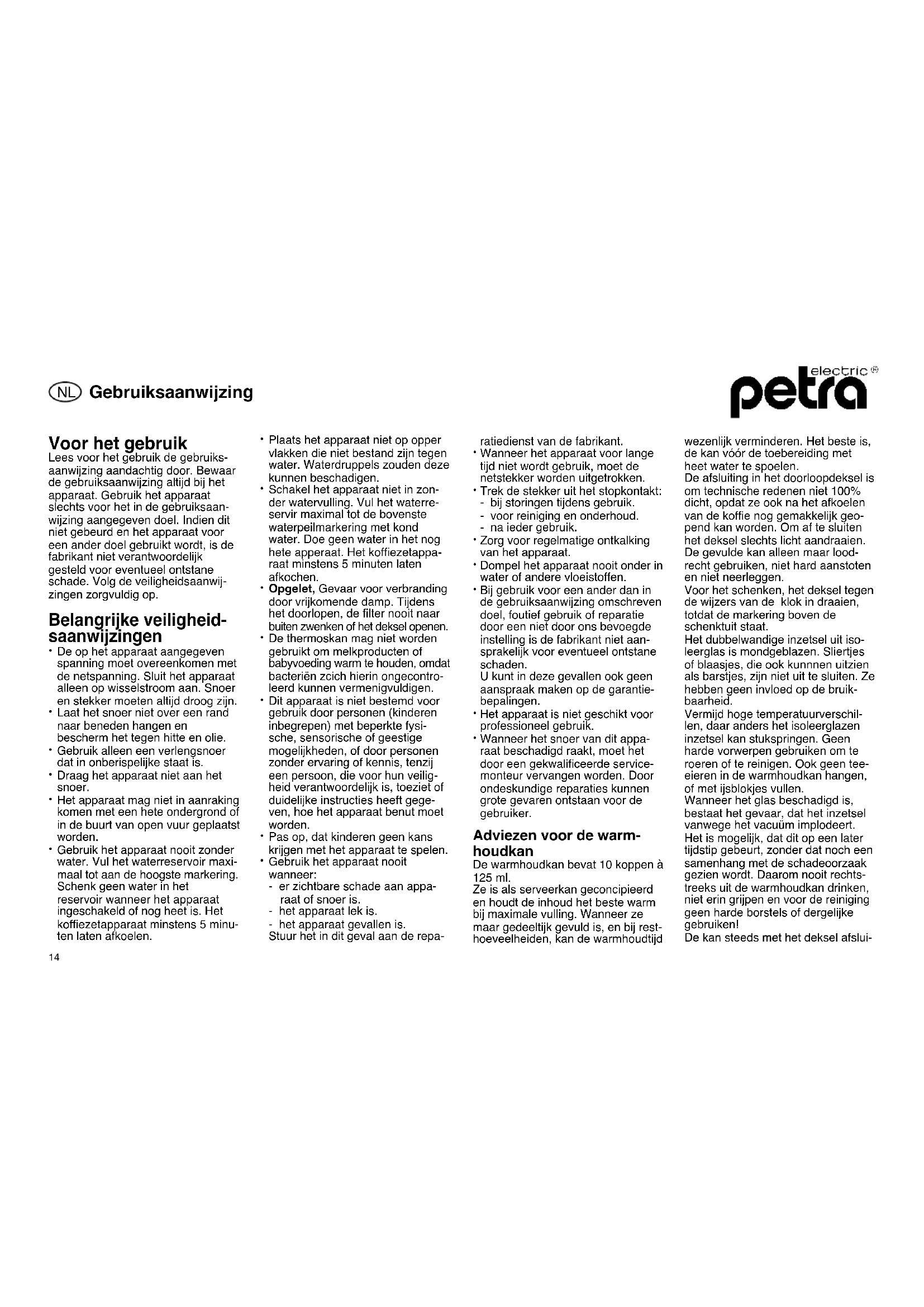 Gebruiksaanwijzing15 ten en niet onbeheerd in de buurt van kinderen laten staan! Schades aan het isoleerglazen inzetsel zijn van de garantie uitges- loten. Wij zijn niet aansprakelijk voor gevolgschades, die door onoplettend gebruik ontstaan. Isoleerglazen inzetsel vervangen U kunt een reserve-inzetsel uit iso- leerglas daar verkrijgen, waar u het apparaat hebt gekocht, of direct bestellen bij petra-electric. Vermeld hiertoe de exacte typebenaming. Deze vind u op de onderkant van het apparaat. Bij het vervangen van het isoleergla- zen inzetsel, moet u een veiligheids- bril en veiligheidshandschoenen dra- gen en erop letten, dat geen personen in de buurt zijn. De bodem van de isoleerkan links- draaiend eraf schroeven en het gla- zen inzetsel eruit nemen. De rubbe- rafdichting op de rand van het nieuwe isoleerglazen inzetsel leg- gen, daarna het inzetsel in de behui- zing schuiven en met de bodem, rechtsdraaiend, vastschroeven. Het gietpegeltje van de glazen kolf is uiterst kwetsbaar, en mag niet beschadigd worden. Eerste ingebruikname Laat voor de eerste ingebruikname het koffiezetapparaat twee keer zon- der koffiepoeder met de maximale hoeveelheid water doorlopen. Doe dit ook wanneer u het apparaat langere tijd niet gebruikt heeft. Spoel het filter en de isoleerkan hierna om met heet water. Bereiding van koffie Doe koud water in het waterreser- voir. U kunt het aantal tassen afle- zen aan de waterpeilindicator. De koffiehoeveelheid begraagt ca. 125 ml per tas. Filterhouder naar voren zwenken en papierfilter (maat 1 x 4) in de filter plaatsen, maar eerst de voorgevou- wen rand plooien. Het filterzakje mag niet over de rand stann, druk daarcom lichtjes aan met de hand. Vereiste hoeveelheid koffiegruis vul- len. Per tas ca. 5-7 gram middelfijn gemalen koffie, volgens de persoon- lijke smaak. Schuif de thermoskan met gesloten doorloopdeksel onder de filter. Netstekker aansluiten aan de veilig- heidswandcontactdoos en knop indrukken. Het controlelampje geeft het begin aan van het doorlopen. Nadat de koffie doorgelopen is, het apparaat uitschakelen en de kan wegnemen. De druppelstop verhindert, dat koffie nadruppelt. Alvorens opnieuw koffie kan worden klaargemaakt, moet het apparaat enkele minuten afkoelen. Oploskoffie wordt zonder papier direct in de filter gedaan. Thee maakt u door het zakje in de pot te hangen. Reiniging en onderhoud Trek de stekker uit het stopkontakt en laat het apparaat afkoelen. De koffieautomaat mag uit veiligheid- soverwegingen niet ondergedompeld worden in water of andere vloeistof- fen. Reinig de buitenkant van het appa- raat af en toe met een iets vochtige doek. Filter zijn afwasmachinevast. Na elk gebruik de thermoskan spo- elen met warm water. Mag in géén geval in afwasmachine. Indien na langere tijd een doffe laag aan de binnenkant van de thermokan ontstaan, kunt u dit verwijderen met behulp van een reinigingstablet voor kunstgebitten: vul de thermokan met water, gooi het tablet erin en laat het gedurende enkele uren inwerken. Spoel de thermokan hierna meerde- re malen met schoon water na. Gebruik geen scherpe of schurende reinigingsmiddelen. Ontkalkingsvoorschrift Zoals alle andere heetwaterapparat- en moet ook dit koffiezetapparaat regelmatig ontkalkt worden. Dit is vooral nodig wanneer u merkt dat het doorlopen van water langer duurt dan normaal en het apparaat meer geluid begint te maken. Onderstaand treft u enkele richtlijnen aan, uitgaande van een dagelijks gebruik van het apparaat. Water Gehardheit Onkalkings- gehardheit periode 1 zacht 0-7° dH om de 6 maanden 2 middelhard >7-14° dH om de 3 maanden 3 hard >14-21° dH alle 6 weken 4 zeer hard >21° dH elke maand 1° dH motsvar ca. 0,18 mmol/I Ca- och Mg-jonen Voor informatie over de hardheid van het water in uw omgeving kunt u contact opnemen met het plaatselijke waterleidingbedrijf. Gebruik alleen ontkalkingsmiddelen die normaal verkrijgbaar zijn. Neem altijd de aanwijzingen van de fab- rikant in acht. Leg een papieren filterzakje in de houder en zet de pot op zijn plaats. Schenk het op advies van de produ- cent verdunde of opgeloste ontkal- kingsmiddel ten hoogste tot het max- imale aantal kopjes in het waterreservoir. Wanneer u het appa- raat tijdens het doorlopen van de vloeistof een paar keer gedurende enkele minuten uitschakelt, dan kan het middel goed inwerken op de kalkaanslag. Herhaal deze handelin- gen, wel steeds met nieuwe vloeistof, totdat het apparaat weer een normaal geluid maakt. Vul het reservoir nooit met hete ontkalkingsvloeistof. Let op: laat na het ontkalken altijd 2- 3 keer een maximale hoeveelheidleidingwater via het reservoir door het apparaat lopen. Schade aan het apparaat als gevolg van het niet juist opvolgen van de ontkalkingsvoorschriften valt niet onder de garantie. Het apparaat voldoet aan de Europese richtlijnen 2006/95/ EG en 89/336/EEG. Dit product mag na afloop van zijn levensduur niet met het normale huishoudafval verwij- derd worden, maar moet bij een verzamelplaats voor elek- trische en elektronische apparaten worden afgegeven. Details zijn bij uw gemeentebestuur te verkrijgen. Technische veranderingen voorbe- houden. petra - electric Kundendienst Greisbacherstraße 6 D-89331 Burgau www.petra-electric.de Änderungen vorbehalten! – 070828 – 6530 0093