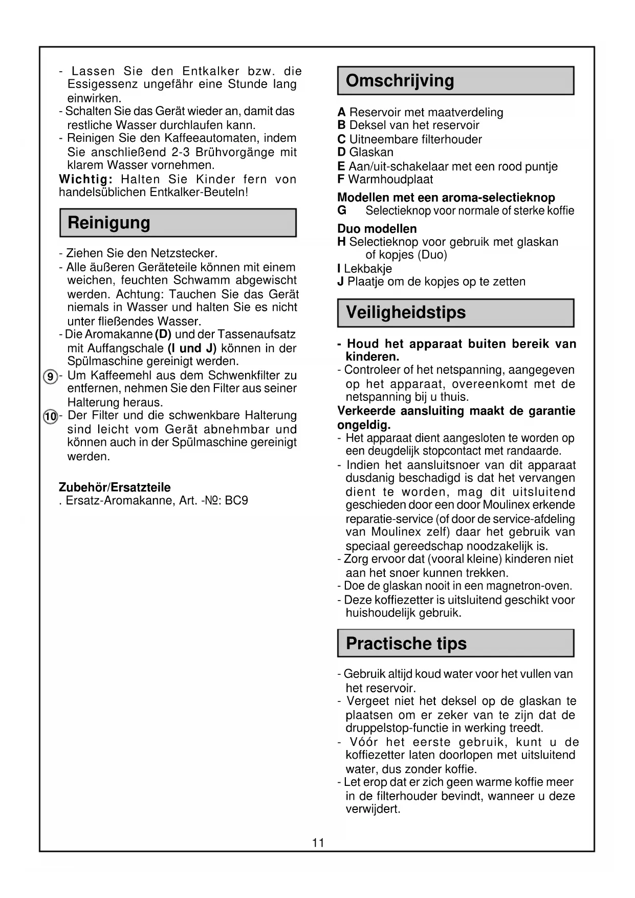 - Laat het mengsel of de azijn doorlopen (tot een hoeveelheid van ca. één kopje) in de glaskan. Zet de koffiezetter dan uit. - Laat de rest van het ontkalkingsmiddel of de azijn vervolgens ongeveer één uur inwerken in de koffiezetter. - Daarna zet u de koffiezetter weer aan totdat de vloeistof helemaal doorgelopen is. - Laat de koffiezetter nog 2 à 3 maal doorlopen met uitsluitend water om alle sporen van azijn of ontkalkingsmiddel te verwijderen. Attentie: houd het ontkalkingsmiddel altijd buiten bereik van kinderen. Schoonmaken - Haal de stekker uit het stopcontact. - Dompel het apparaat nooit onder in water en houd het nooit onder de stromende kraan. - De glaskan (D) en het Duo-plateau (I en J) zijn vaatwasmachinebestendig. - Om een (gebruikt) papieren filterzakje te verwijderen, kunt u de gehele filterhouder uitnemen. - De gehele filterhouder kan gedemonteerd worden en grondig schoongemaakt worden of afgewassen worden in de vaatwasma- chine. Accessoire . Vervangende glaskan: BC9