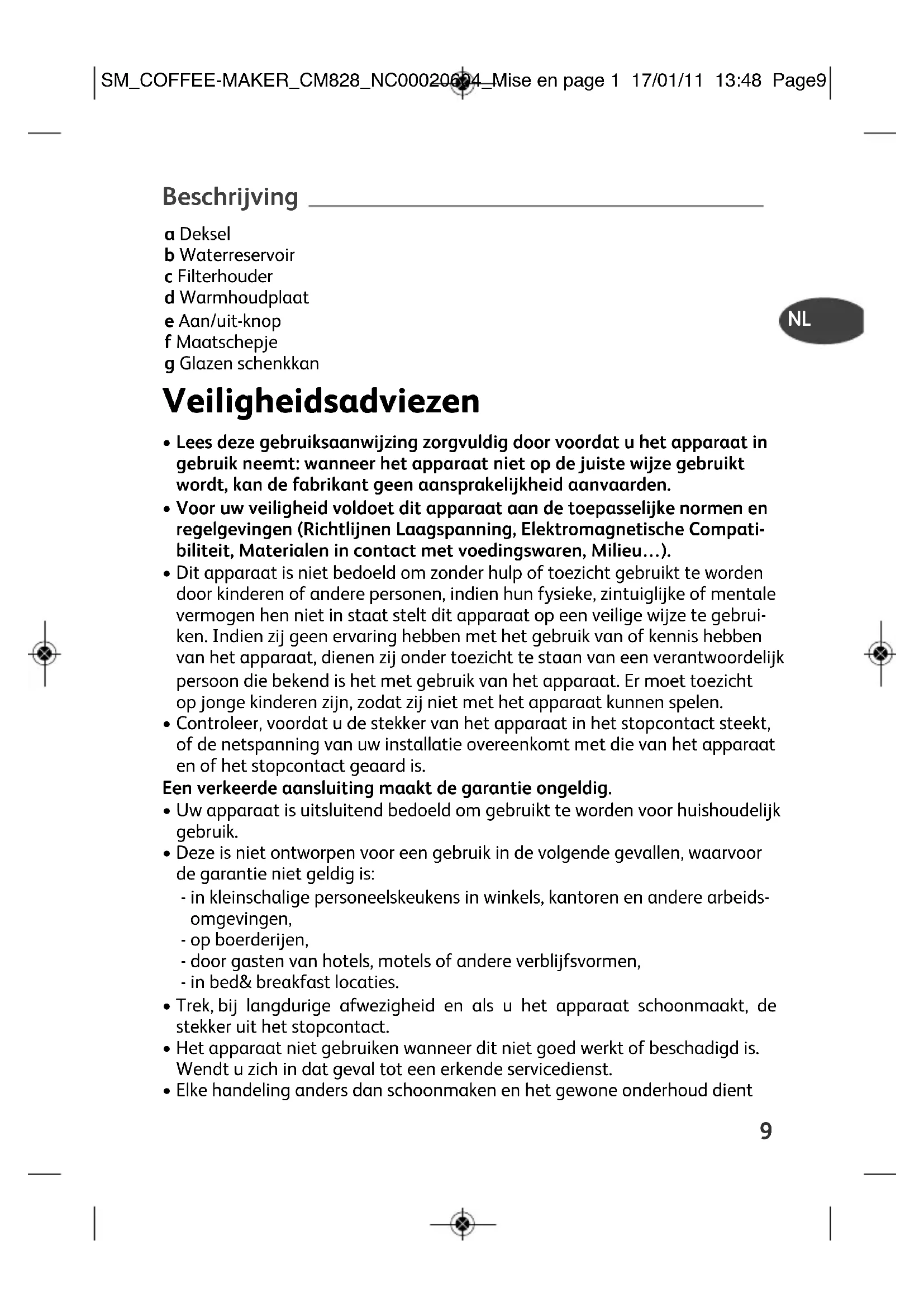 Beschrijving a Deksel b Waterreservoir c Filterhouder d Warmhoudplaat e Aan/uit-knop f Maatschepje g Glazen schenkkan Veiligheidsadviezen