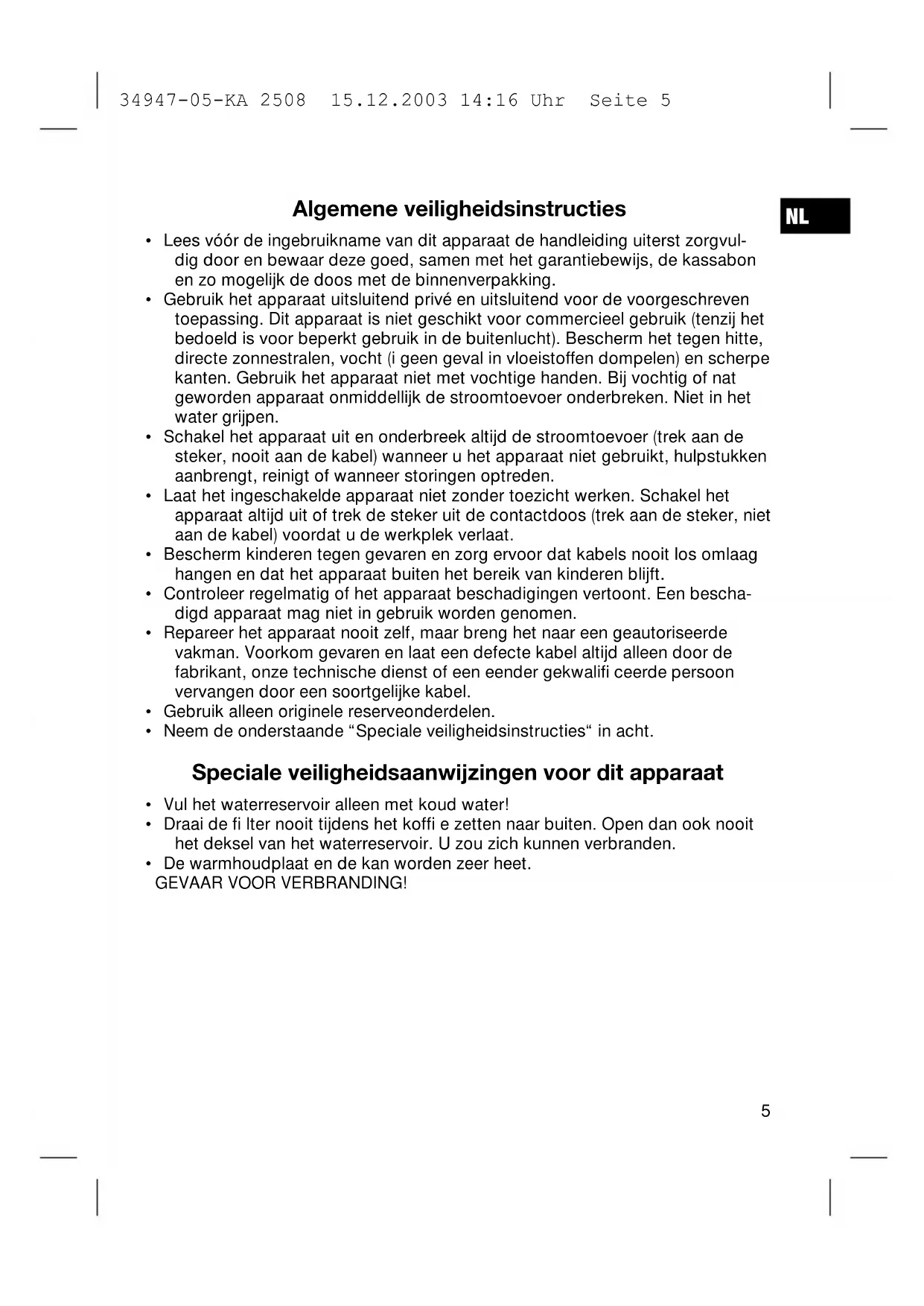 - De warmhoudplaat en de kan worden zeer heet. GEVAAR VOOR VERBRANDING! 34947-05-KA 2508 15.12.2003 14:16 Uhr Seite 5Inbedrijfstelling van het apparaat