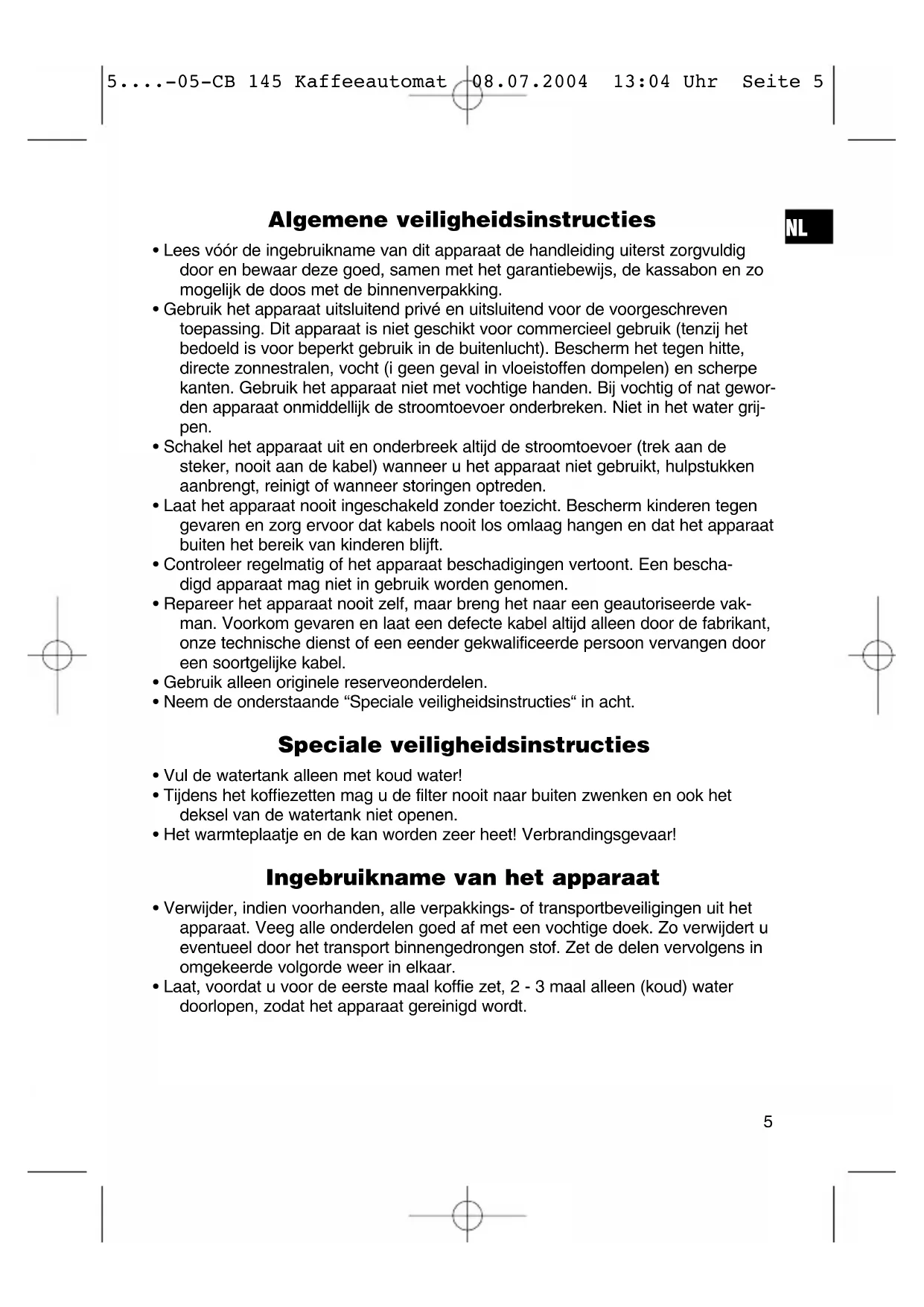 5....-05-CB 145 Kaffeeautomat 08.07.2004 13:04 Uhr Seite 6Dit apparaat is in overeenstemming met de CE-richtlijnen t.a.v. ontstoring en lage volt-veiligheid en is geconstrueerd conform de allerlaatste veiligheidstechnische voorschriften. Garantie Wij verlenen op het door ons verkochte apparaat een garantie van 24 maanden vanaf koopdatum (kassabon). Gedurende de garantieperiode verhelpen wij defecten aan het apparaat kosteloos door middel van reparatie of vervanging, voor zover deze defecten voortvloeien uit materiaal- of fabricagefouten. Uw koopbewijs is tevens het garantiebewijs. Zonder dit bewijs kan geen kosteloze reparatie of vervanging plaatsvinden. In geval van garantieverlening dient u het complete apparaat in de originele verpak- king samen met de kassabon bij uw handelaar af te geven. Glasbreuk of defecten aan accessoires leiden niet tot vervanging van het apparaat, maar worden kosteloos als vervanging toegezonden. In dit geval niet het apparaat opsturen, maar alleen het defecte accessoire bestellen! Reiniging, onderhoud en/of vervanging van slijtende delen vallen niet onder de garantiebepalingen en worden dus in rekening gesteld. De garantie vervalt bij eigenhandige reparaties of ingrepen. Na de garantieperiode Na afloop van de garantieperiode kunnen reparaties tegen berekening worden uit- gevoerd door de desbetreffende vakhandel of reparatieservice.