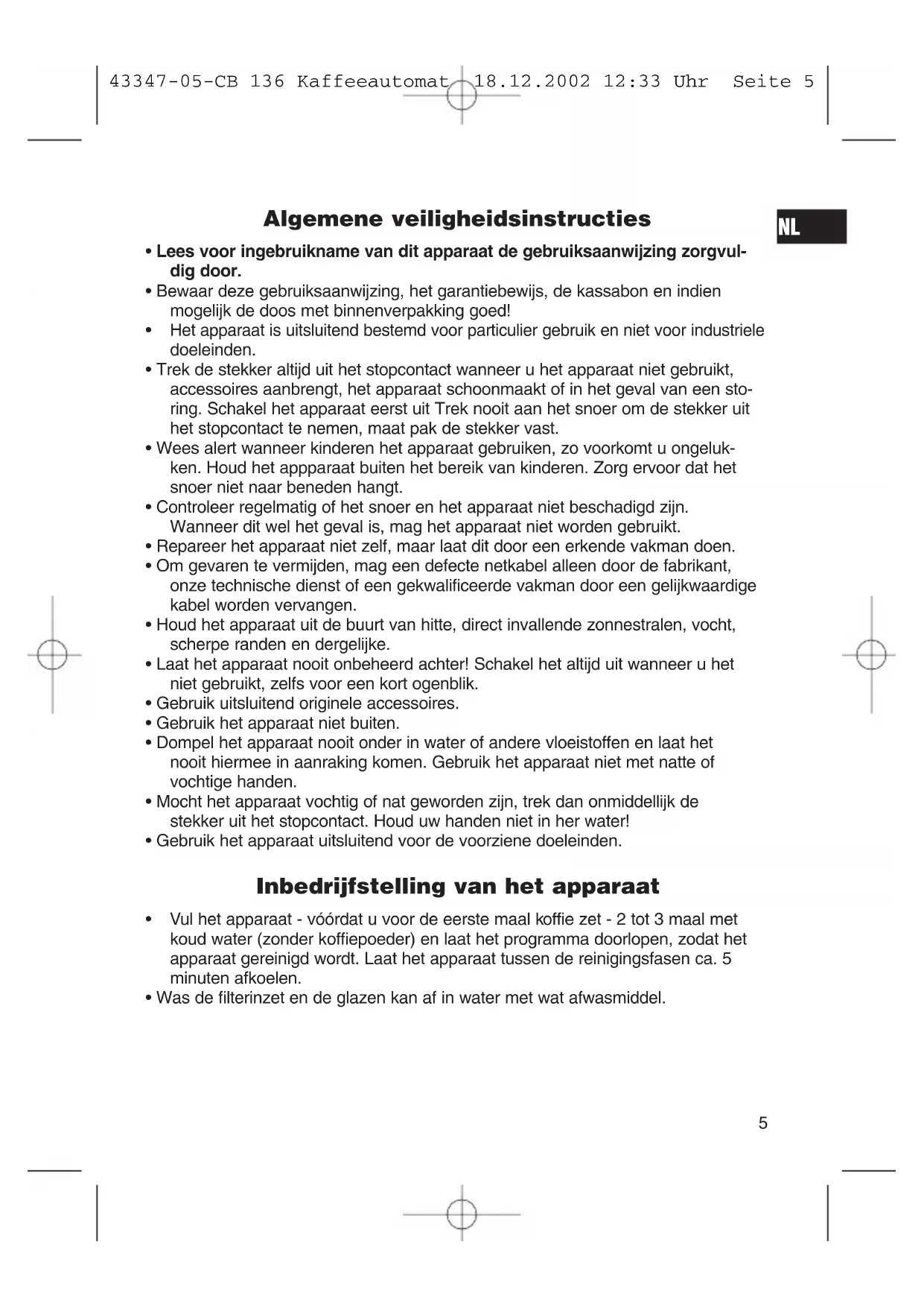 43347-05-CB 136 Kaffeeautomat 18.12.2002 12:33 Uhr Seite 6Dit apparaat is in overeenstemming met de CE-richtlijnen t.a.v. ontstoring en lage volt-veiligheid en is geconstrueerd conform de allerlaatste veiligheidstechnische voorschriften. Garantie Wij verlenen op het door ons verkochte apparaat een garantie van 24 maanden vanaf koopdatum (kassabon). Gedurende de garantieperiode verhelpen wij defecten aan het apparaat kosteloos door middel van reparatie of vervanging, voor zover deze defecten voortvloeien uit materiaal- of fabricagefouten. Uw koopbewijs is tevens het garantiebewijs. Zonder dit bewijs kan geen kosteloze reparatie of vervanging plaatsvinden. In geval van garantieverlening dient u het complete apparaat in de originele verpak- king samen met de kassabon bij uw handelaar af te geven. Glasbreuk of defecten aan accessoires leiden niet tot vervanging van het apparaat, maar worden kosteloos als vervanging toegezonden. In dit geval niet het apparaat opsturen, maar alleen het defecte accessoire bestellen! Reiniging, onderhoud en/of vervanging van slijtende delen vallen niet onder de garantiebepalingen en worden dus in rekening gesteld. De garantie vervalt bij eigenhandige reparaties of ingrepen. Na de garantieperiode Na afloop van de garantieperiode kunnen reparaties tegen berekening worden uit- gevoerd door de desbetreffende vakhandel of reparatieservice.