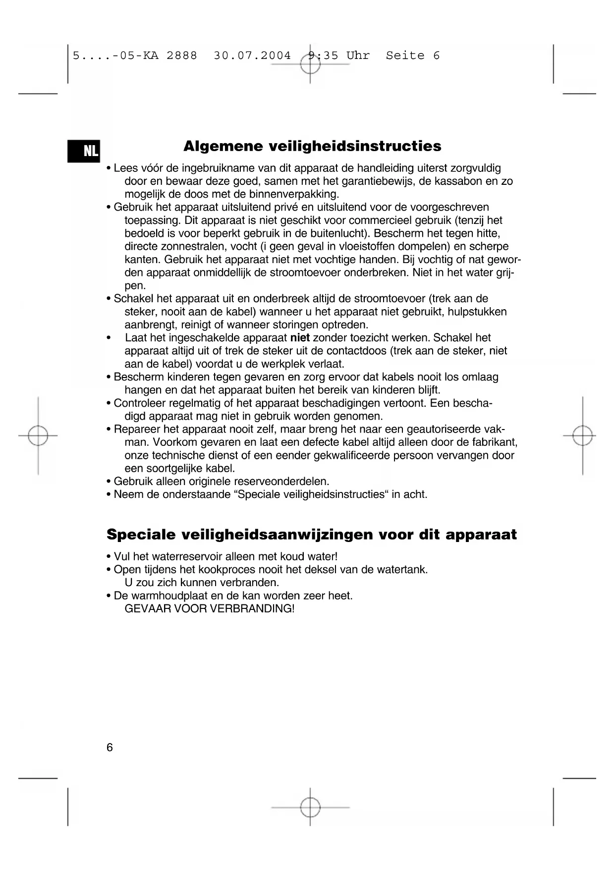 5....-05-KA 2888 30.07.2004 9:35 Uhr Seite 8Dit apparaat is gekeurd conform de op dit moment van toepassing zijnde CE- richtlijnen zoals bijvoorbeeld elektromagnetische compatibiliteit en laagspannings- voorschriften en is geconstrueerd volgens de nieuwste veiligheidstechnische voor- schriften. Technische wijzigingen voorbehouden! Garantie Voor het door ons geleverde apparaat verlenen wij een garantie van 24 maanden vanaf koopdatum (kassabon). Eventuele gebreken aan het apparaat of aan het toebehoren*) die zijn ontstaan door productie- of materiaalfouten verhelpen wij binnen deze periode kosteloos door middel van reparatie of, naar ons oordeel, door vervanging. Eventuele garan- tiegevallen verlengen noch de geldigheidsduur van de garantie, noch begint daar- door een nieuwe garantieperiode! Het koopbewijs geldt als garantiebewijs. Zonder dit bewijs kan geen kosteloze reparatie of vervanging plaatsvinden. Geef in garantiegevallen het complete apparaat in de originele verpakking samen met de kassabon af bij uw handelaar. *) Schade aan onderdelen leidt niet automatisch tot kosteloze vervanging van het complete apparaat. Neem in dit geval contact op met onze hotline! De reparatie van glasbreuk of breuk van kunststofonderdelen wordt altijd berekend! Niet defecten aan de hulpstukken of aan de slijtende onderdelen (bijv. koolborstels, deeghaken, drijfriemen, reserveafstandsbediening, reservetandenborstels, zaag- bladen enz.), maar ook reiniging, onderhoud of de vervanging van slijtende delen vallen niet onder de garantie en geschieden altijd tegen berekening! Bij ingrepen door derden komt de garantieverlening te vervallen. Na de garantieperiode Na afloop van de garantieperiode kunnen reparaties tegen berekening worden uit- gevoerd door de betreffende vakhandelaar of de technische dienst.