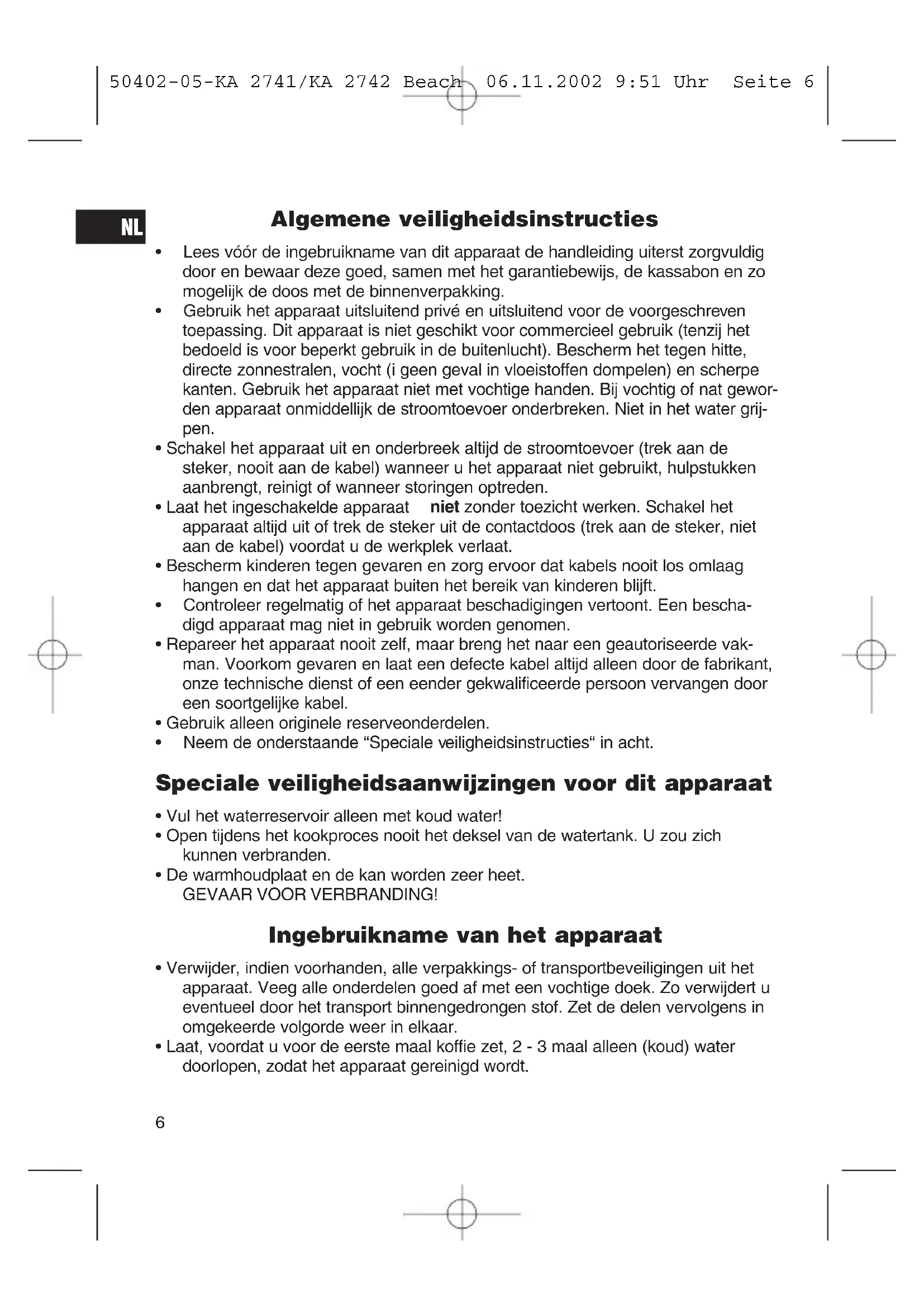 - De warmhoudplaat en de kan worden zeer heet. GEVAAR VOOR VERBRANDING! Ingebruikname van het apparaat