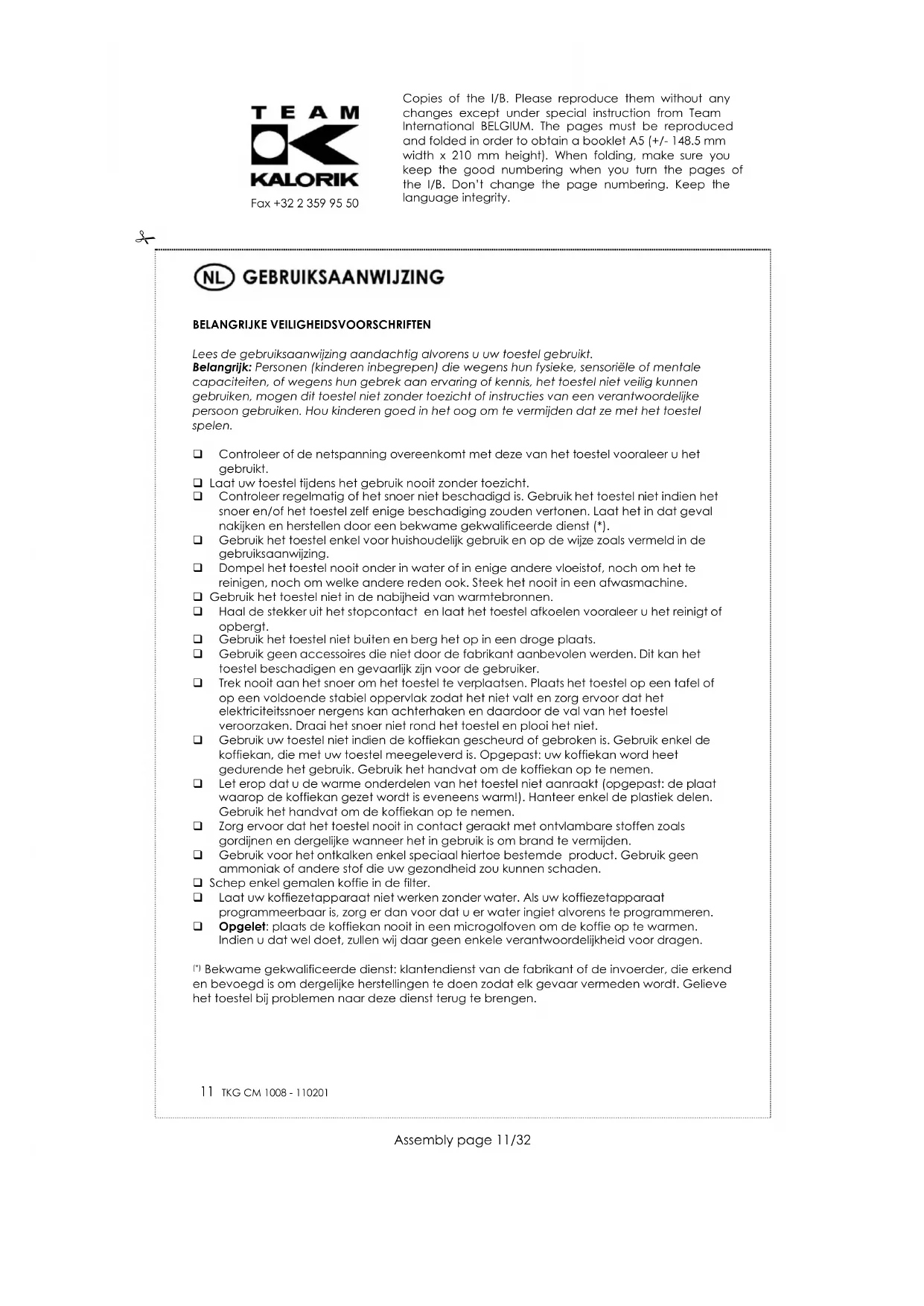 Schakel voor de reiniging het toestel uit, trek de stekker uit het stopcontact en laat het apparaat afkoelen. De filter, de filterhouder, de kan en het deksel van de kan kunt u reinigen in een warme sop. Gebruik een vochtige doek om de behuizing te reinigen. Dompel het toestel nooit onder in water of in enige andere vloeistof. Gebruik geen schuurmiddelen. Wij raden U aan het apparaat regelmatig te ontkalken. Dit verlengt de levensduur van het apparaat. Gebruik hiervoor de in de handel zijnde ontkalkingmiddelen. Plaats geen enkel onderdeel van uw koffiezetapparaat in de vaatwasmachine. Reinig de koffiekan in een warme sop. Als het water in uw streek hard is, ontkalk dan uw koffiezetapparaat om de 7 tot 10 beurten als volgt: Giet 3 kopjes zuivere azijn in het waterreservoir en vul het waterreservoir tot aan de aanduiding van het maximumpeil met water. Zet de kan op de warmhoudplaat. Steek de stekker in het stopcontact en druk op de “power”-knop. Wanneer het waterreservoir leeggelopen is, schakel dan het apparaat uit en giet de kan leeg. Spoel het apparaat op deze manier twee of drie keer met koud water. Copies of the I/B. Please reproduce them without any changes except under special instruction from Team International BELGIUM. The pages must be reproduced and folded in order to obtain a booklet A5 (+/- 148.5 mm width x 210 mm height). When folding, make sure you keep the good numbering when you turn the pages of the I/B. Don’t change the page numbering. Keep the language integrity.