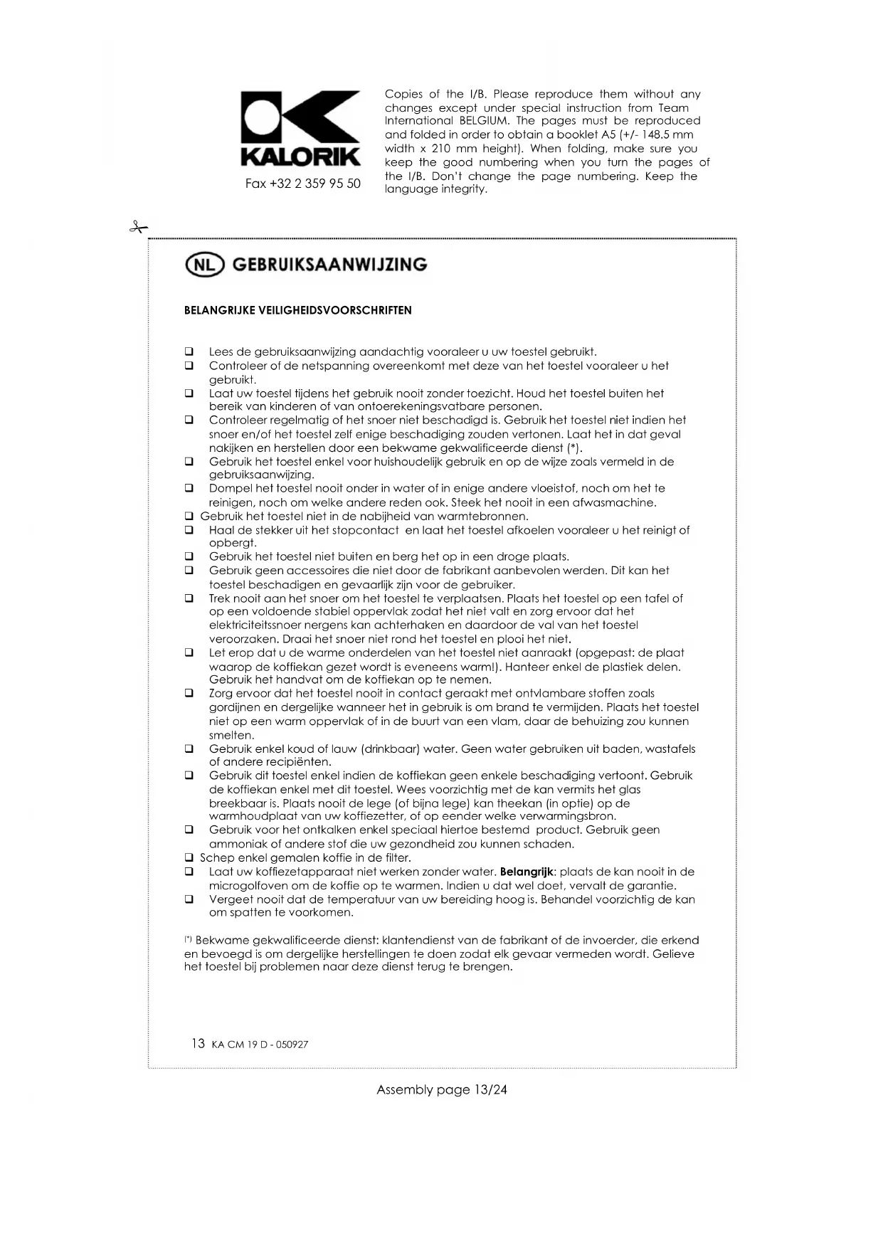 Om ons milieu en onze gezondheid te beschermen, moet afgedankte elektrische en elektronische apparatuur in overeenstemming met welbepaalde regels weggegooid worden. Dit vergt zowel de inzet van de leveranciers als van de gebruikers. Om deze reden mag uw apparaat, zoals op het typeplaatje aangegeven door het symbool , niet met het gewone huisvuil weggegooid worden, maar moet het ofwel naar de verkoper teruggestuurd worden, ofwel naar een centrum van gescheiden inzameling waar het hergebruikt, gerecycleerd op voor andere doeleinden gebruikt zal worden. Copies of the I/B. Please reproduce them without any changes except under special instruction from Team International BELGIUM. The pages must be reproduced and folded in order to obtain a booklet A5 (+/- 148.5 mm width x 210 mm height). When folding, make sure you keep the good numbering when you turn the pages of the I/B. Don’t change the page numbering. Keep the language integrity. 16 KA CM 19 D - 050927
