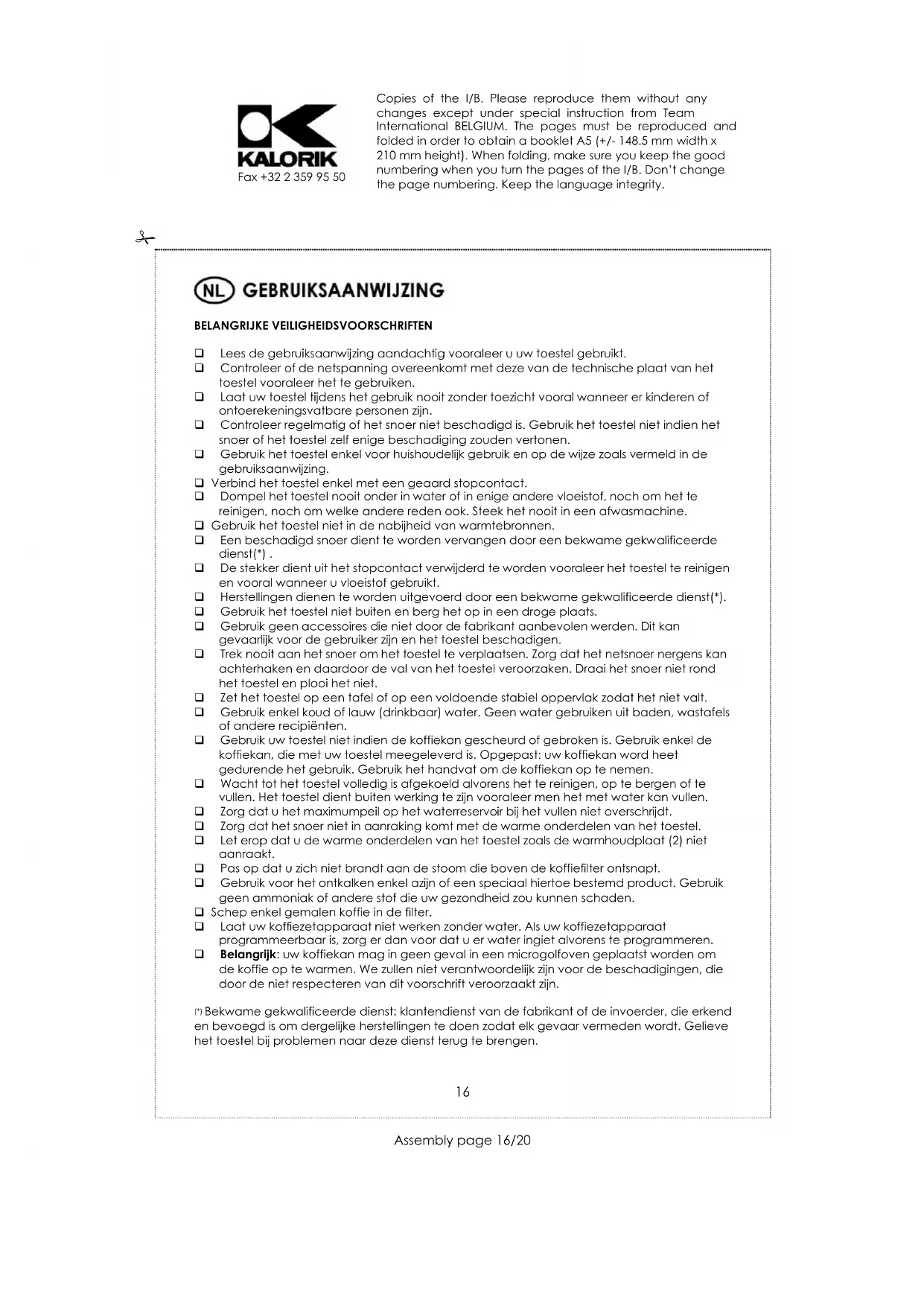 Wij raden U aan het apparaat regelmatig te ontkalken. Dit verlengt de levensduur van het apparaat. Om de frequentie van het ontkalken te bepalen, controleer de hardheid van uw water, wat betekent zijn mineraalgehalte. Gebruik hiervoor de in de handel zijnde ontkalkingmiddelen. We zullen niet verantwoordelijk zijn voor de herstellingen die met een slechte onderhoud van uw toestel verbonden zijn. Gebruik geen vaatwasmachine om de kan te reinigen. Reinig de plastiek delen met een vochtige doek. Copies of the I/B. Please reproduce them without any changes except under special instruction from Team International BELGIUM. The pages must be reproduced and folded in order to obtain a booklet A5 (+/- 148.5 mm width x 210 mm height). When folding, make sure you keep the good numbering when you turn the pages of the I/B. Don‟t change the page numbering. Keep the language integrity.