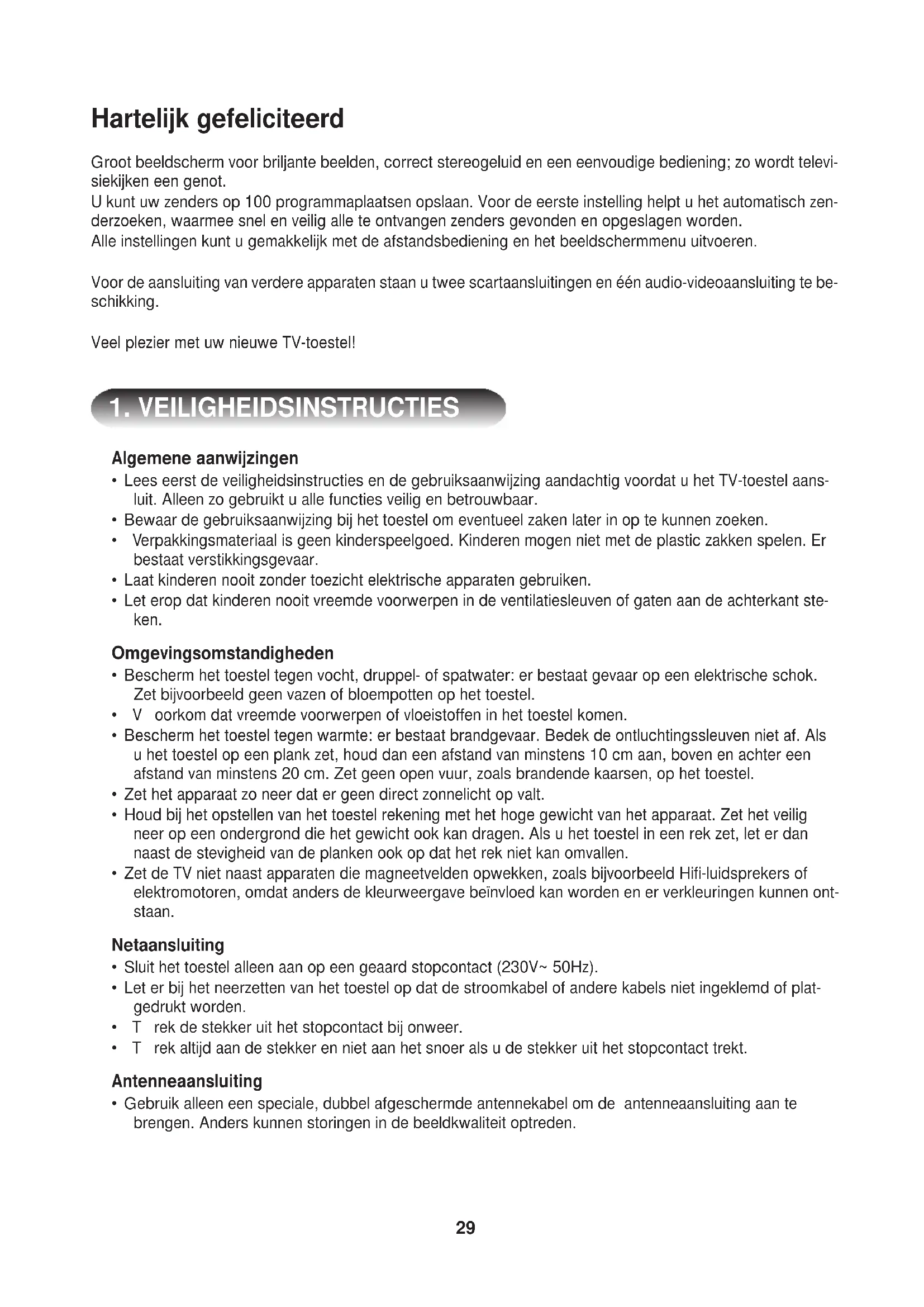 - Lees eerst de veiligheidsinstrumenties en de gebruiksaanwijzing aandachtig voordat u het TV-toestel aansluit. Alleen zo gebruikt u alle functies veilig en betrouwbaar.