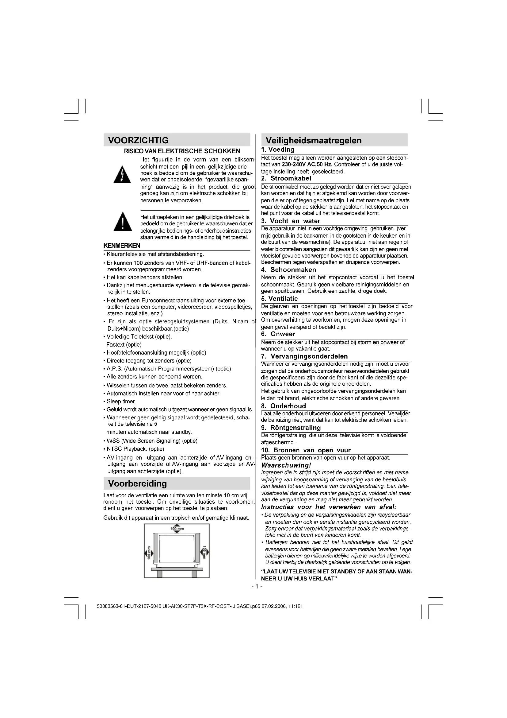 Het figuurtje in de vorm van een bliksem- schicht met een pijl in een gelijkzijdige drie- hoek is bedoeld om de gebruiker te waarschu- wen dat er ongeïsoleerde, gevaarlijke span- ning aanwezig is in het product, die groot genoeg kan zijn om elektrische schokken bij personen te veroorzaken. Het uitroepteken in een gelijkzijdige driehoek is bedoeld om de gebruiker te waarschuwen dat er belangrijke bedienings- of onderhoudsinstructies staan vermeld in de handleiding bij het toestel. KENMERKEN Kleurentelevisie met afstandsbediening. Er kunnen 100 zenders van VHF- of UHF-banden of kabel- zenders voorgeprogrammeerd worden. Het kan kabelzenders afstellen. Dankzij het menugestuurde systeem is de televisie gemak- kelijk in te stellen. Het heeft een Euroconnectoraansluiting voor externe toe- stellen (zoals een computer, videorecorder, videospelletjes, stereo-installatie, enz.) Er zijn als optie stereogeluidsystemen (Duits, Nicam of Duits+Nicam) beschikbaar.(optie) Volledige Teletekst (optie). Fastext (optie) Hoofdtelefoonaansluiting mogelijk (optie) Directe toegang tot zenders (optie) A.P.S. (Automatisch Programmeersysteem) (optie) Alle zenders kunnen benoemd worden. Wisselen tussen de twee laatst bekeken zenders. Automatisch instellen naar voor of naar achter. Sleep timer. Geluid wordt automatisch uitgezet wanneer er geen signaal is. Wanneer er geen geldig signaal wordt gedetecteerd, scha- kelt de televisie na 5 minuten automatisch naar standby. WSS (Wide Screen Signaling) (optie) NTSC Playback. (optie) AV-ingang en -uitgang aan achterzijde of AV-ingang en - uitgang aan voorzijde of AV-ingang aan voorzijde en AV- uitgang aan achterzijde (optie). Voorbereiding Laat voor de ventilatie een ruimte van ten minste 10 cm vrij rondom het toestel. Om onveilige situaties te voorkomen, dient u geen voorwerpen op het toestel te plaatsen. Gebruik dit apparaat in een tropisch en/of gematigd klimaat. Veiligheidsmaatregelen