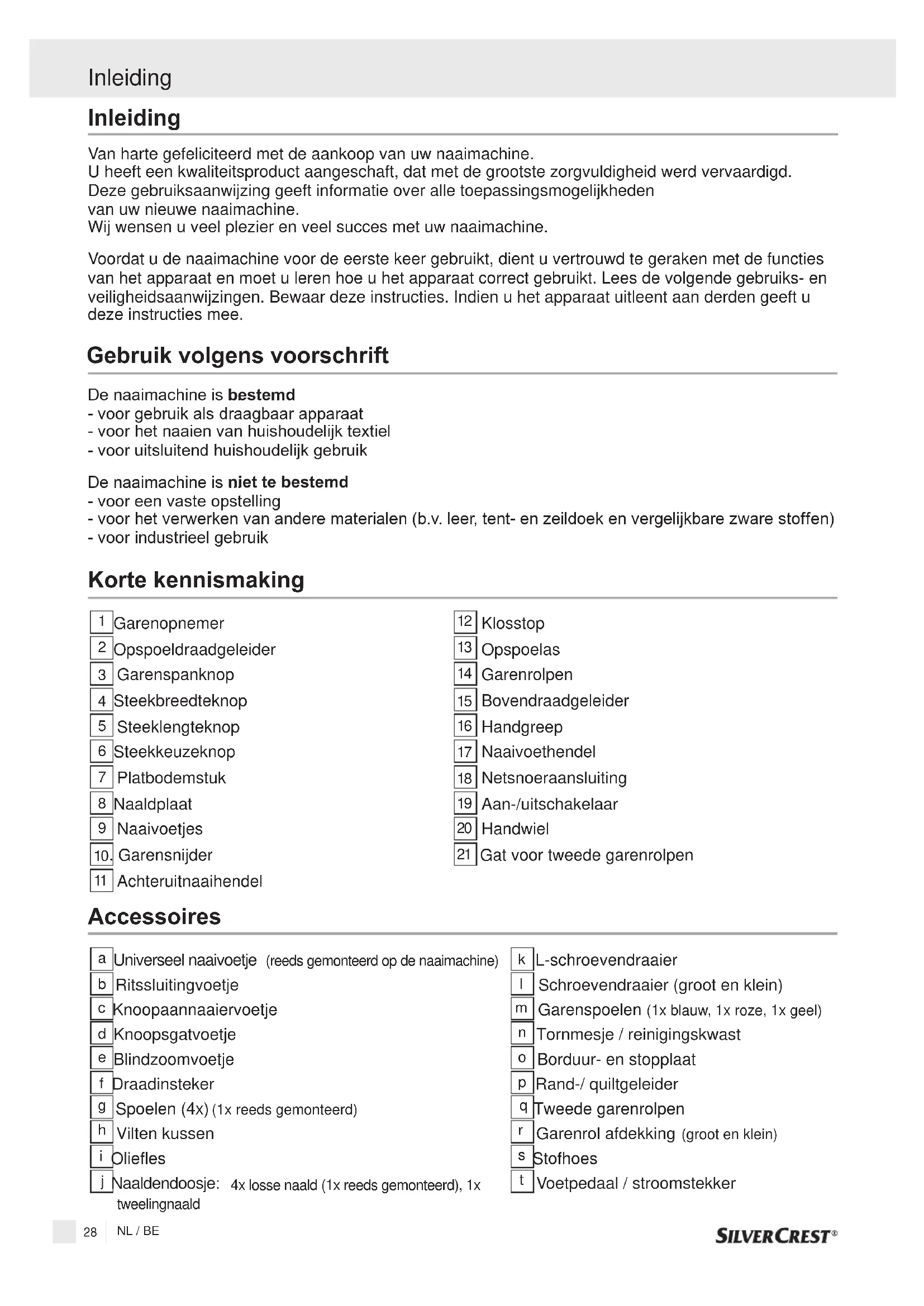 Gebruik volgens voorschrift NL / BE29 Inleiding Technische gegevens Nominale spanning Nominaal vermogen Afmetingen Lengte van snoer Gewicht Materiaal Bedieningselementen Weergave-elementen Grijpersysteem Naaldsysteem Radio-ontstoord TÜV gekeurd Productgarantie Klasse