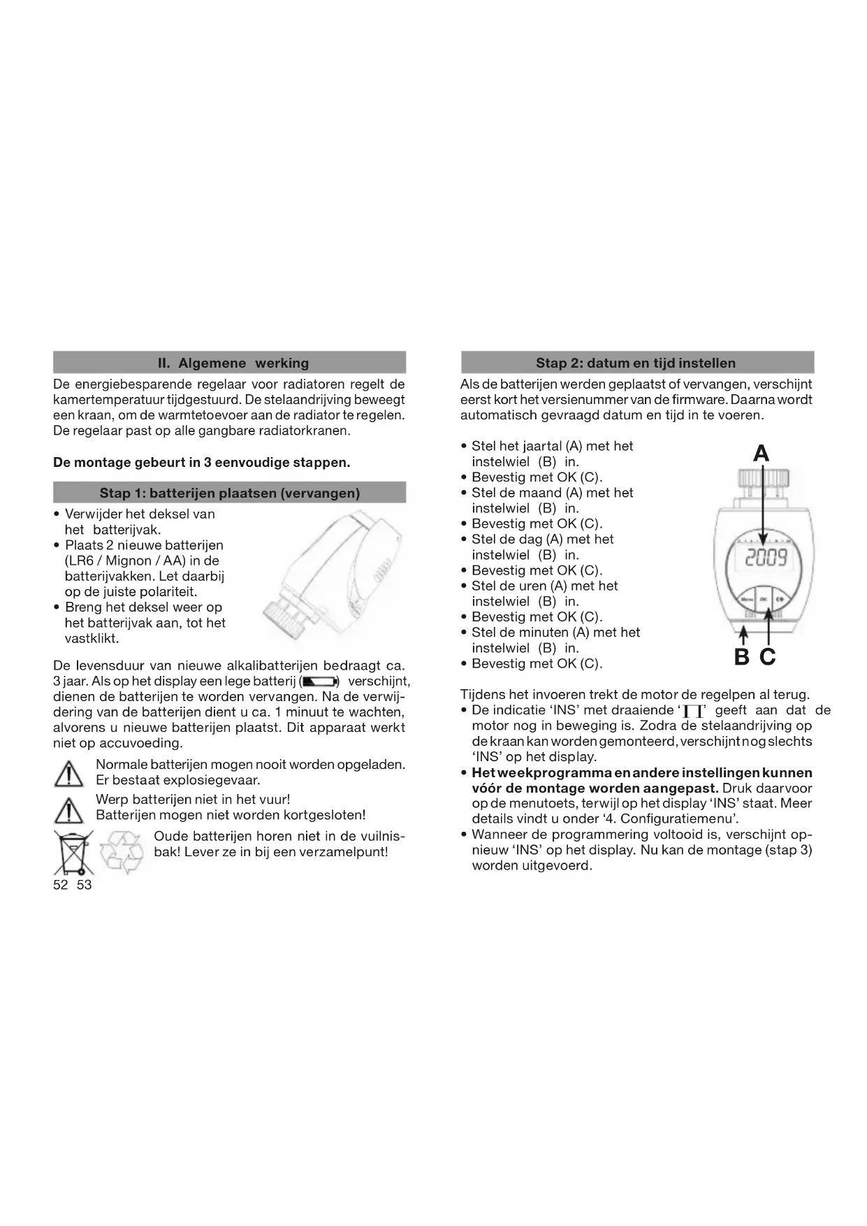 De energiebesparende regelaar voor radiatoren regelt de kamertemperatuur tijdgestuurd. De stelaandrijving beweegt een kraan, om de warmtetoevoer aan de radiator te regelen. De regelaar past op alle gangbare radiatorkranen. De montage gebeurt in 3 eenvoudige stappen. Stap 1: batterijen plaatsen (vervangen)